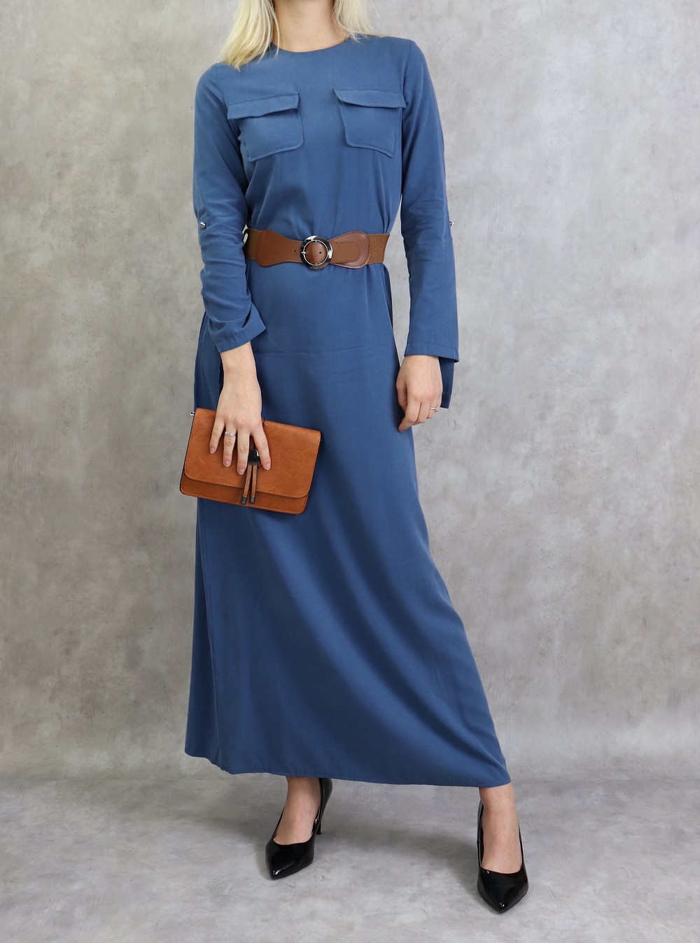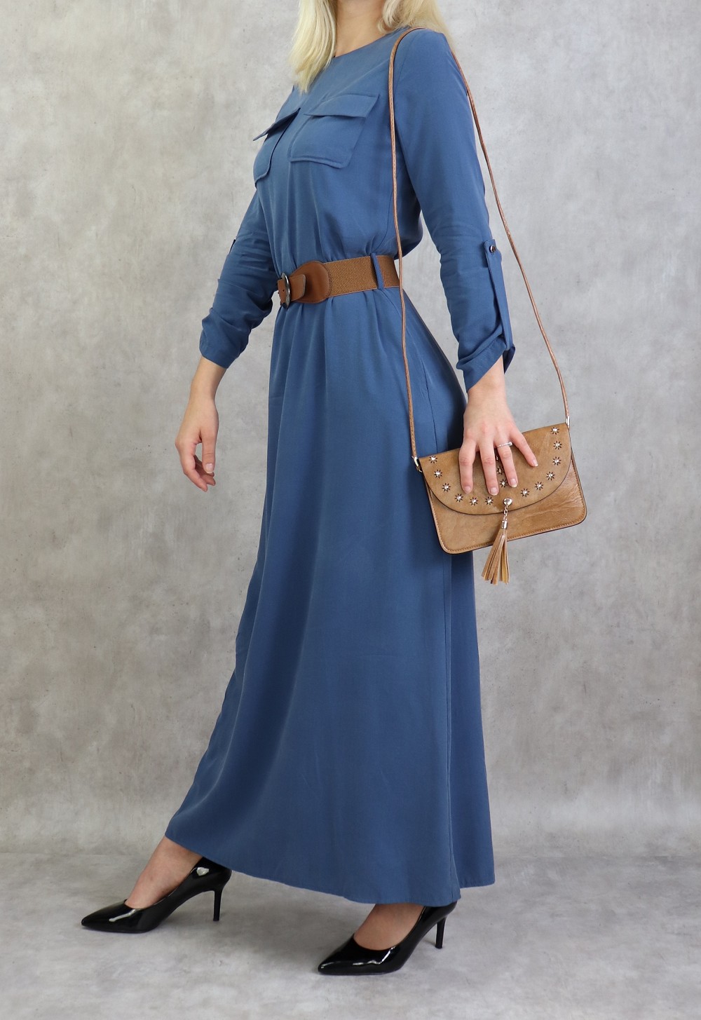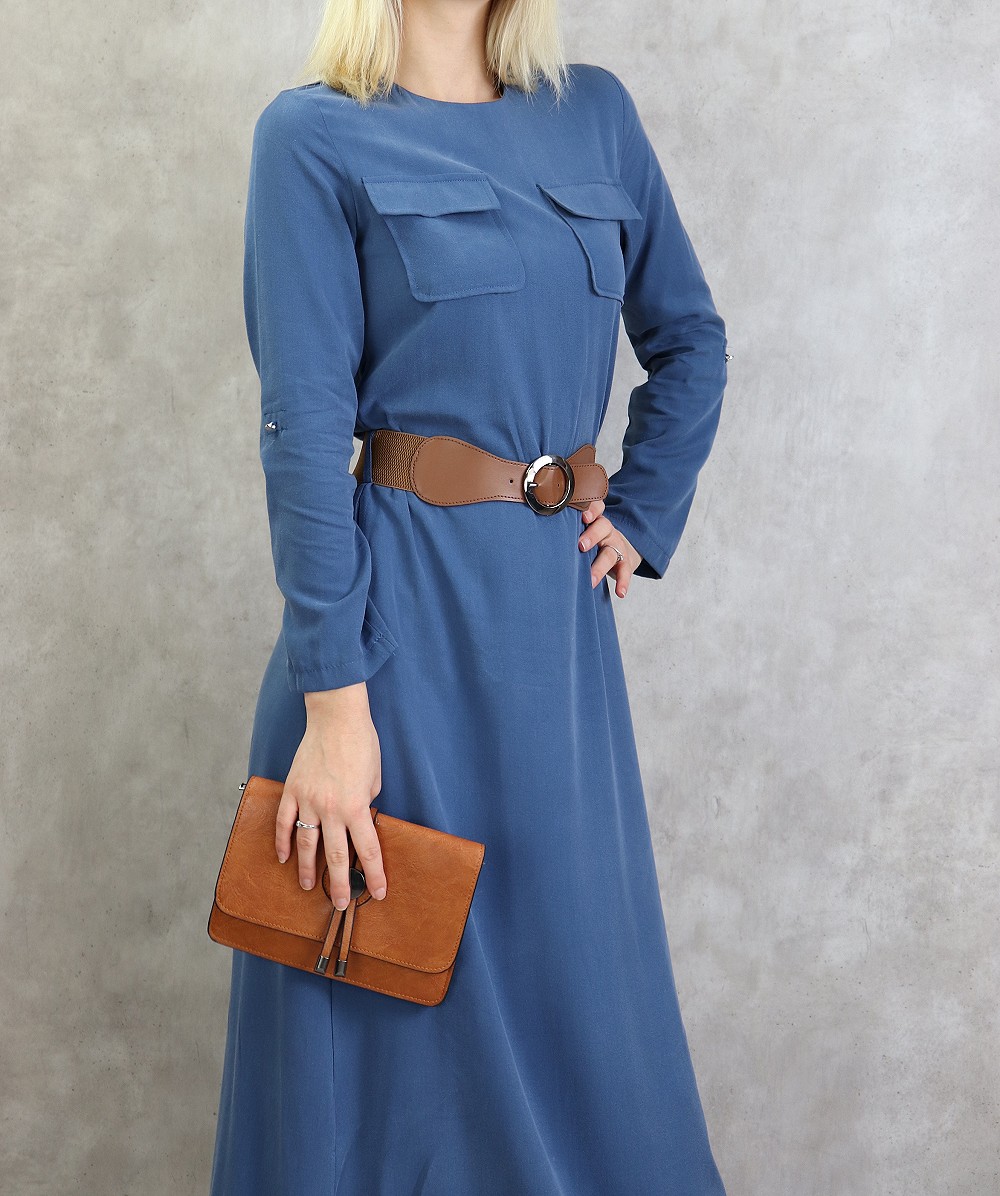 Robe longue evasee avec poches et ceinture marron - Couleur Bleu