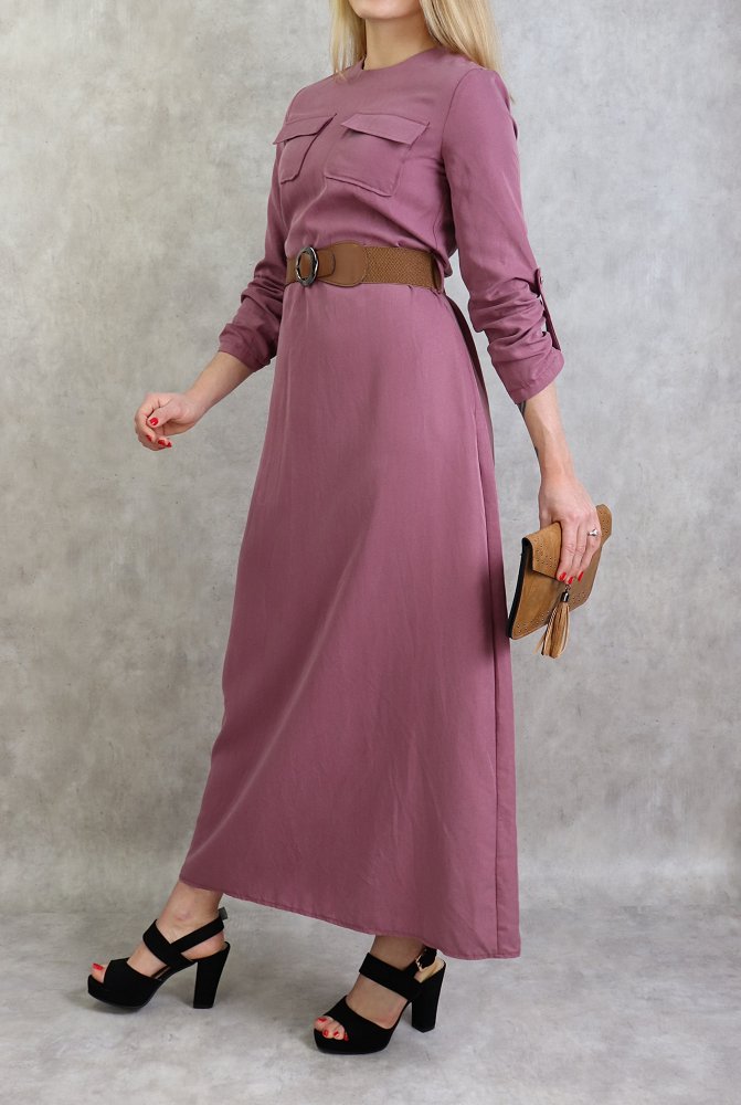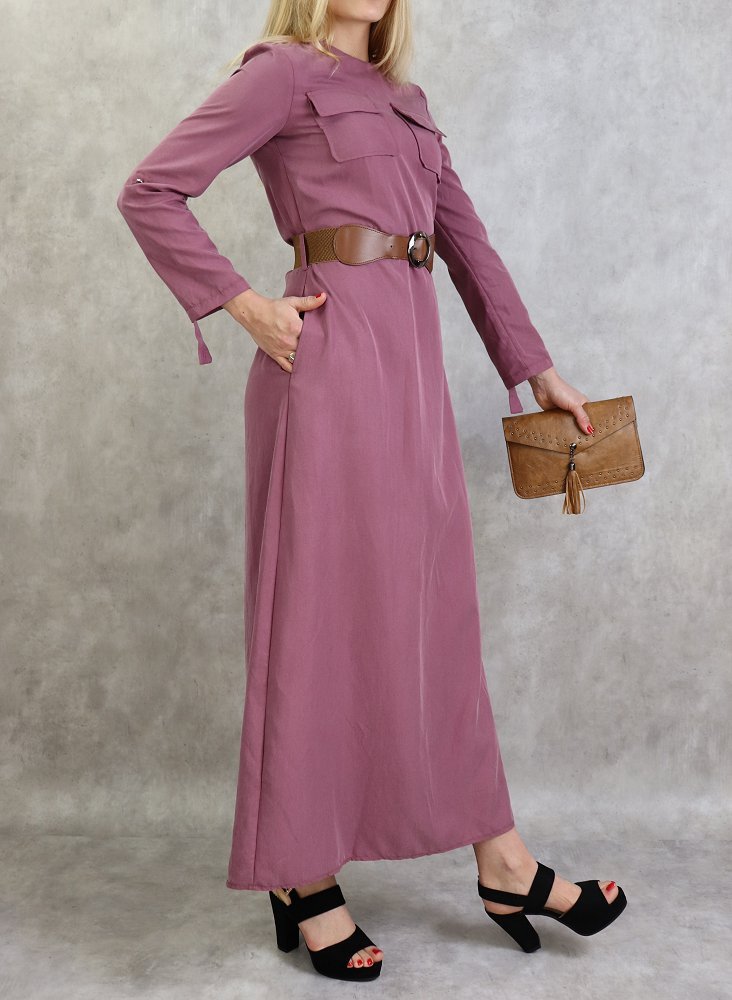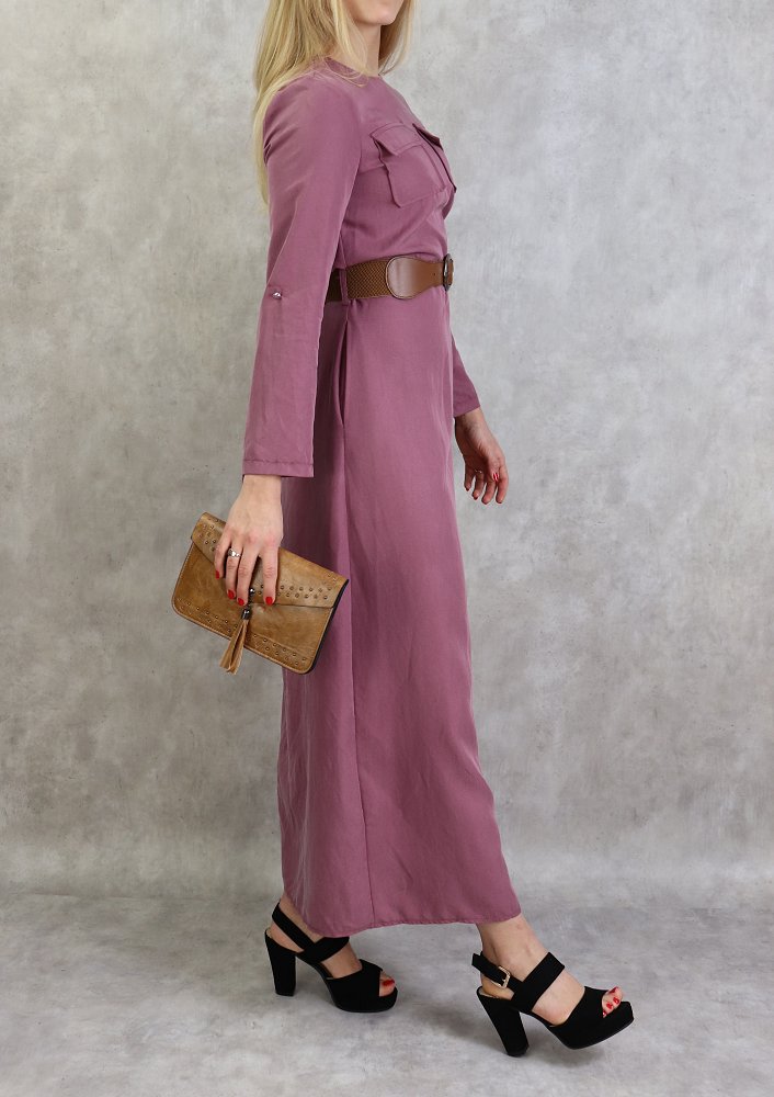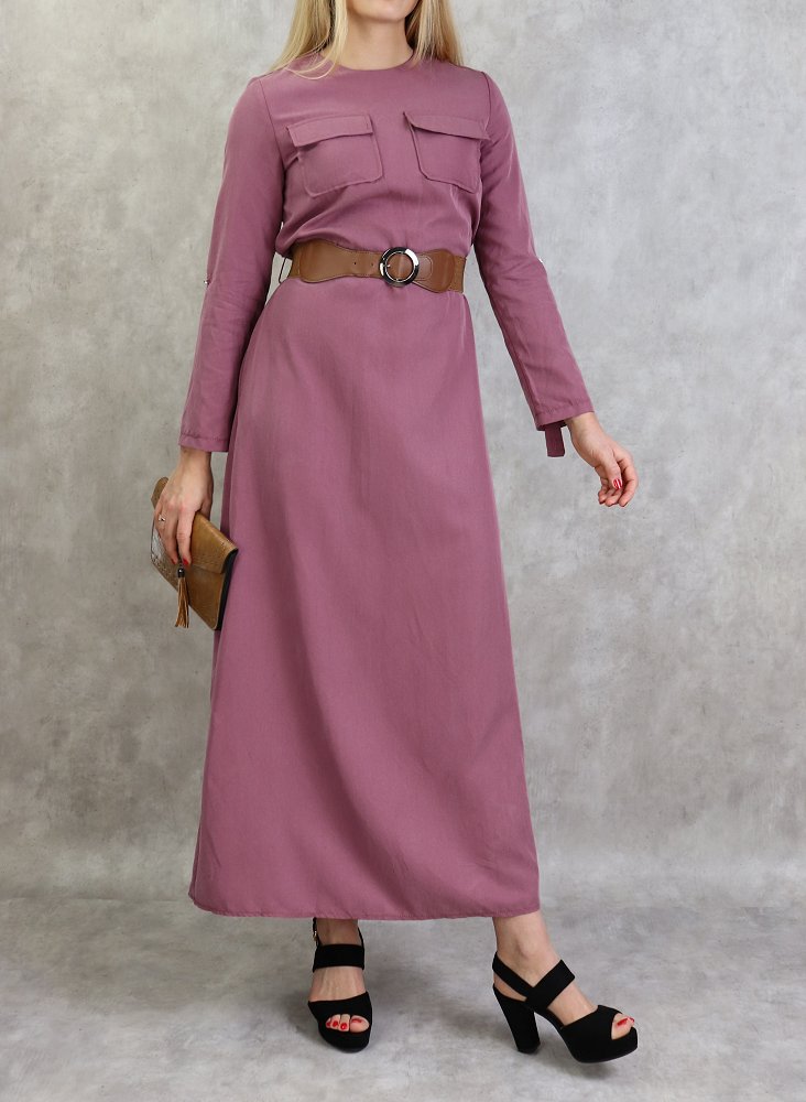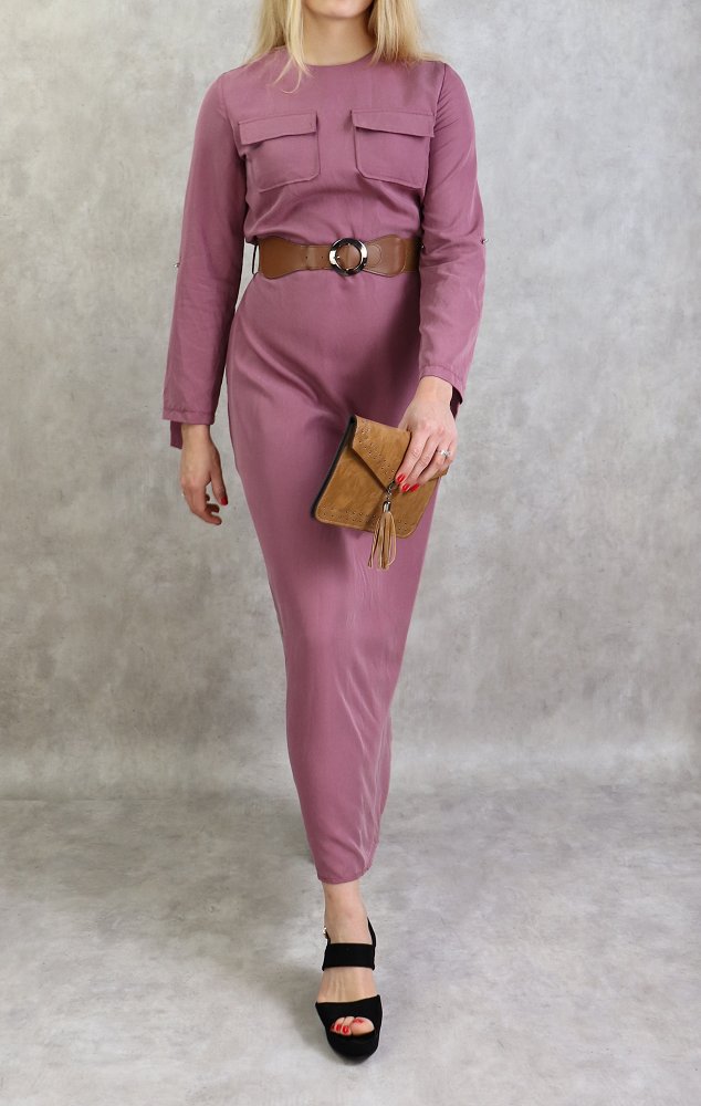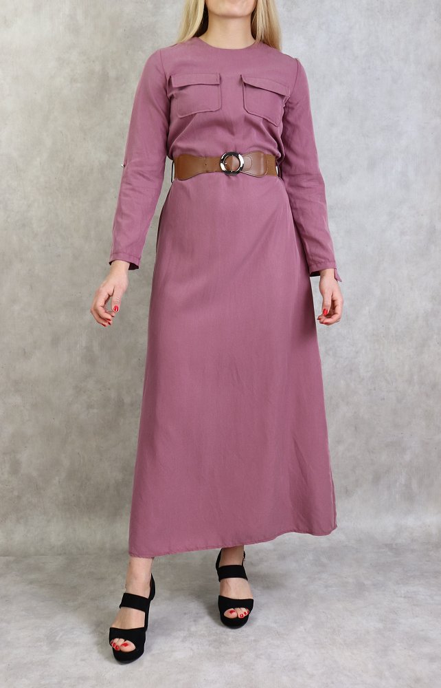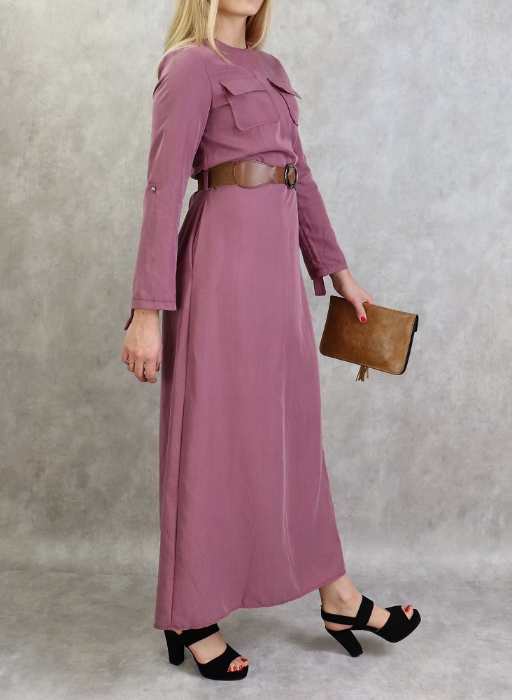 Robe longue evasee avec poches et ceinture marron - Couleur Mauve