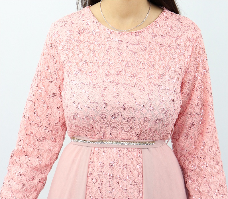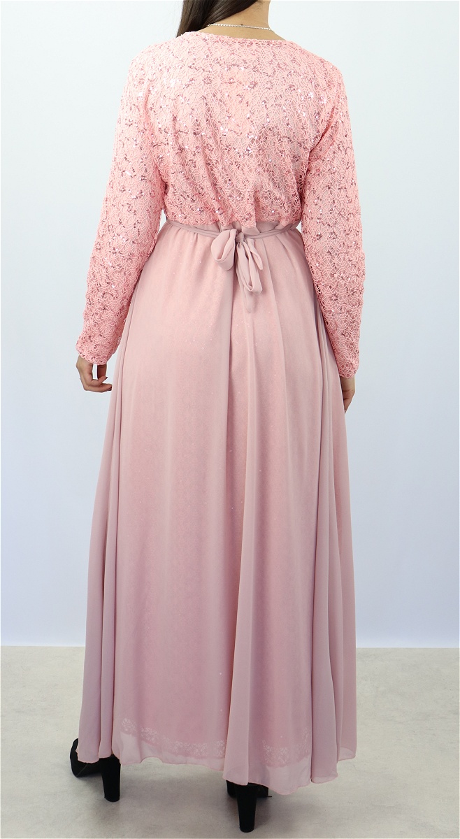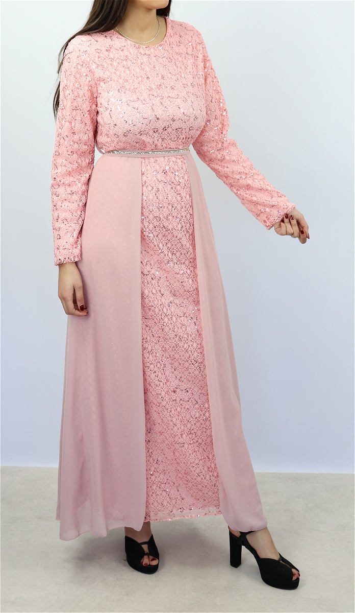 Magnifique robe longue évasée, doublée et pailletée de couleur rose clair. Très élégante avec sa ceinture assortie décorée de strass argentés et de chaines dorées.