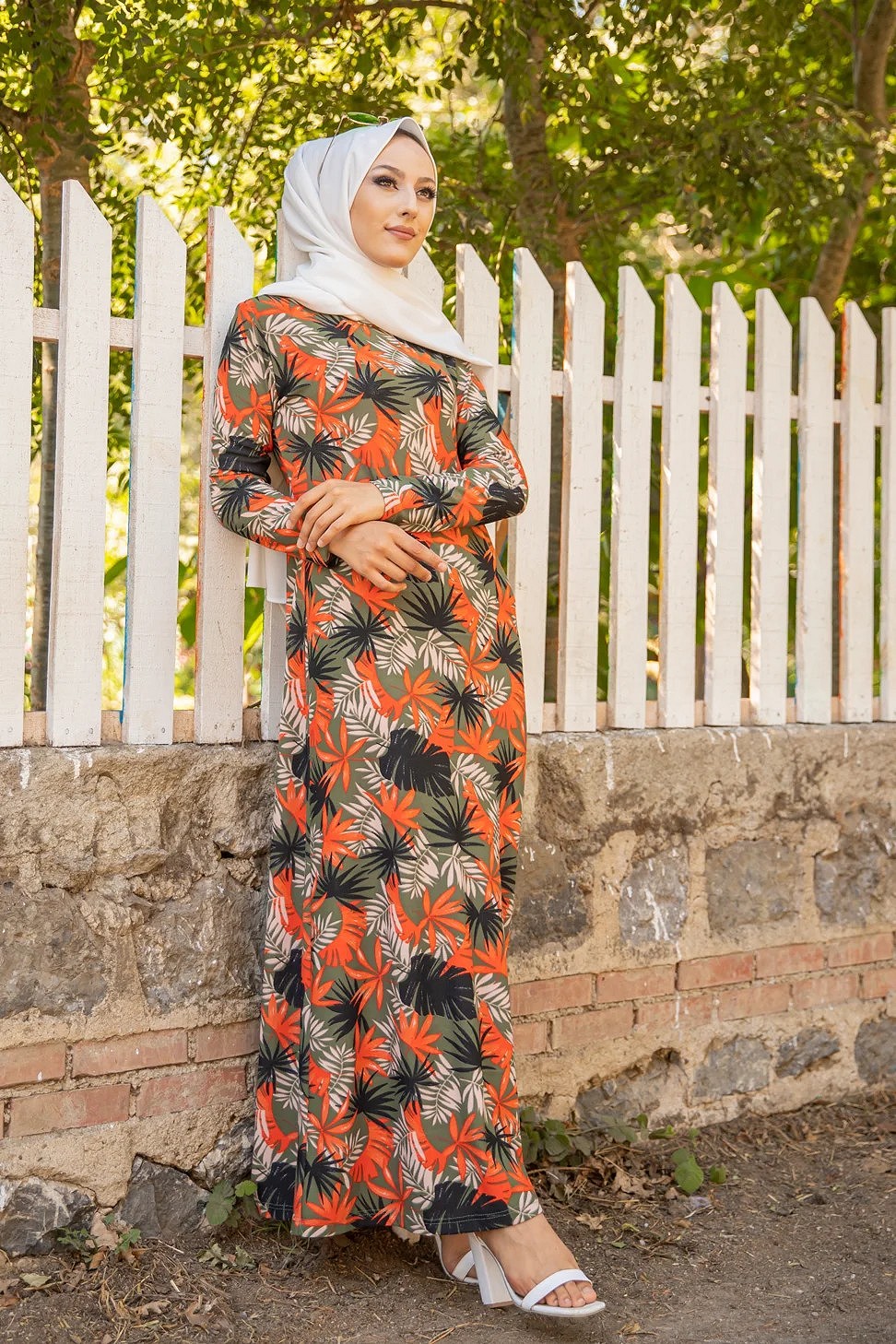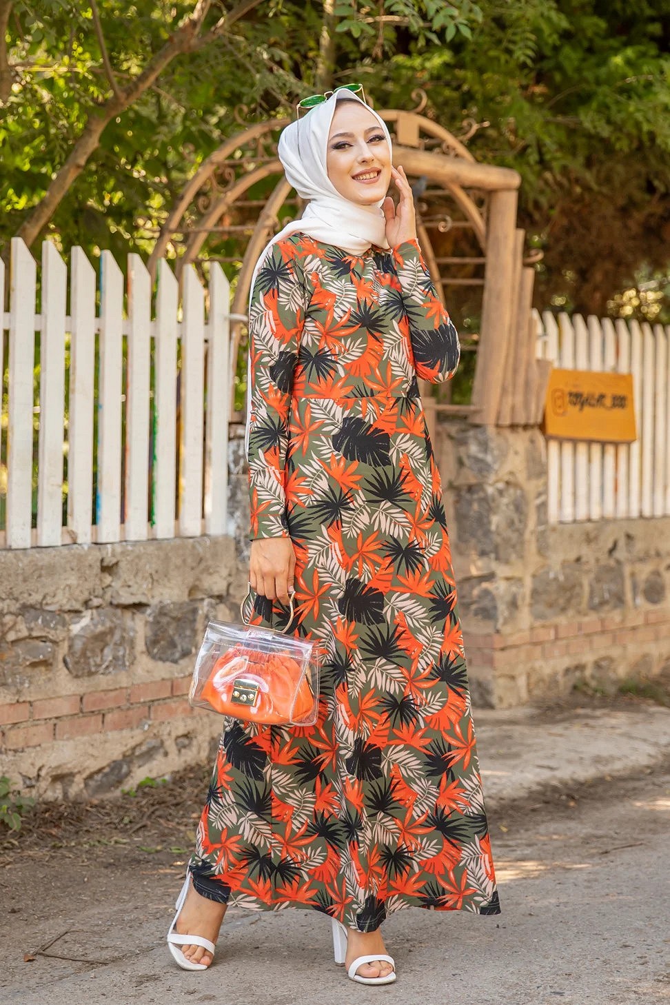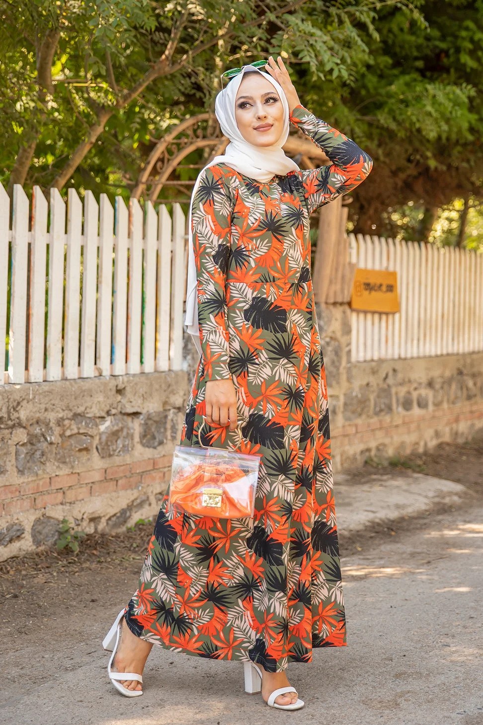 Robe longue fleurie coupe evasee pour femme (Mode Musulmane) - Couleur motifs kaki et orange