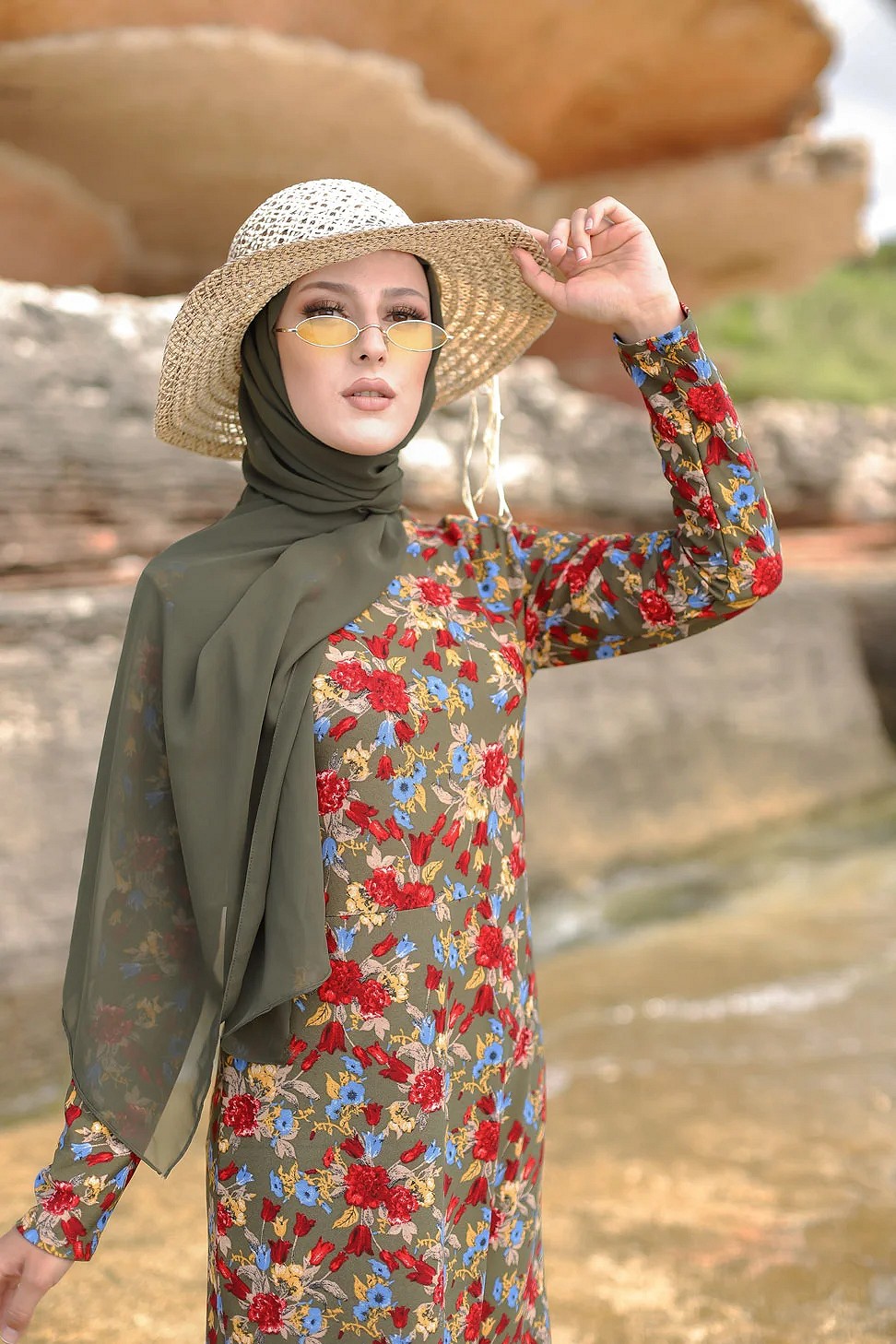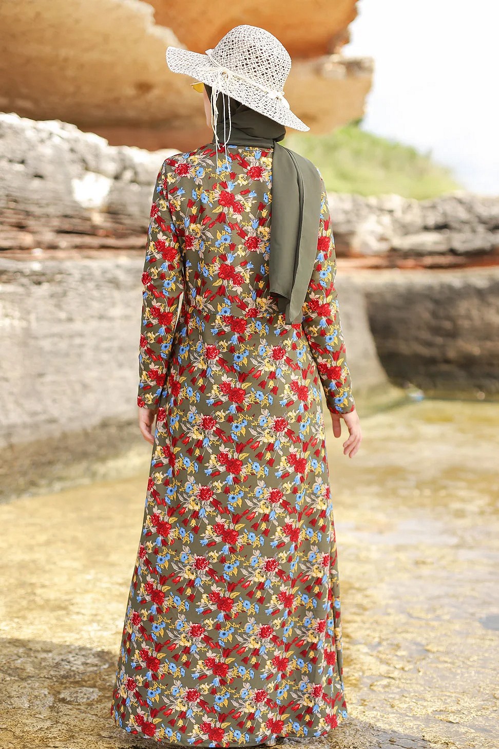Robe longue fleurie sur un fond de couleur Kaki pour femme voilee (Boutique en ligne Modeste fashion France)