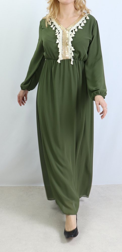 Très belle robe longue, entièrement doublée, col en V, ornée avec pompons et strass, taille élastiquée, manches longues poignets élastiques. Tissu de type mousseline.