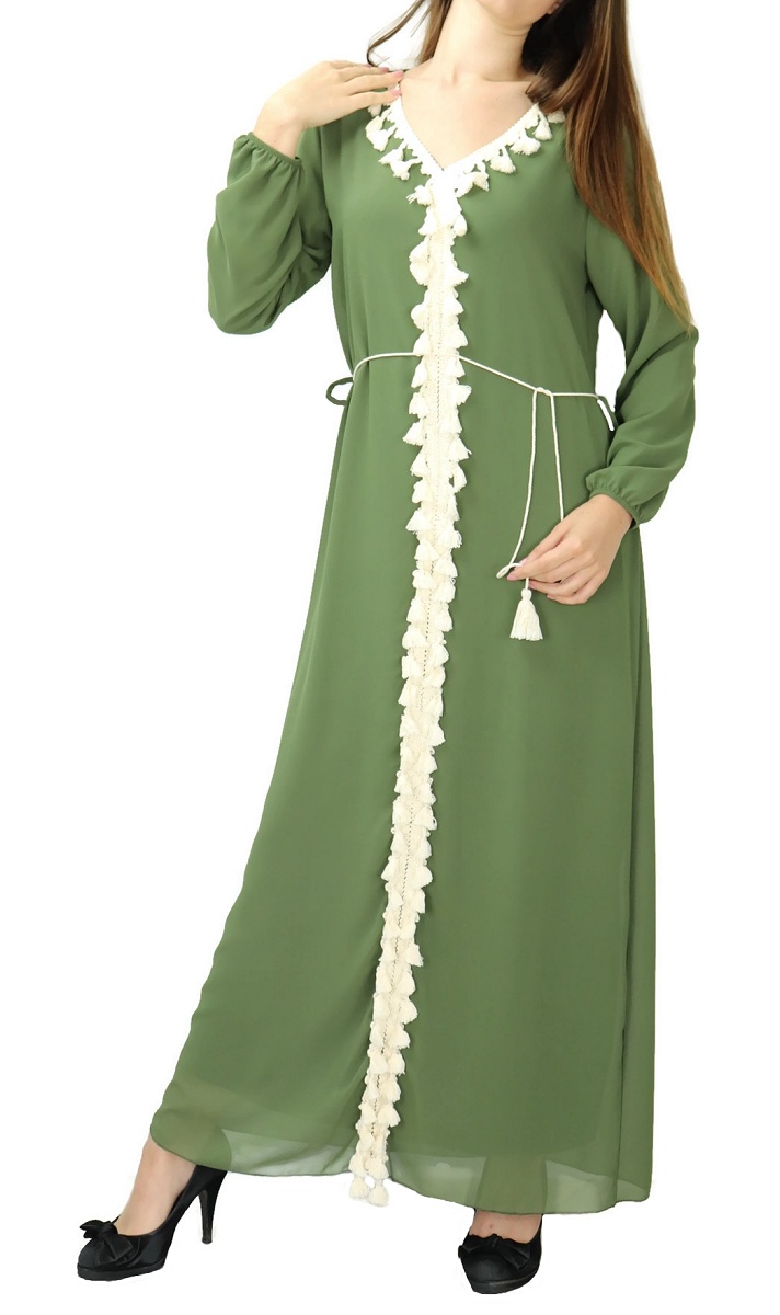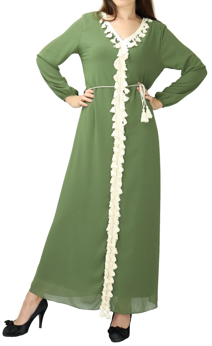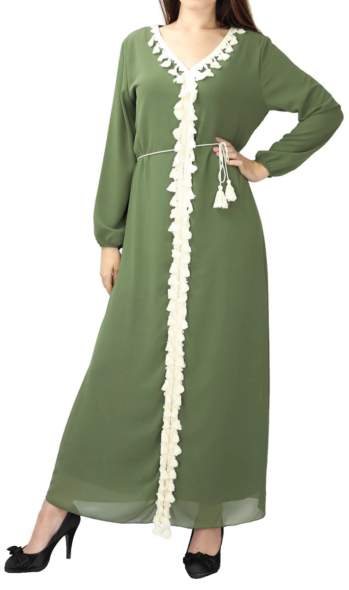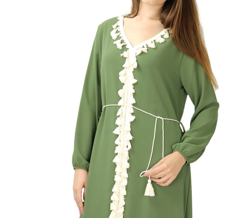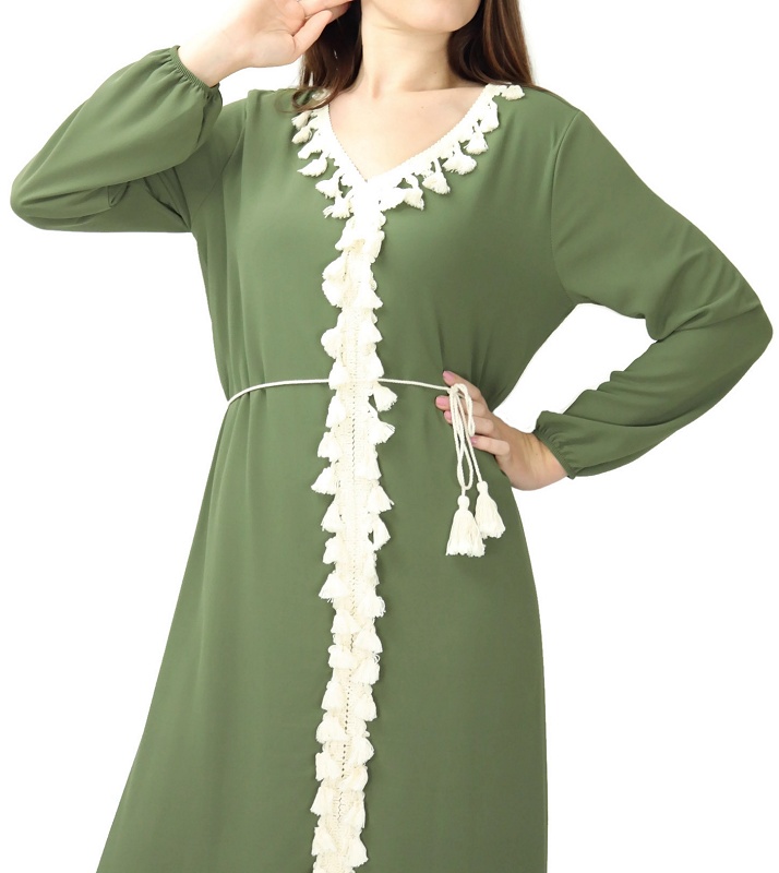 Robe longue, col en V, manches finition élastiques, ceinture à passants ajustable, entièrement doublée, coupe droite.