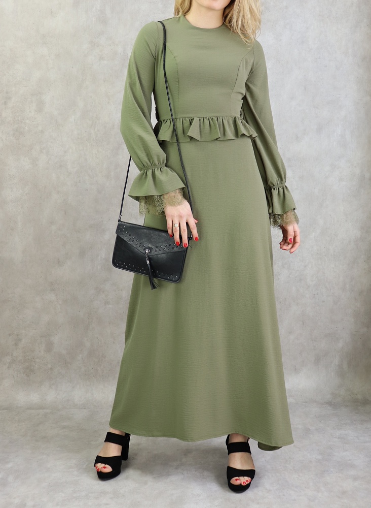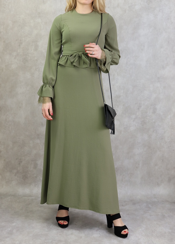 Robe longue évasée, col rond, fermeture glissière au dos, manches finition élastique froufrous et dentelles aux poignets, taille cintrée ornée d'un volant, ceinture assortie à passants, tissu doux, fluide et opaque.