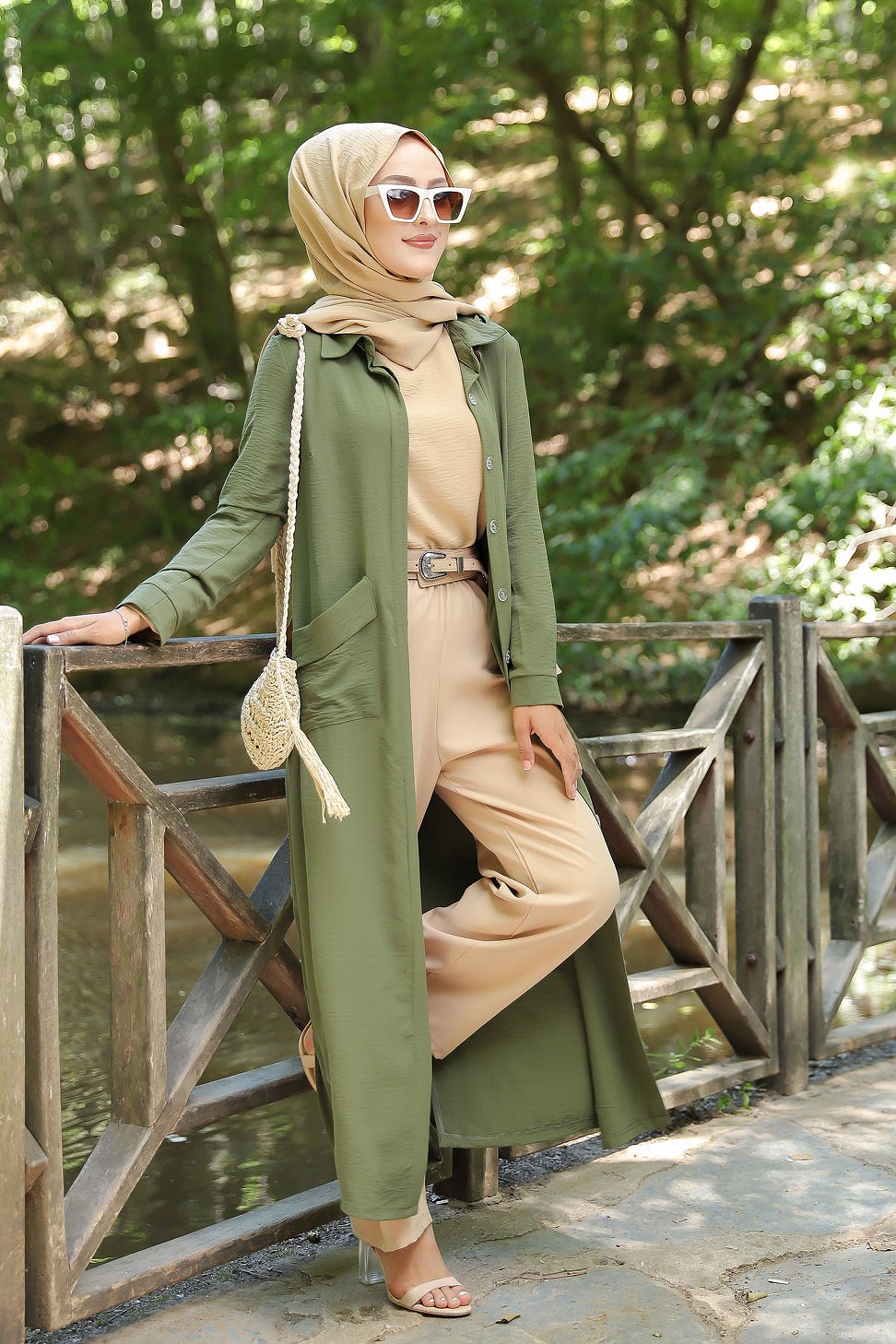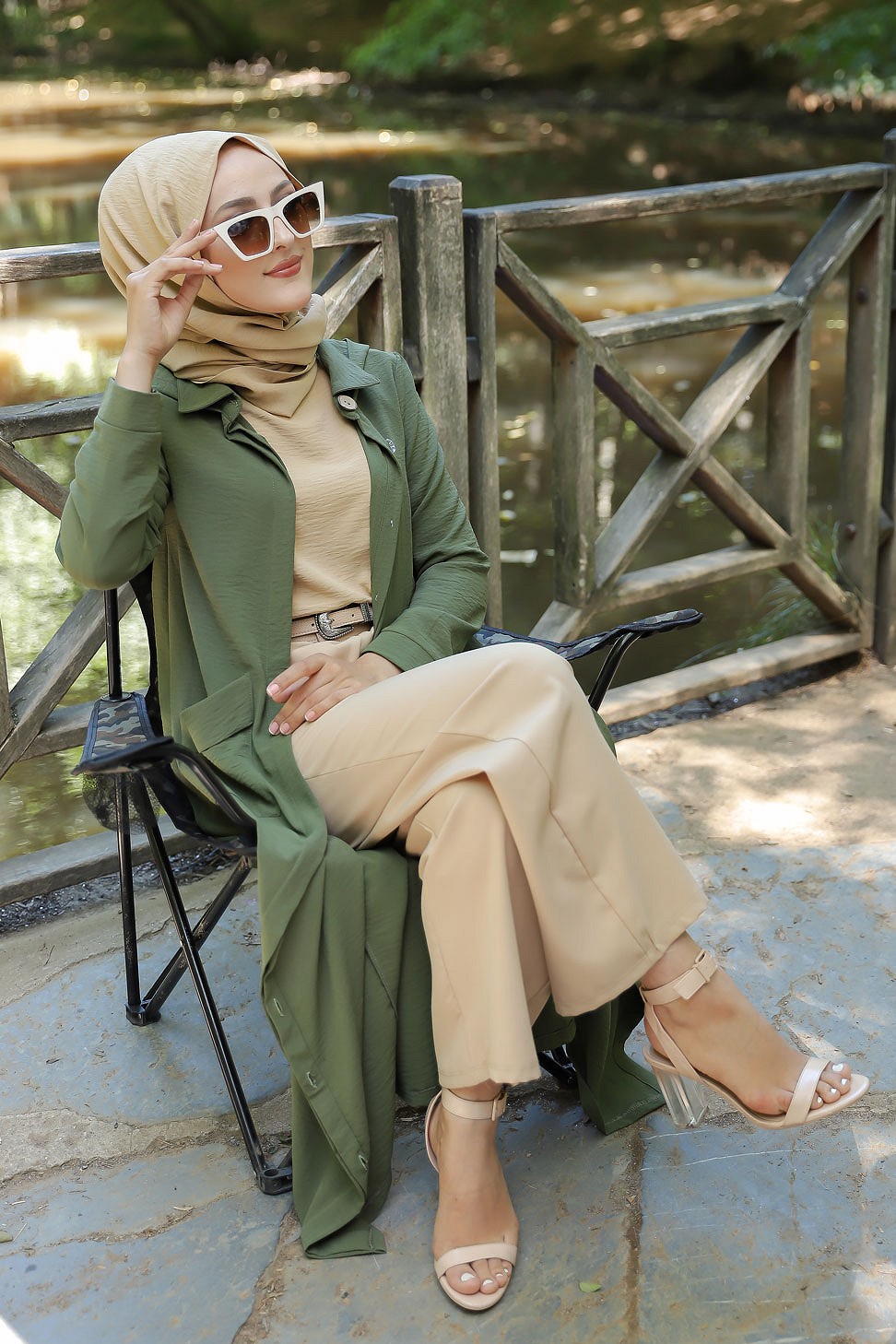 Veste longue classique boutonnée élégante (Vêtement Hijab pour femme voilée) - Couleur kaki - REF. 33248 (24.90 €)