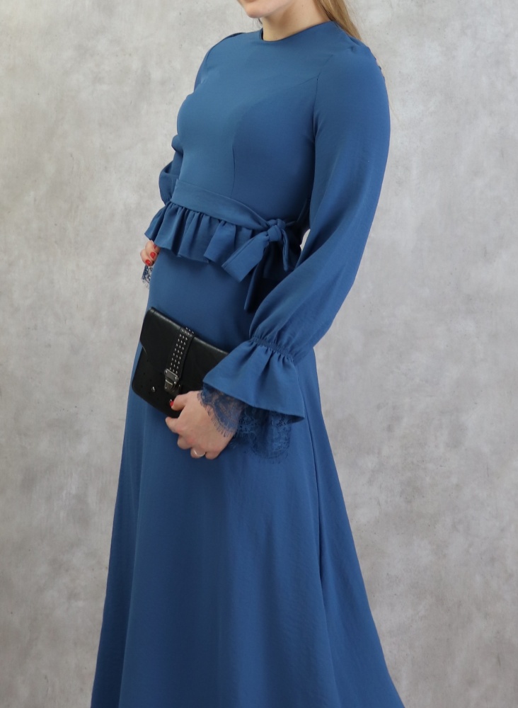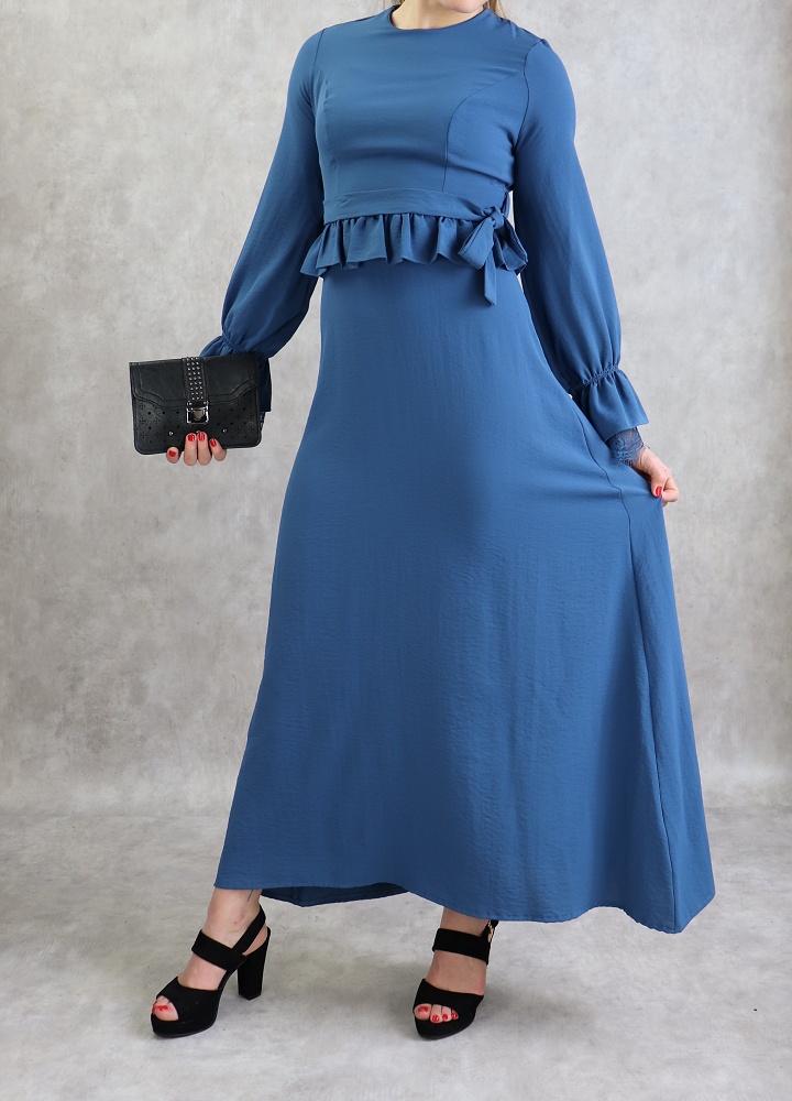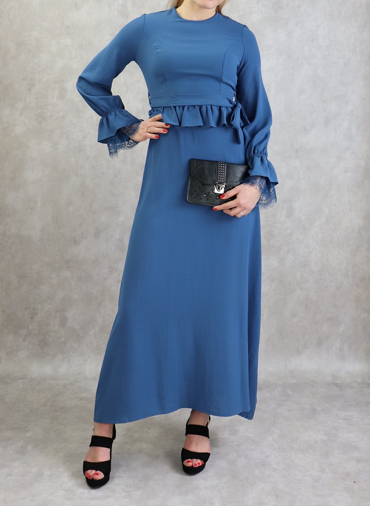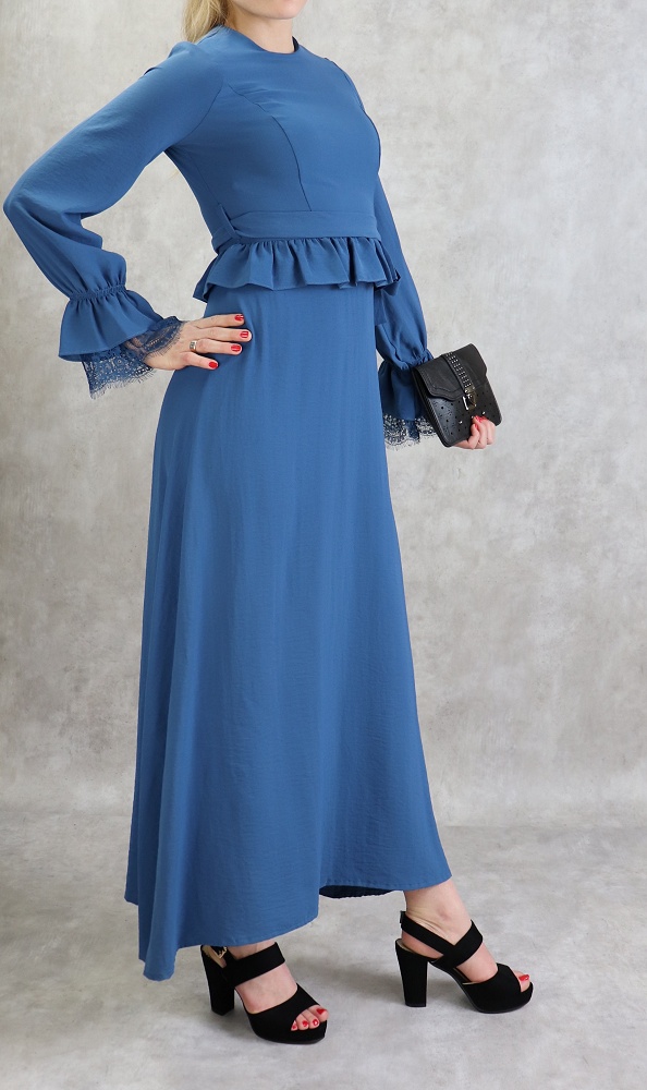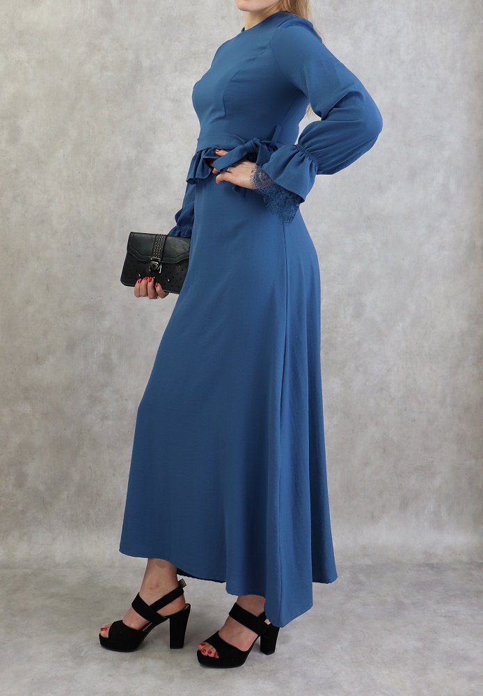Robe longue évasée, col rond, fermeture glissière au dos, manches finition élastique froufrous et dentelles aux poignets, taille cintrée ornée d'un volant, ceinture assortie à passants, tissu doux, fluide et opaque.