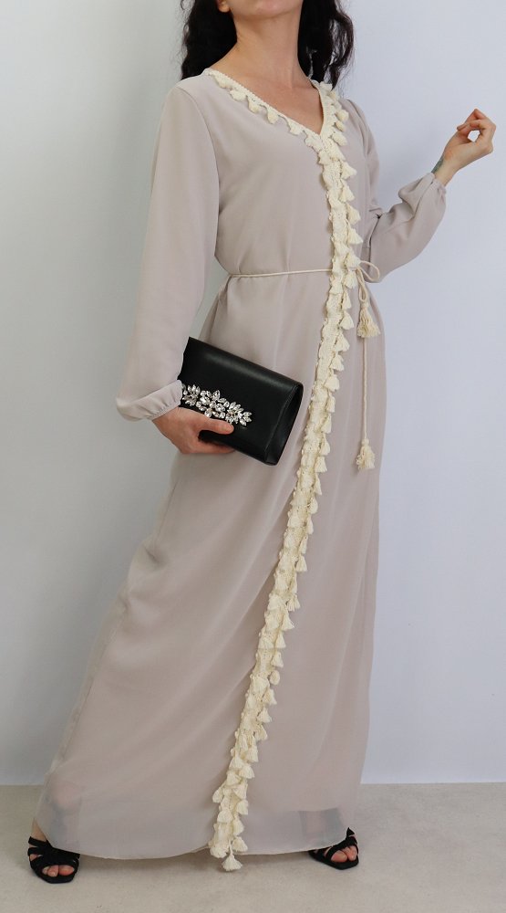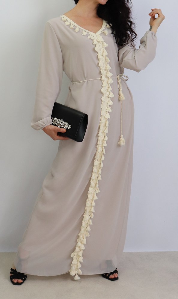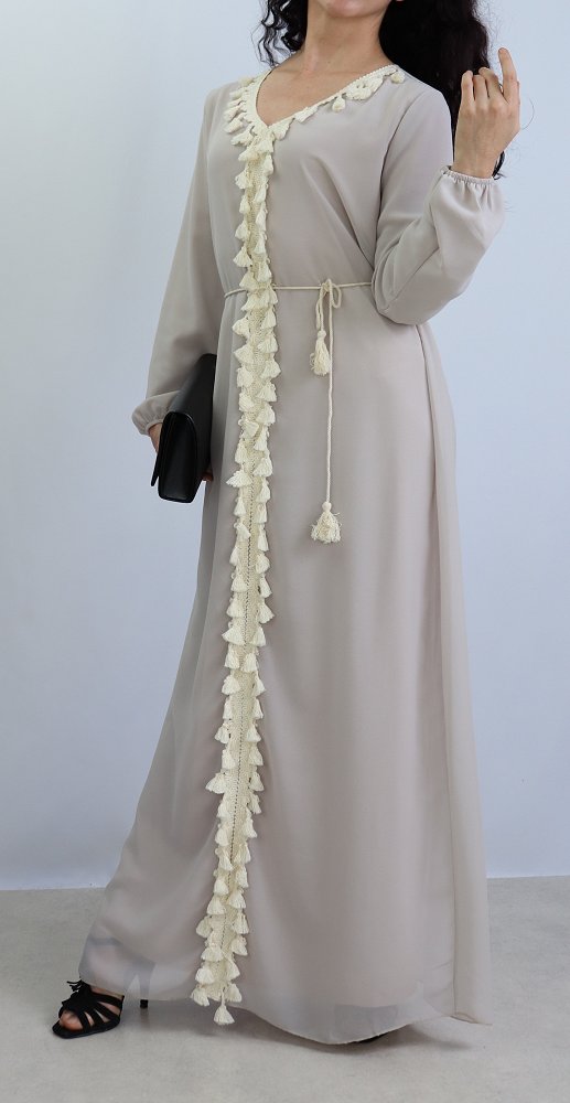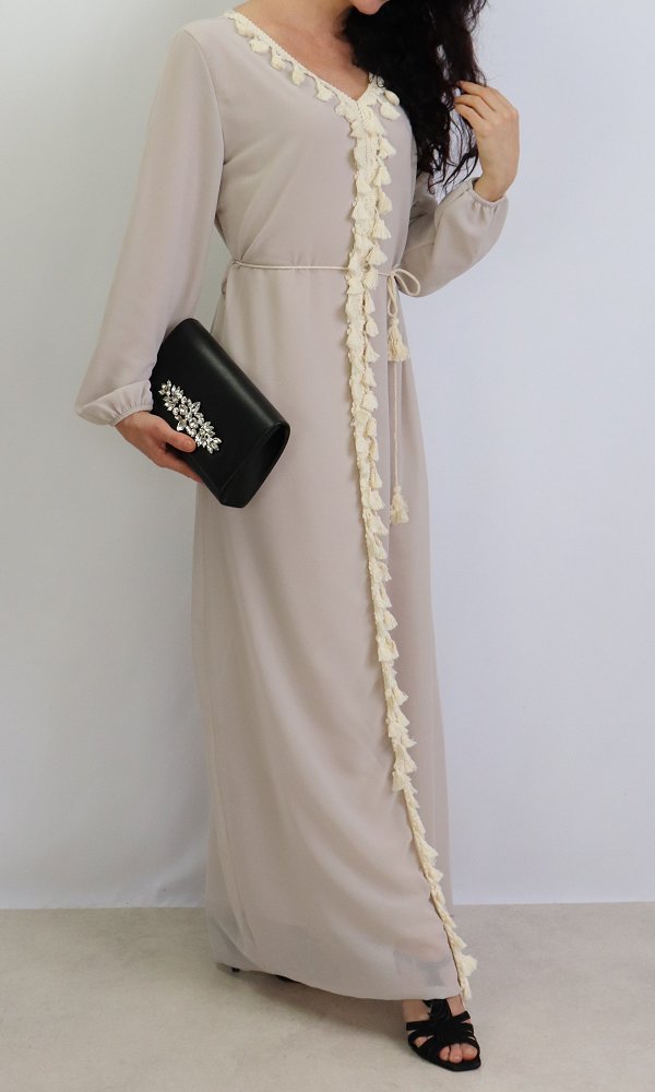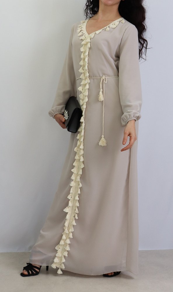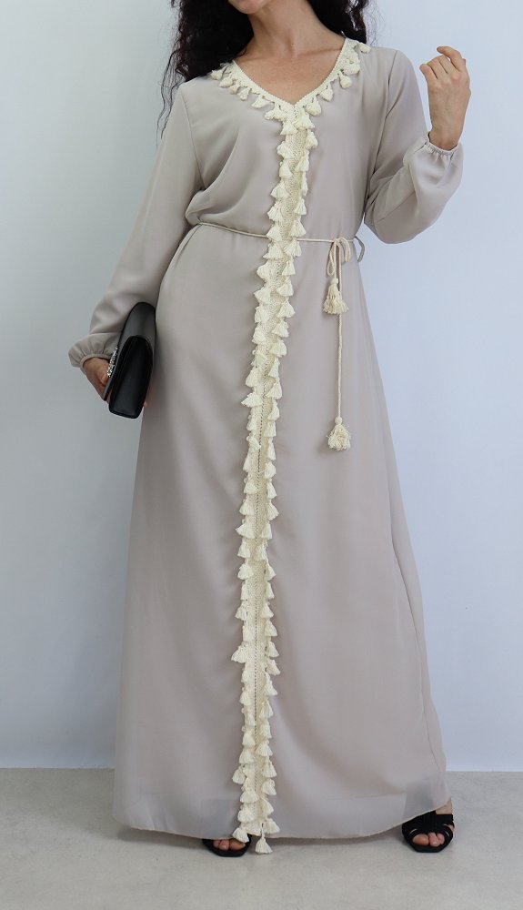 Modèle pile dans la tendance avec ses broderies, finement accompagné d'un lien qui se termine par des pompons.