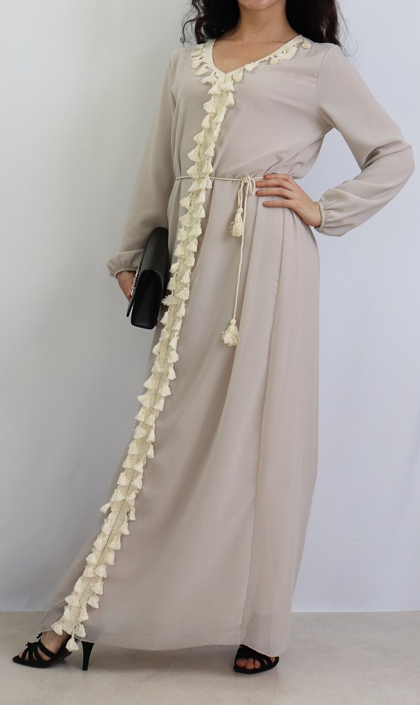 Robe longue, col en V, manches finition élastiques, ceinture à passants ajustable, entièrement doublée, coupe droite.
