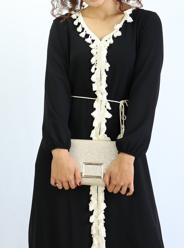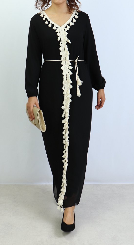 Robe longue fluide ornée de broderies avec ceinture pour femme - Couleur Noir Vetement & Accessoire