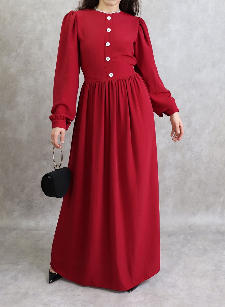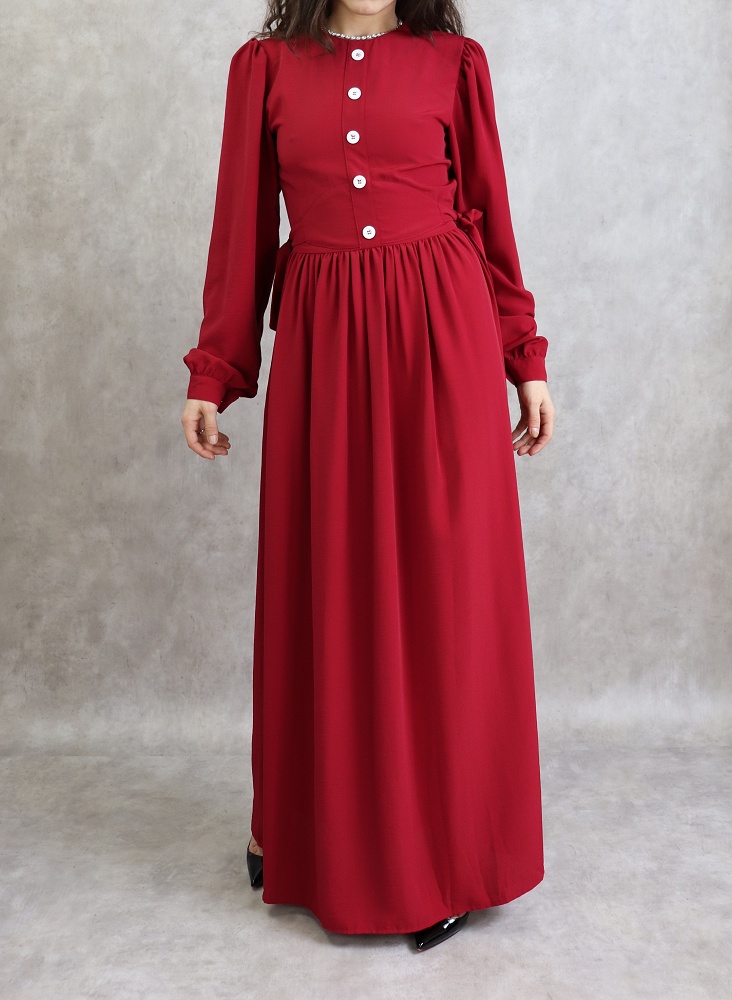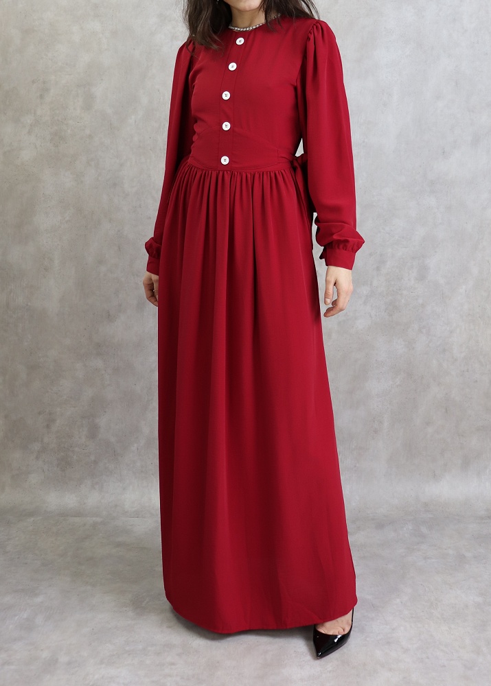 Robe longue, col rond, fermeture éclair dans le dos, manches longues finition bouton aux poignets, taille cintrée et froncée assortie de sa ceinture cousue qui peut s'attacher sur les côté, par derrière ou devant... Décoration boutons sur le buste. Coupe évasée sur le bas, tissu opaque et léger.