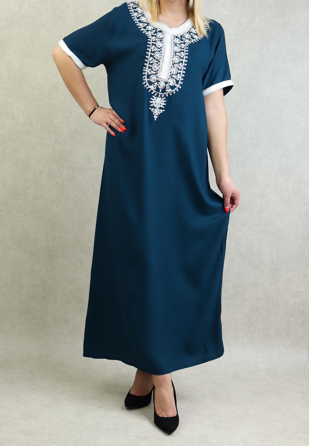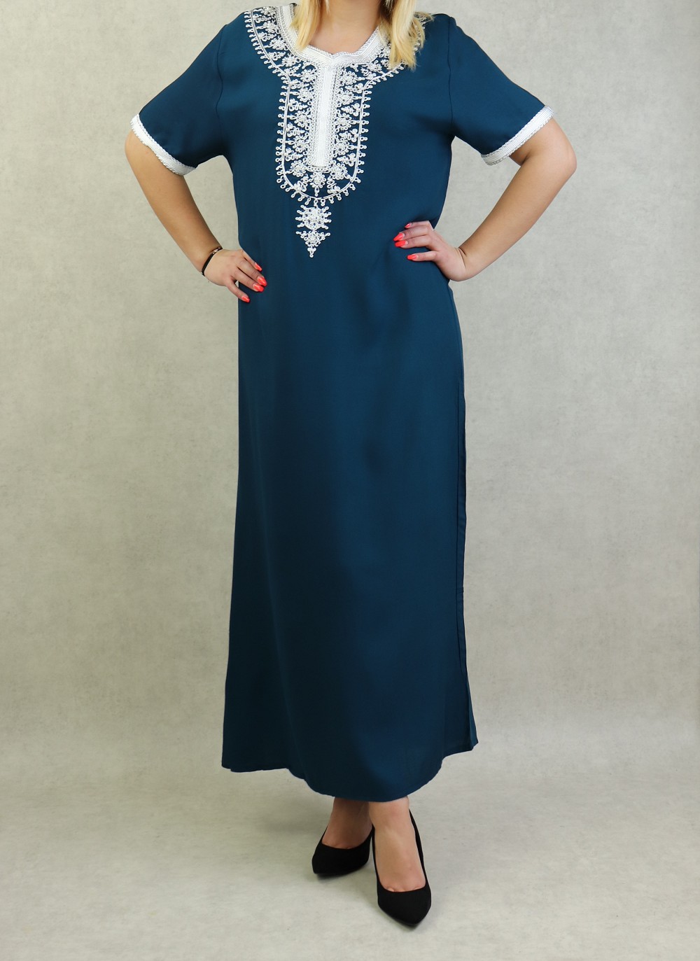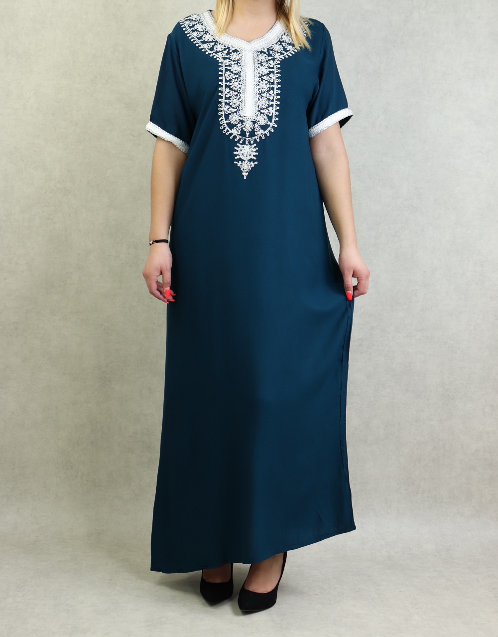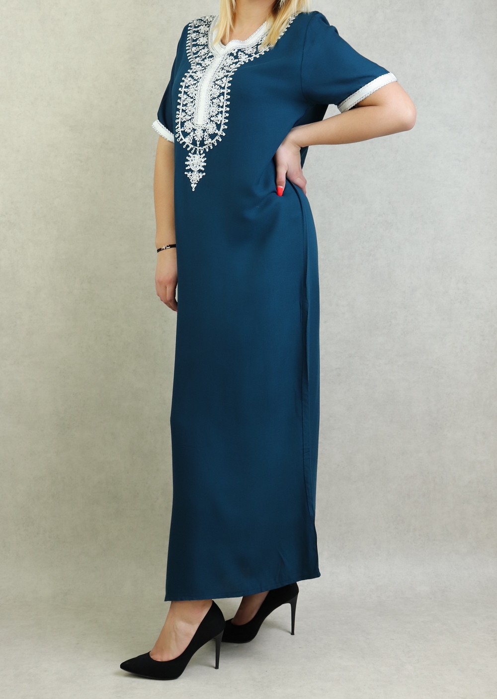 Robe longue manches courtes style oriental brodée avec strass et perle pour femme - Couleur Bleu pétrole Vetement & Accessoire