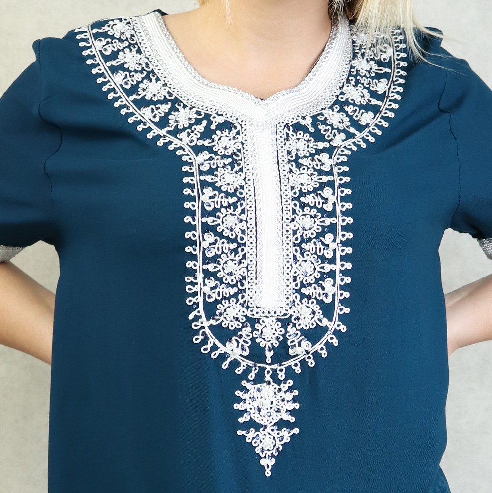Robe longue manches courtes style oriental brodee avec strass et perle pour femme - Couleur Bleu petrole