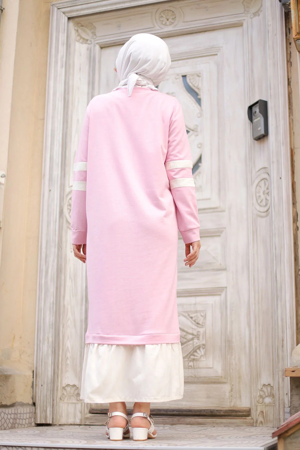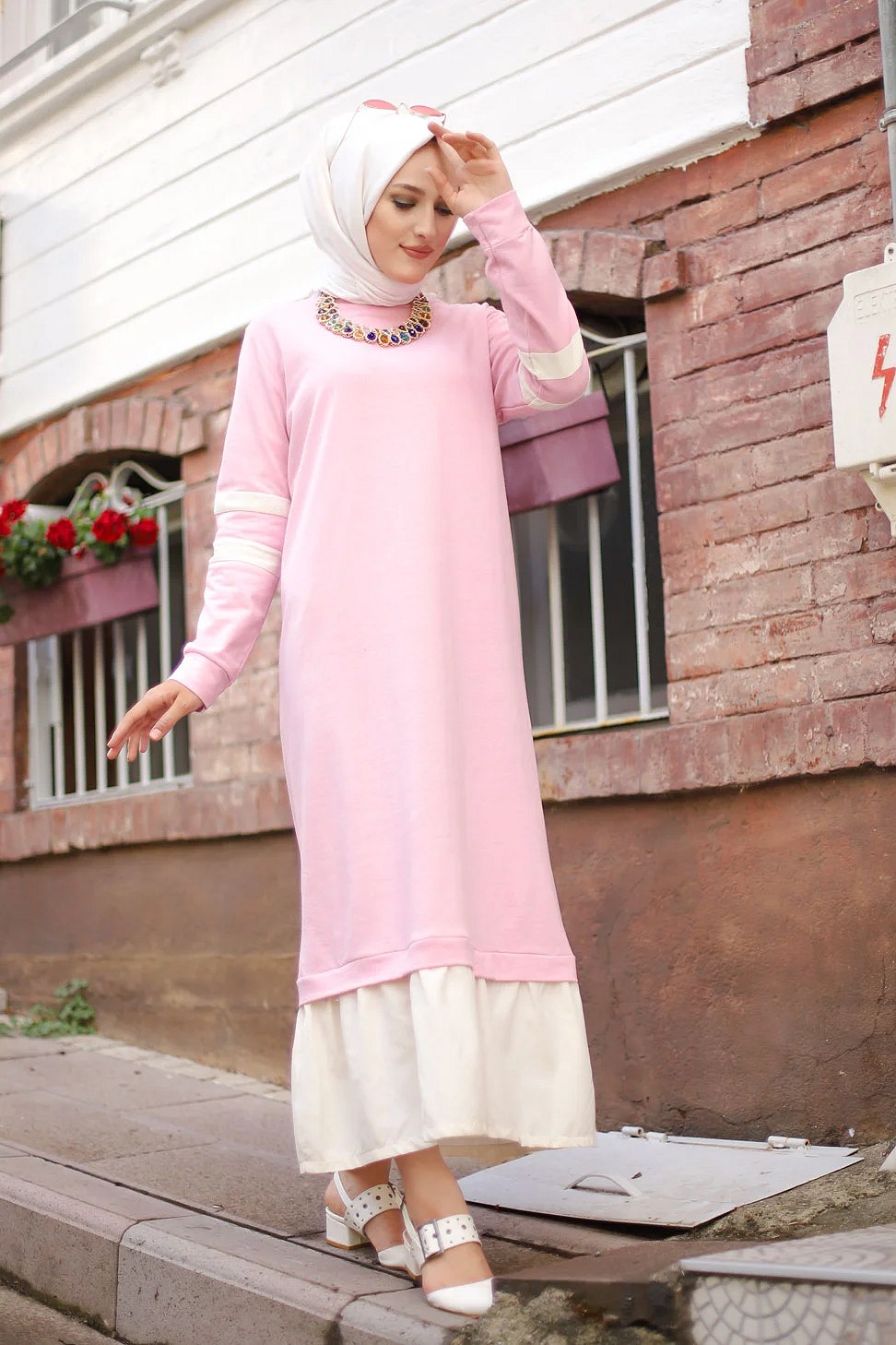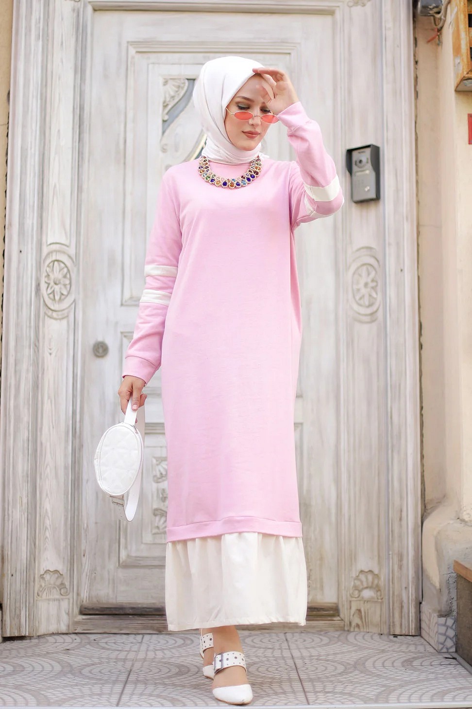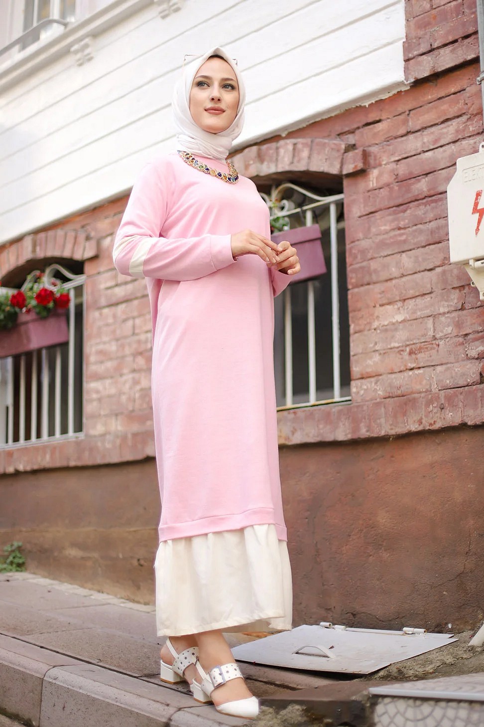 Robe longue bicolore en une pièce avec effet tunique-jupe apporte de nouveaux reflets à cette tenue pour un look féminin moderne.