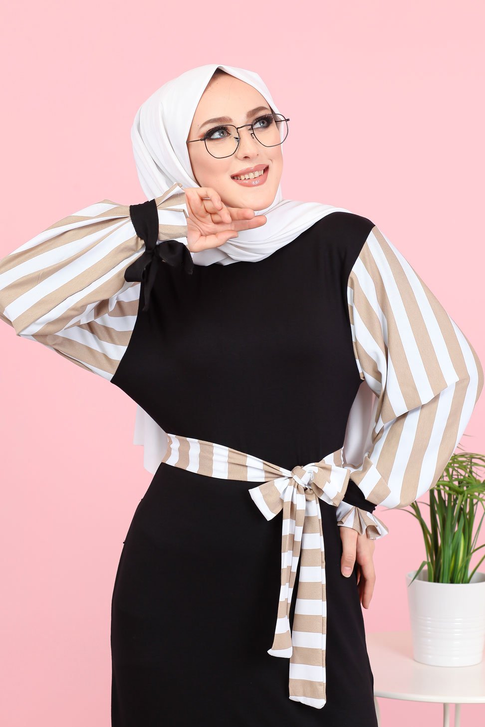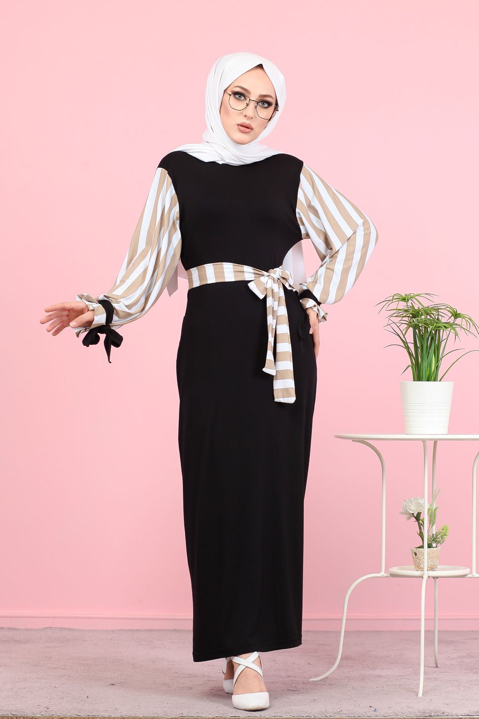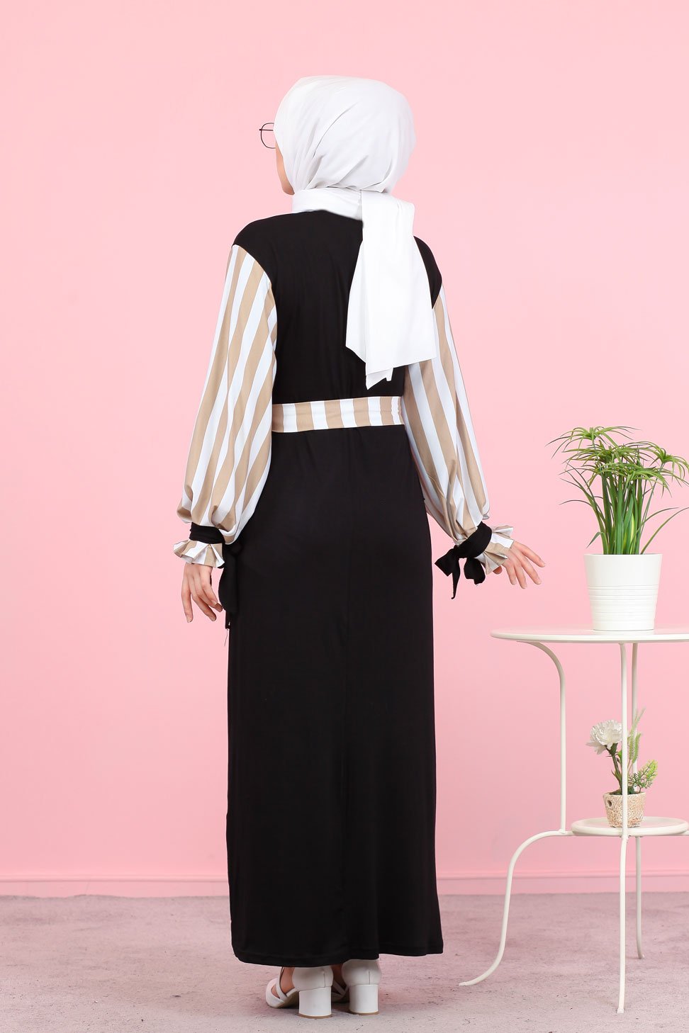 Robe longue noire avec manches et ceinture a rayures camel et blanches