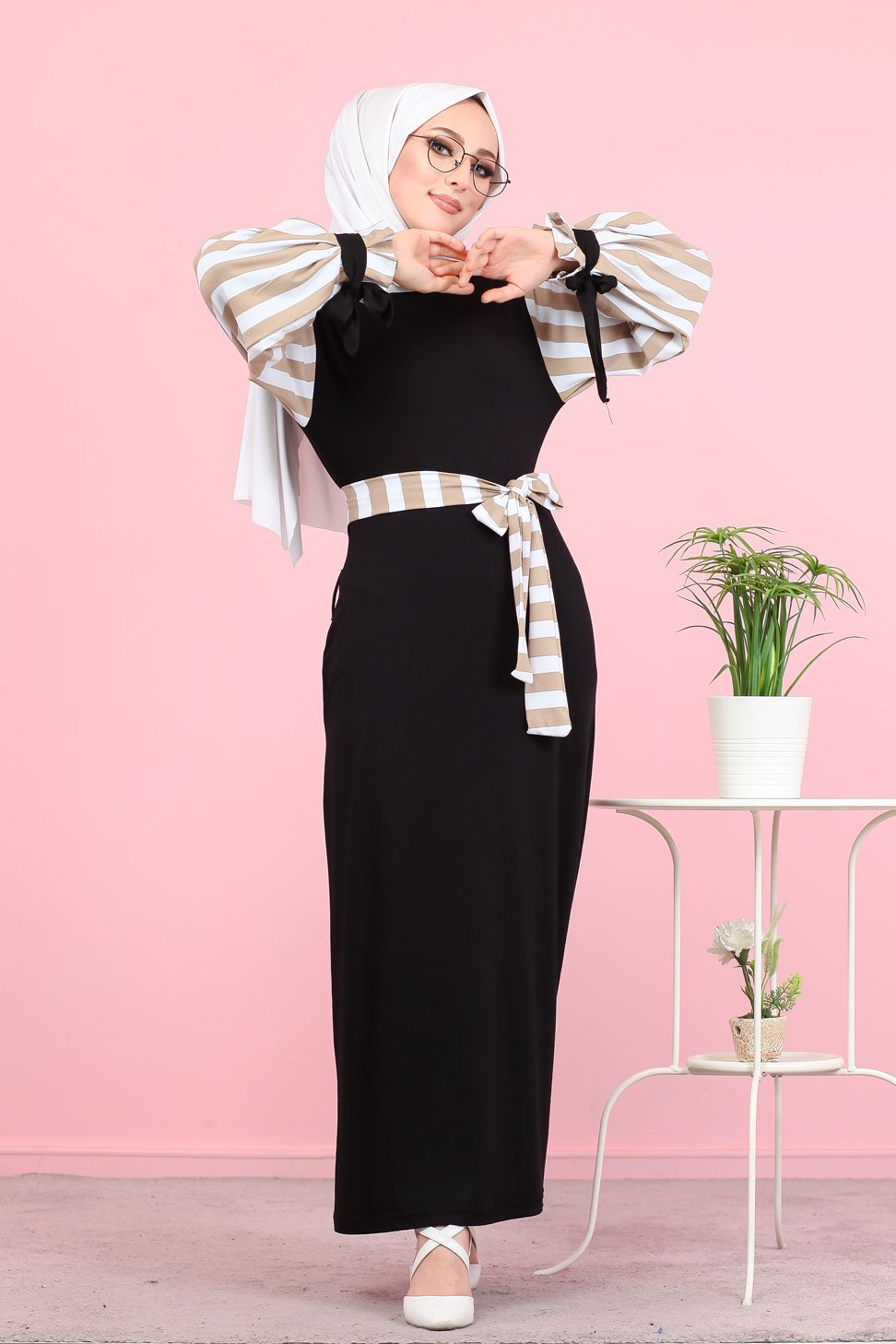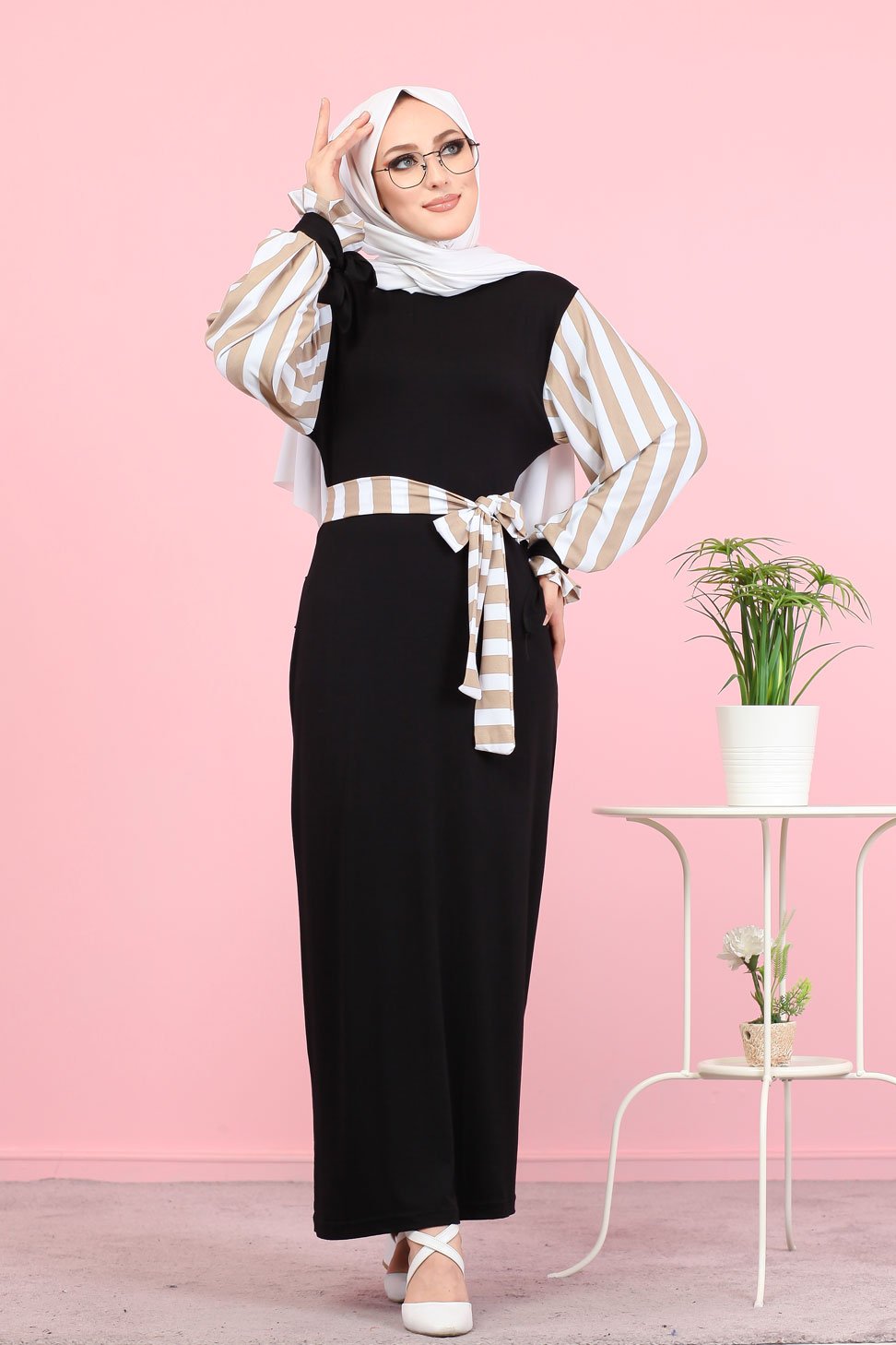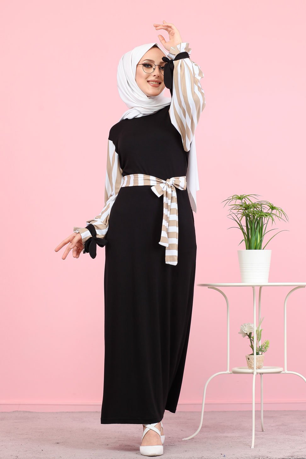 Robe longue noire avec manches et ceinture a rayures camel et blanches