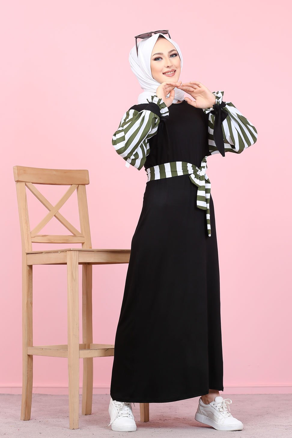 Robe longue noire, coupe droite, encolure ronde, manches à rayures avec finition lien de serrage aux poignets. Ceinture amovible retenu par des passons en tissu.