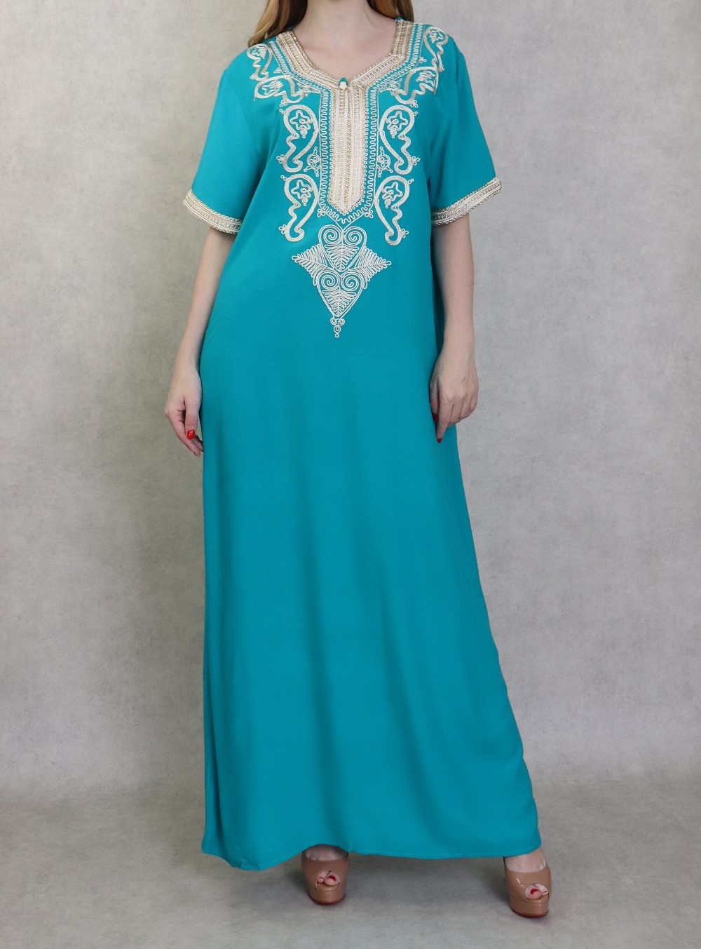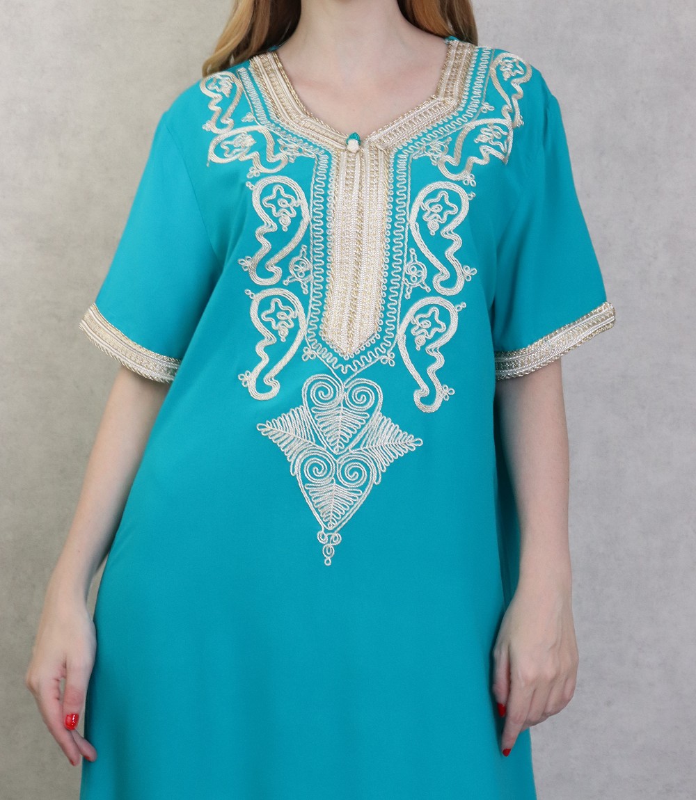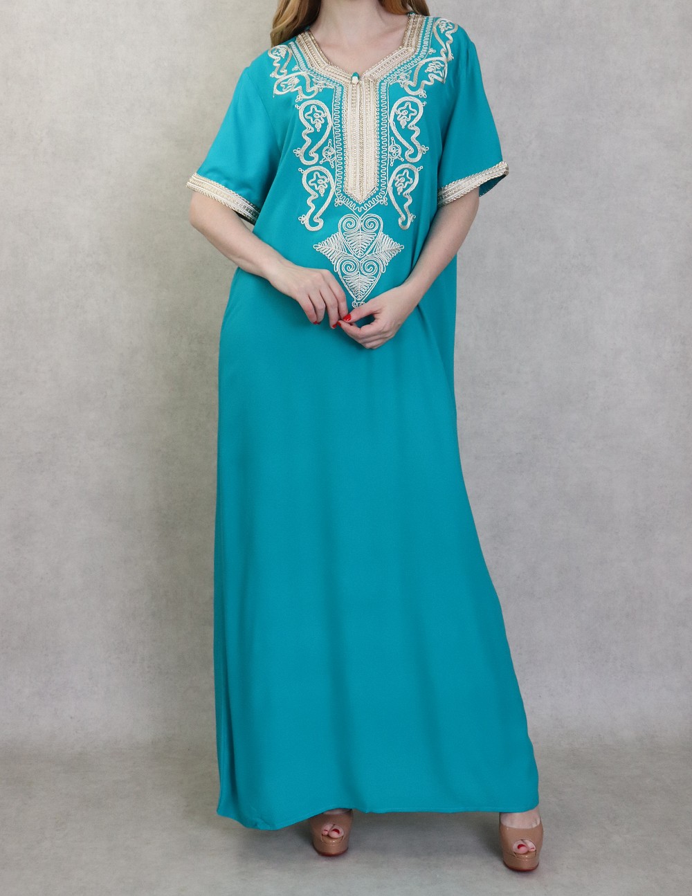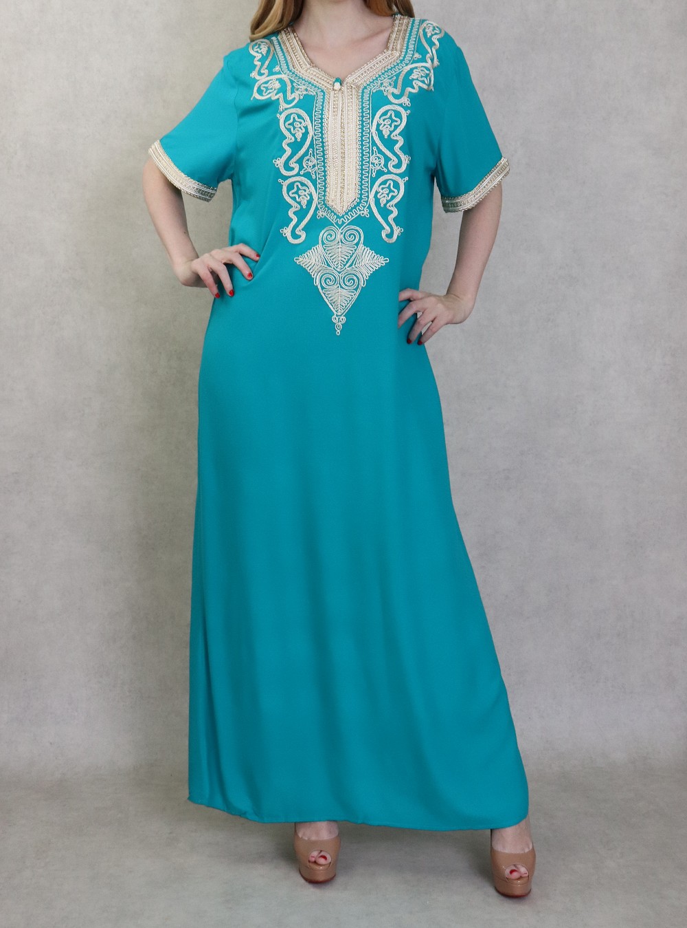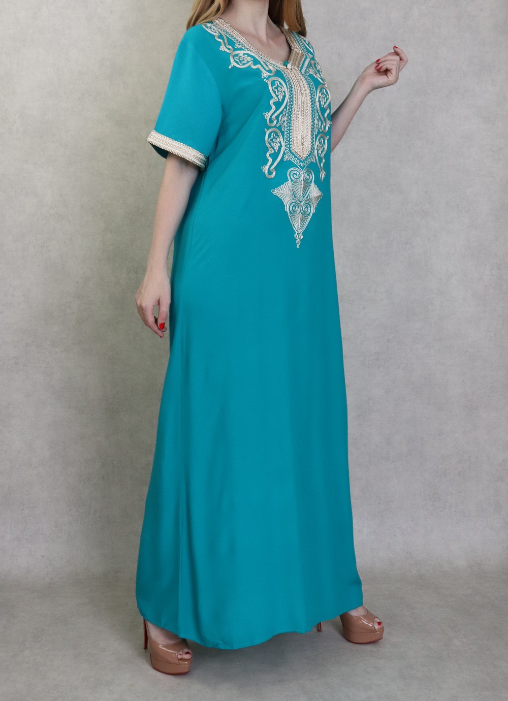 Robe longue, col en V, manches courtes, décorées de broderies sur tout le buste. Coupe droite, tissu doux et fluide