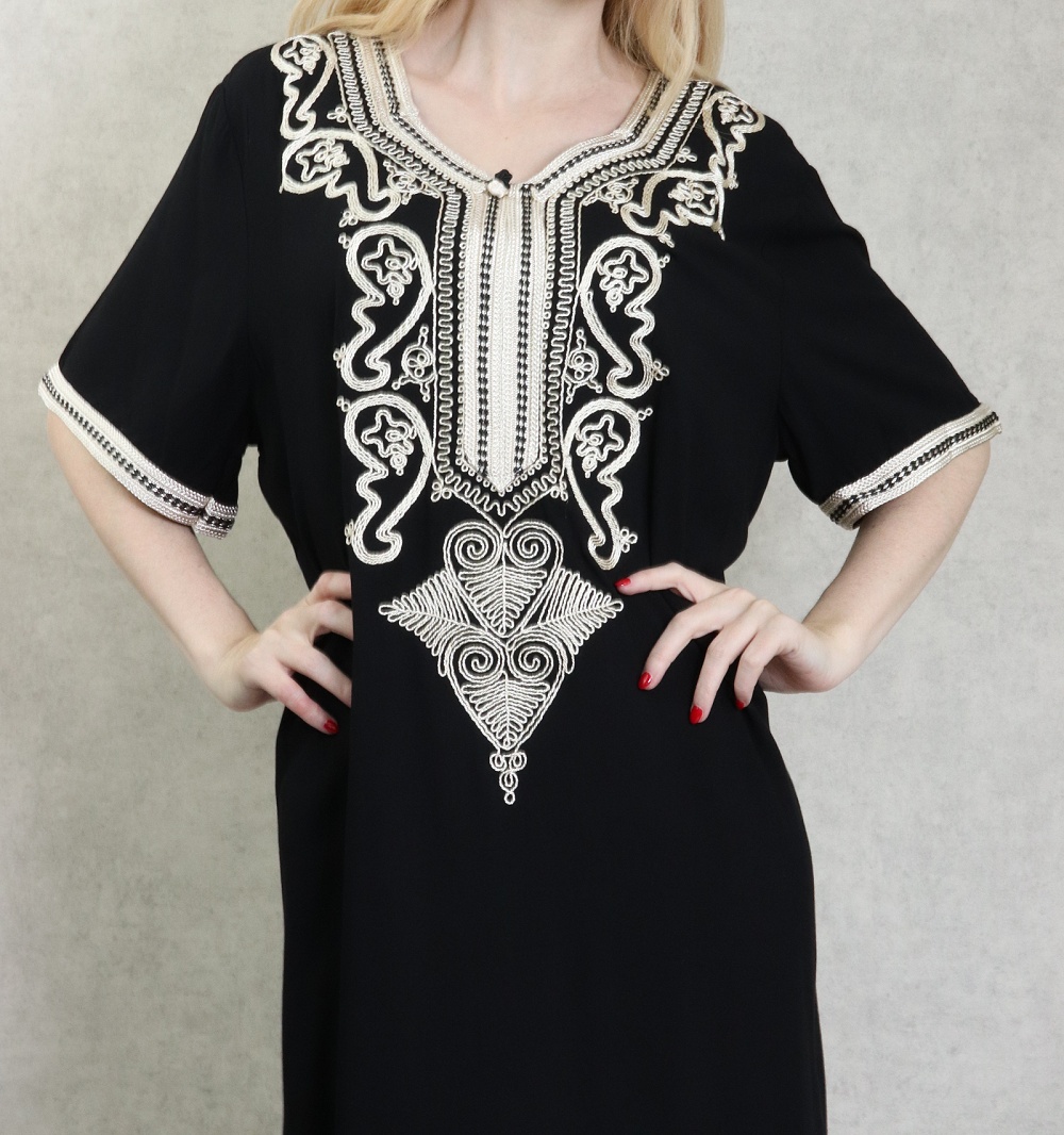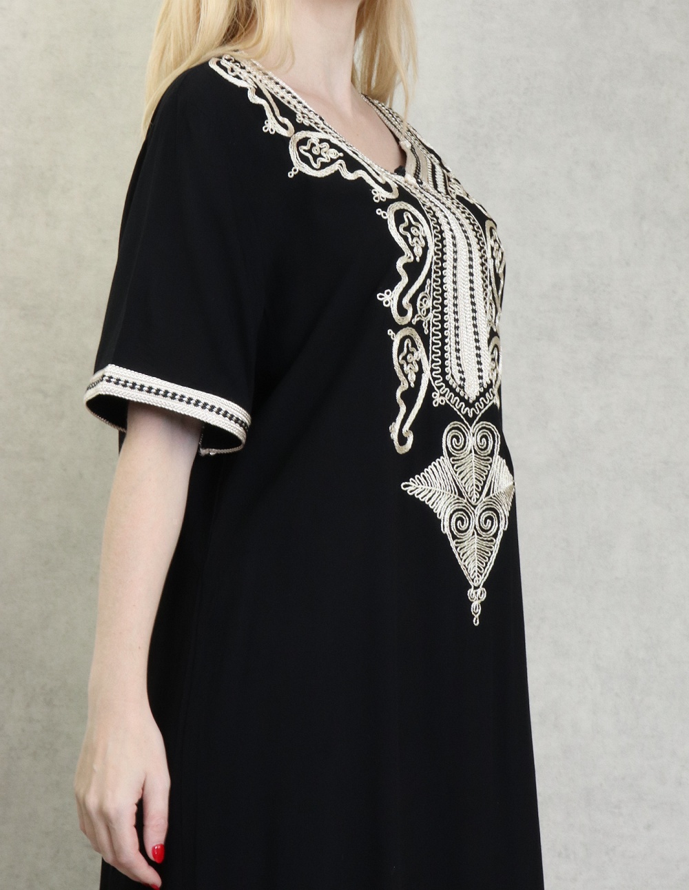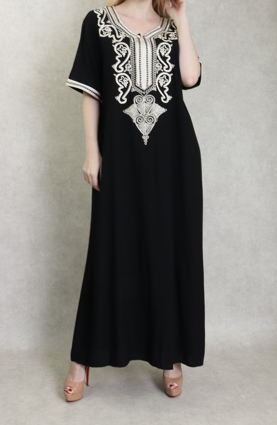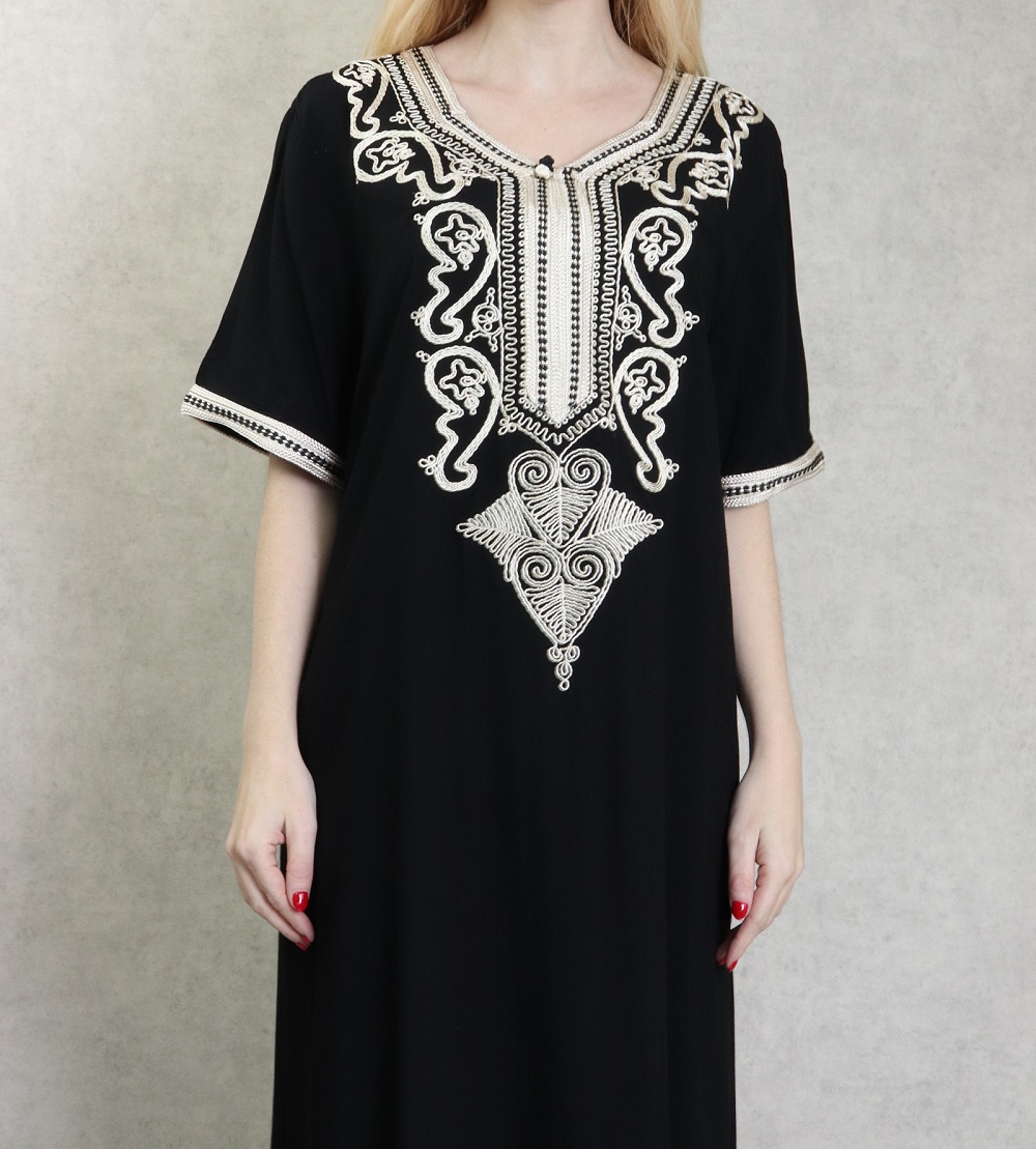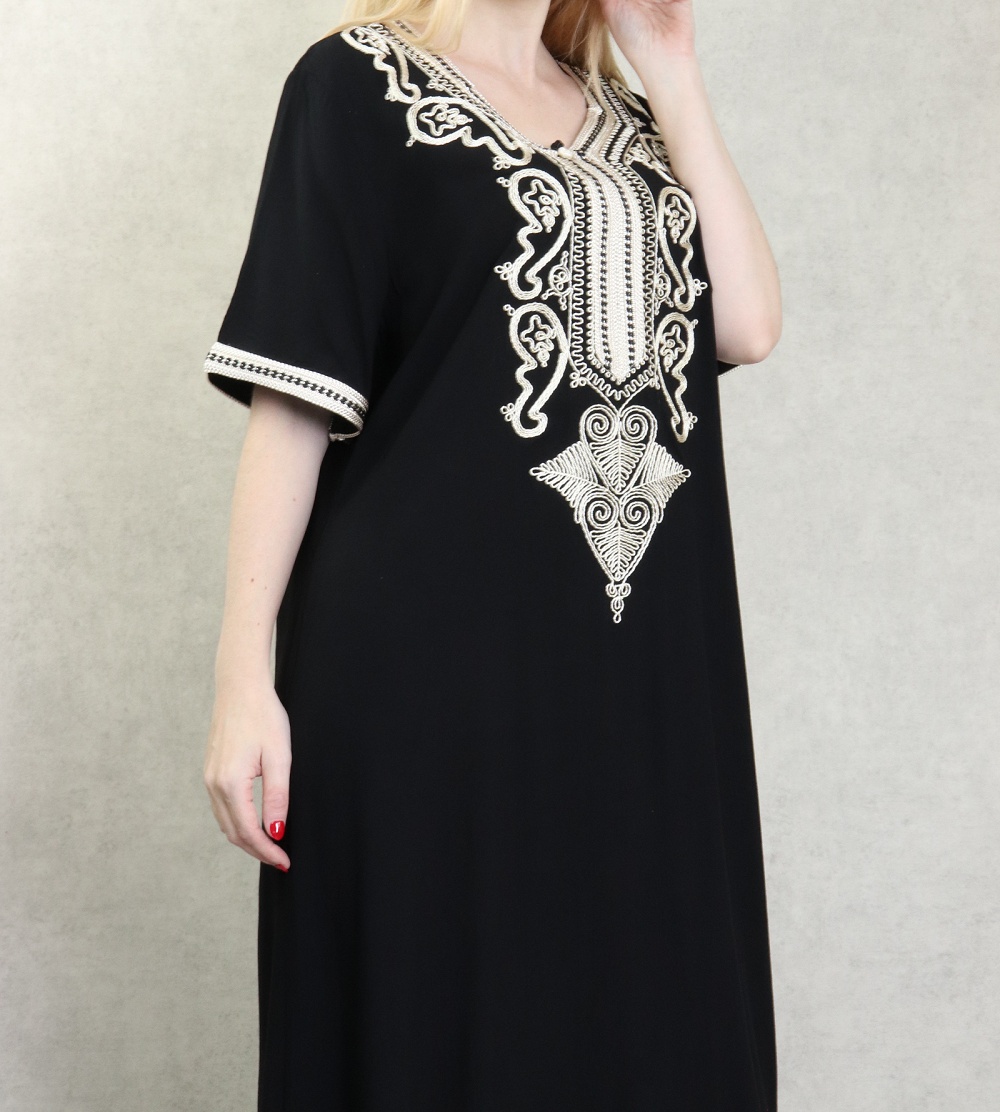 Robe orientale longue pas cher à manches courte avec broderies pour femme - Couleur noir