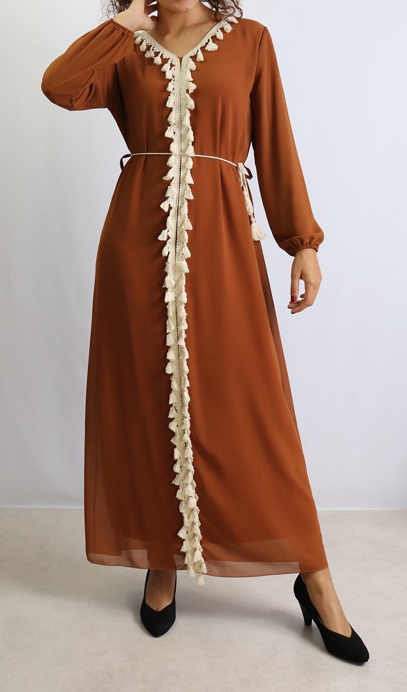 Robe longue ornee de broderies a pompons avec ceinture - Taille Unique - Couleur Marron