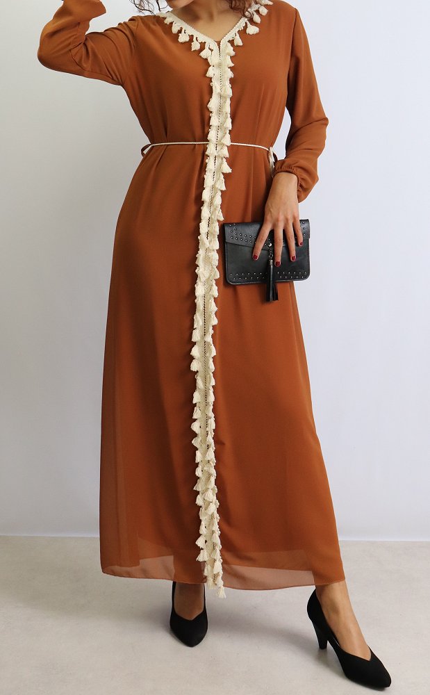 Robe longue type abaya marocaine pour femme avec capuche et motifs dorés - Couleur rouille - REF. 28281 (29.00 €)