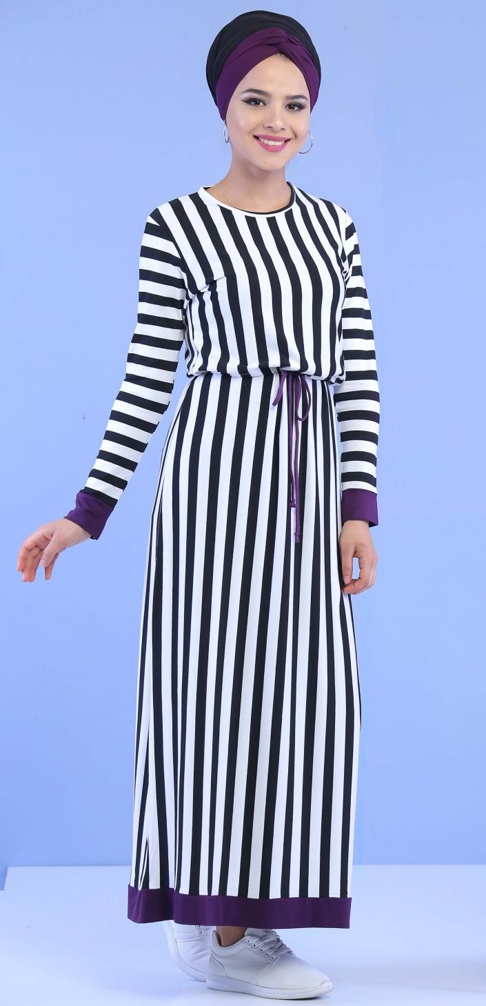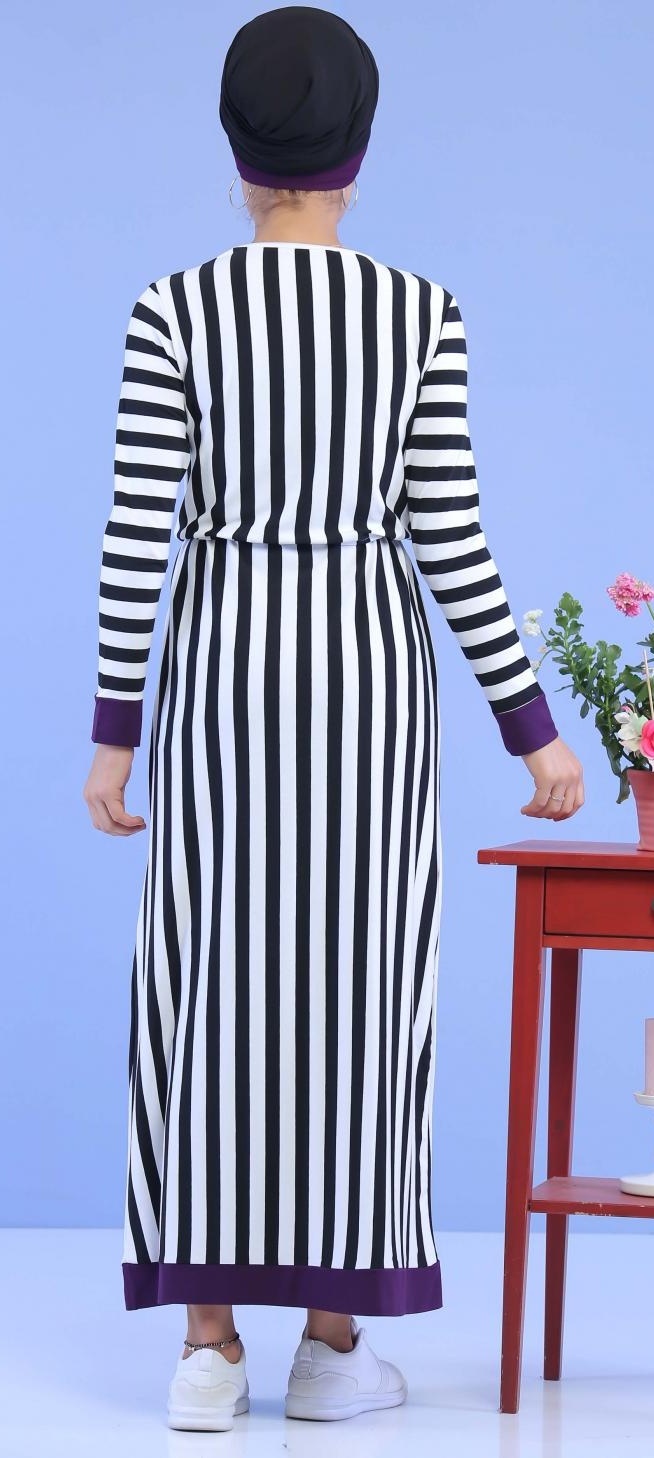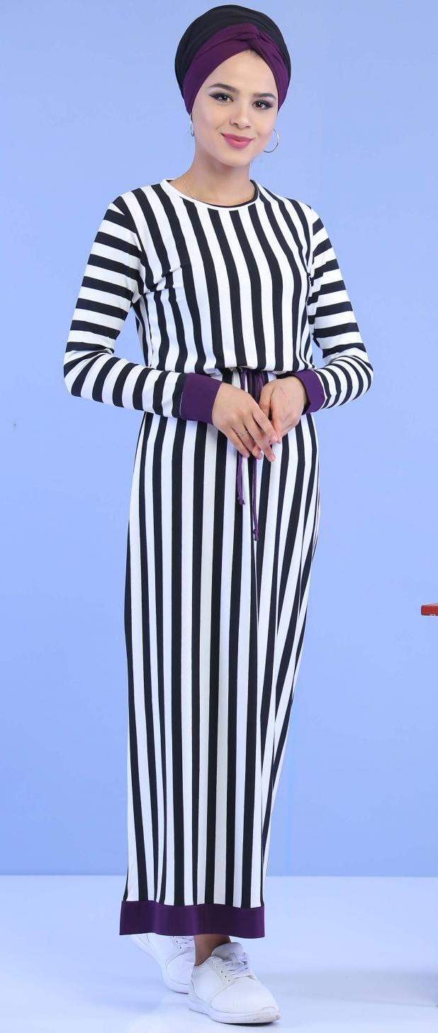 Robe longue, col rond, coupe droite, taille avec lien de serrage. Modèle classique et sobre, approprié pour la mi-saison en toute décontraction.