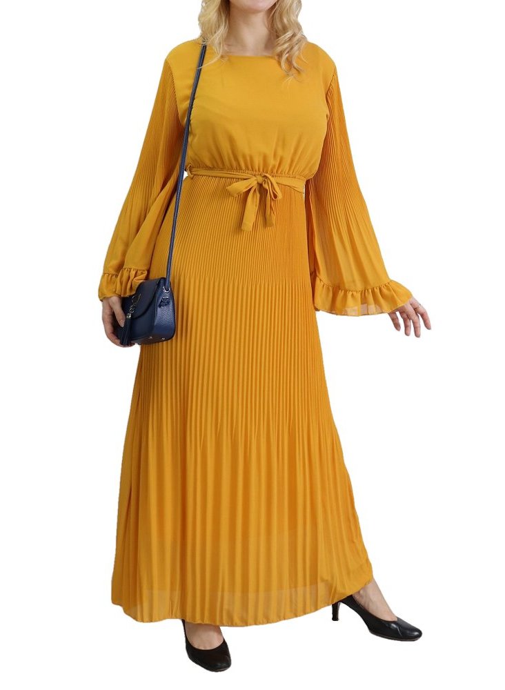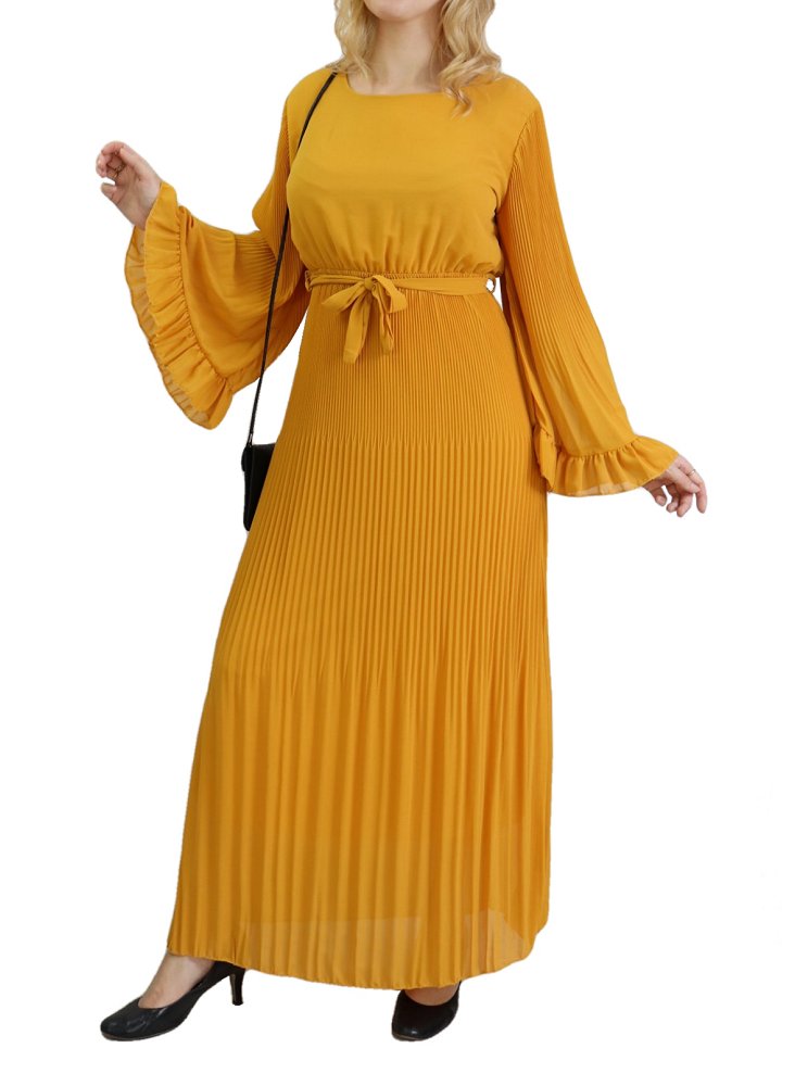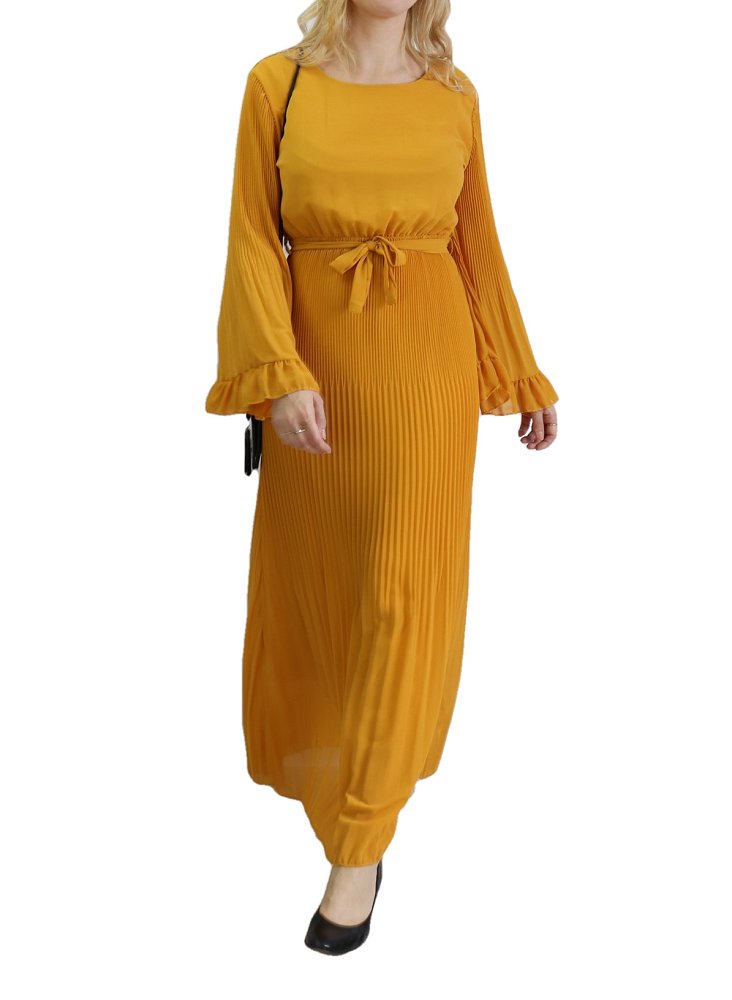 Robe longue ajustable à la taille. Plissée en bas de la robe ainsi que sur les manches évasées, le tout accompagné d'une ceinture qui peut se mettre autour ou par derrière. Intérieur doublé. Tissu de type mousseline.