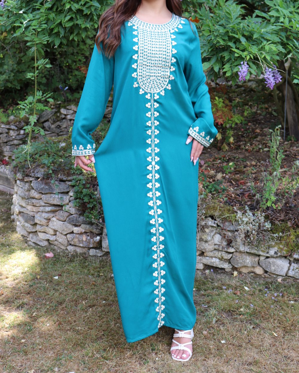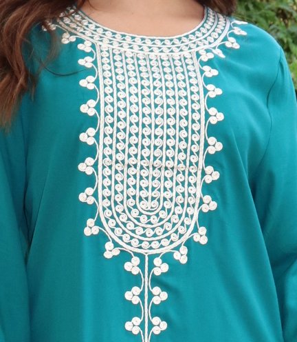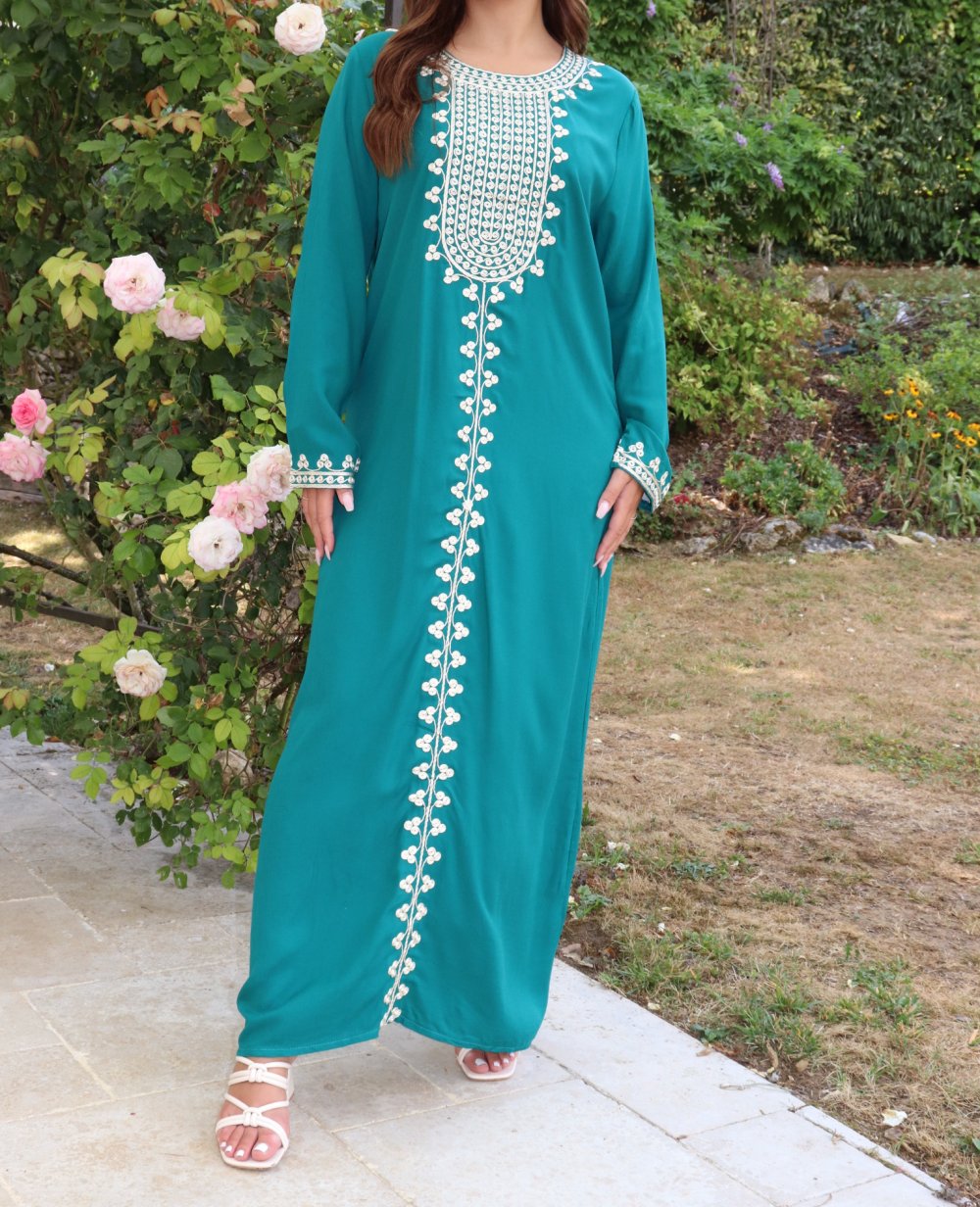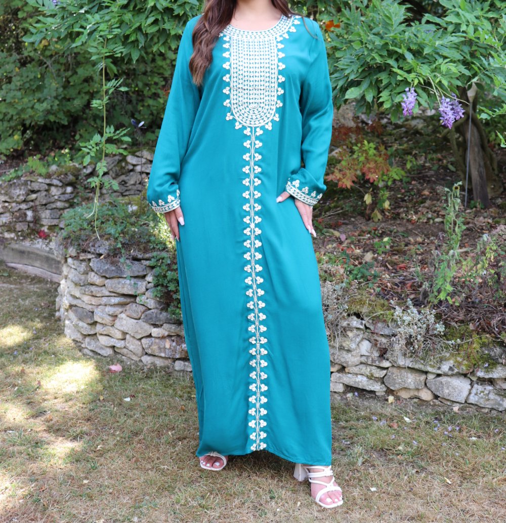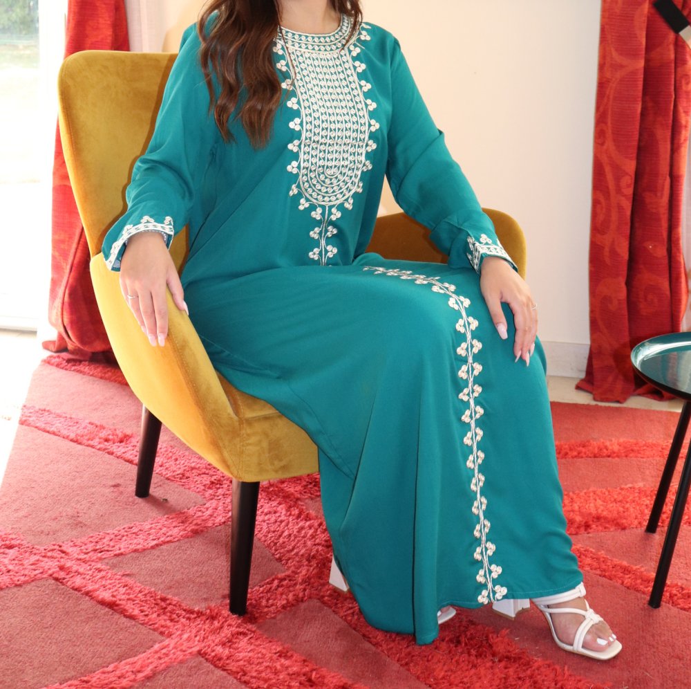 Robe longue pour femme avec broderies sur le devant et les manches - Couleur vert émeraude Vetement & Accessoire