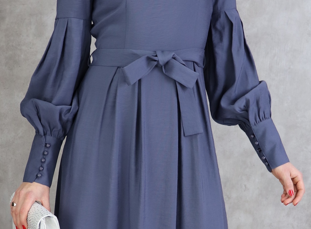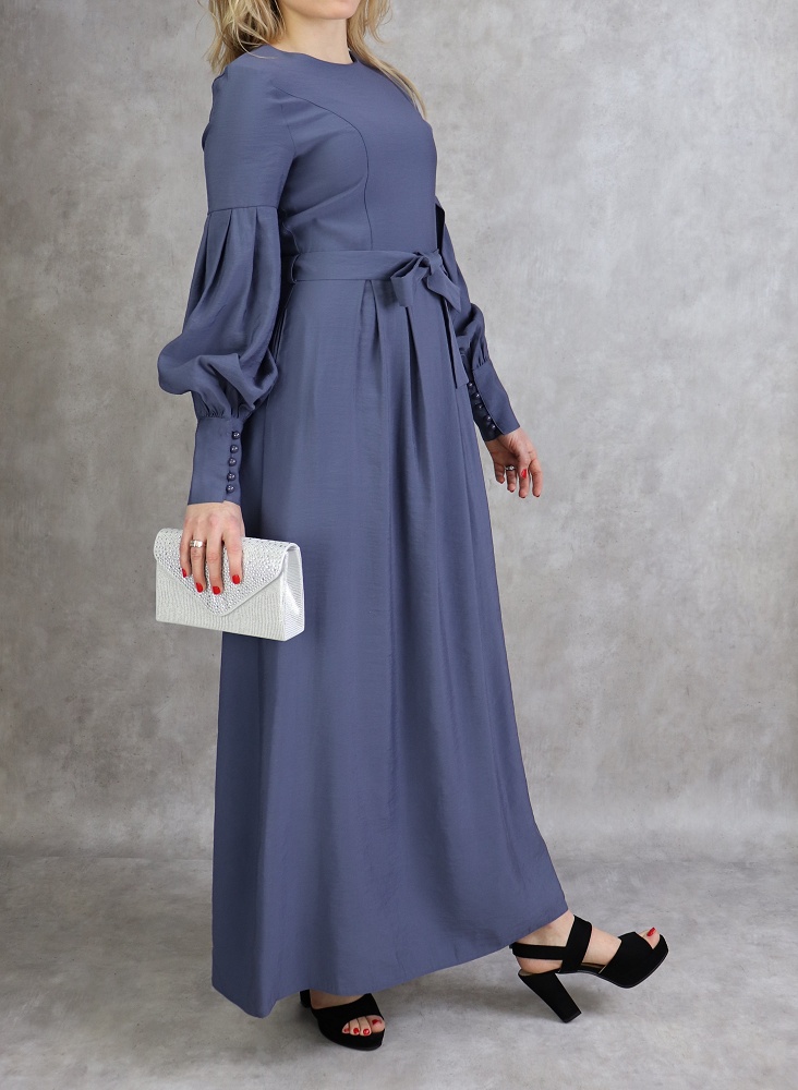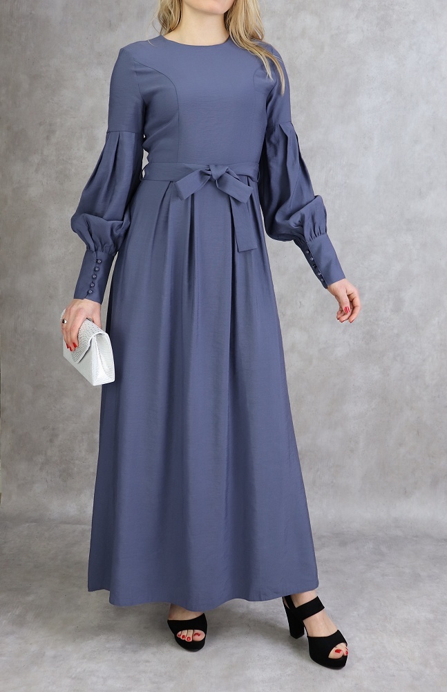 Robe longue, col rond, fermeture zip au dos, manches finitions larges poignets 5 boutons, 2 poches latérales, taille cintrée avec plis creux, ceinture assortie à passants, tissu agréable et opaque adapté à toutes les saisons.