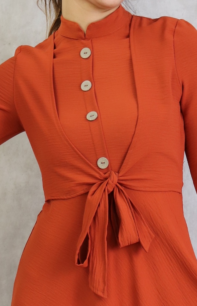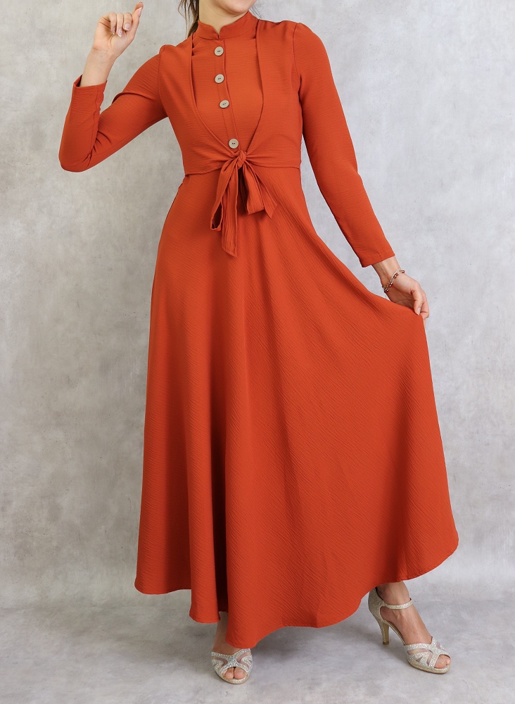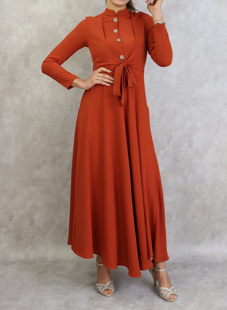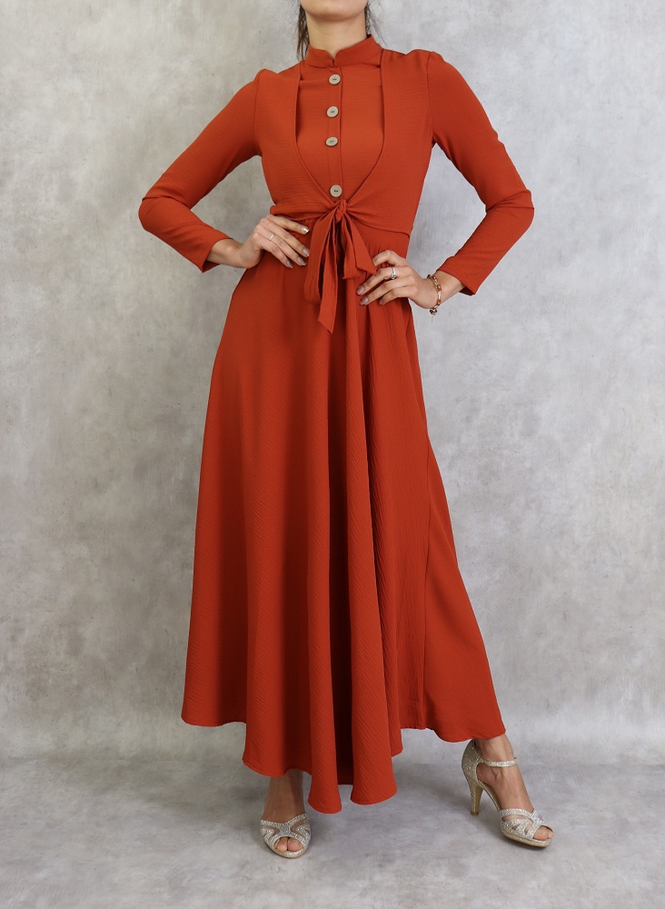 Le mannequin mesure 1m72 (36/XS) et porte la robe de couleur rouille.