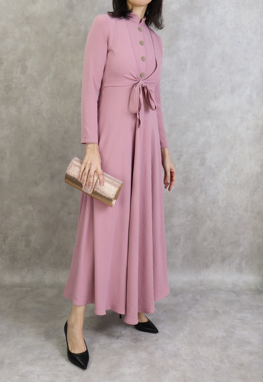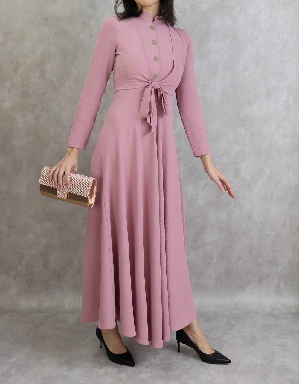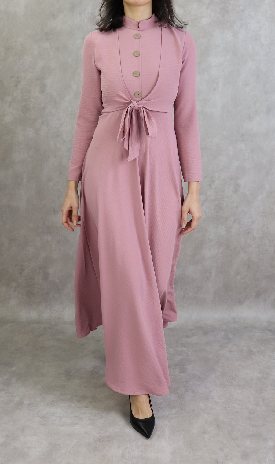Robe longue, col mao, fermeture bouton + zip au dos, 2 pans de tissu à nouer sur le devant, décoration boutons, taille cintrée, bas evasée, tissu fluide et opaque.