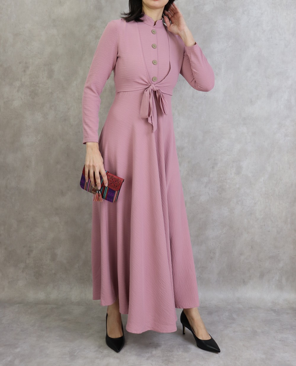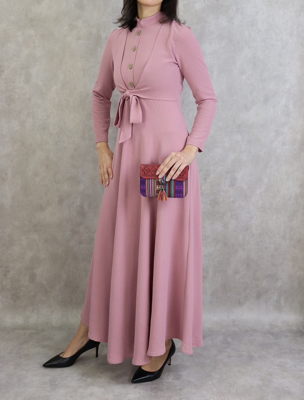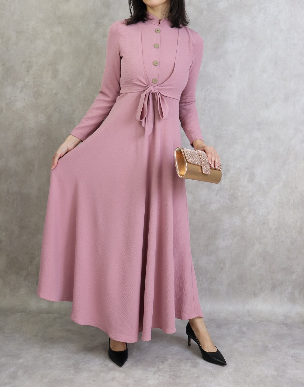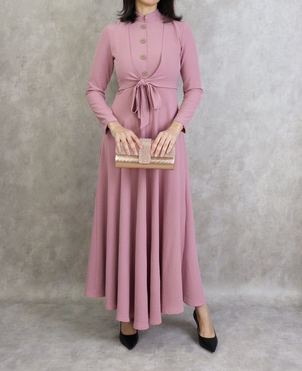 Robe longue, col mao, fermeture bouton + zip au dos, 2 pans de tissu à nouer sur le devant, décoration boutons, taille cintrée, bas evasée, tissu fluide et opaque.