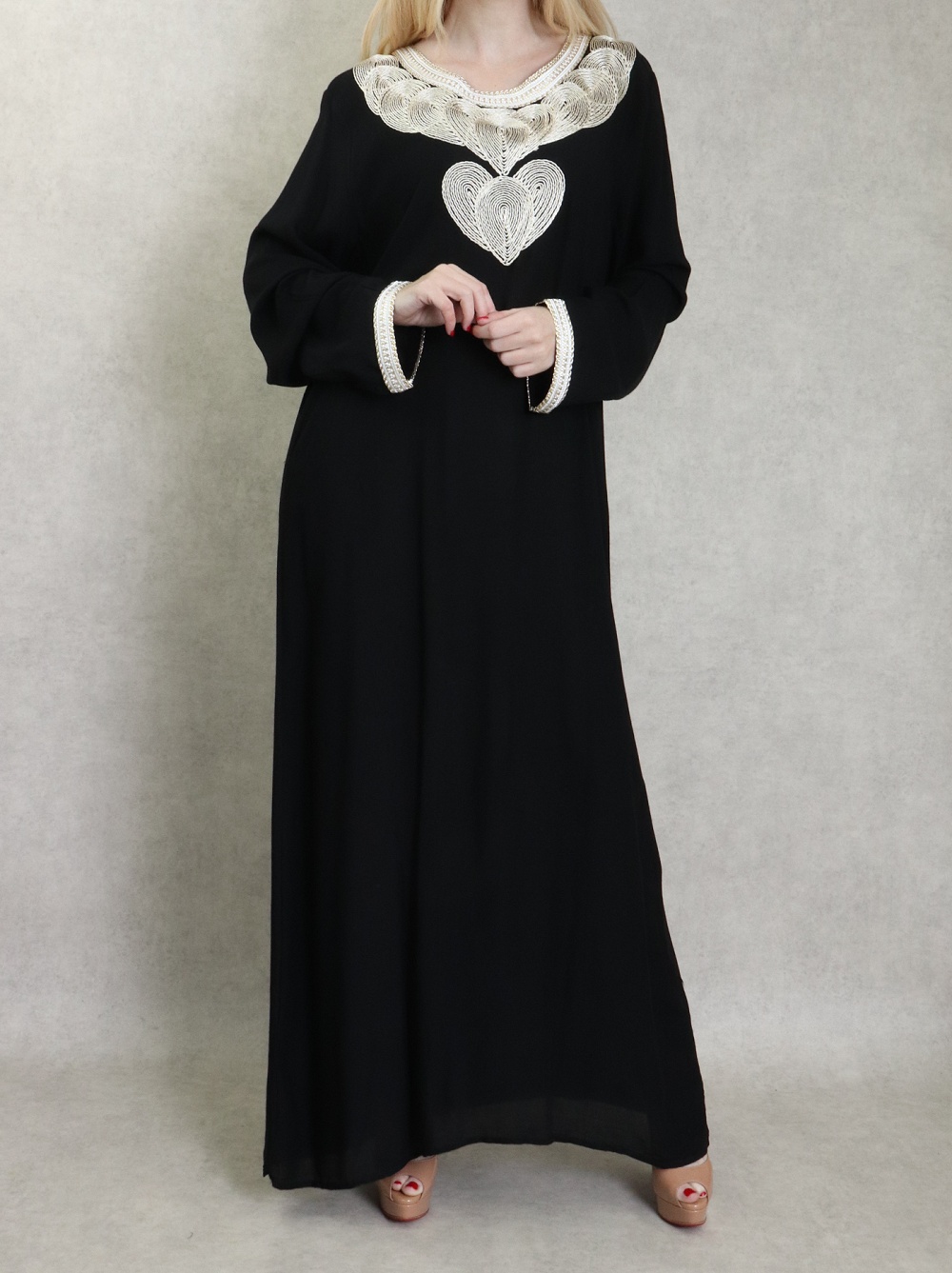Robe longue style oriental avec borderie originale sous forme de coeur pour femme - Couleur noir