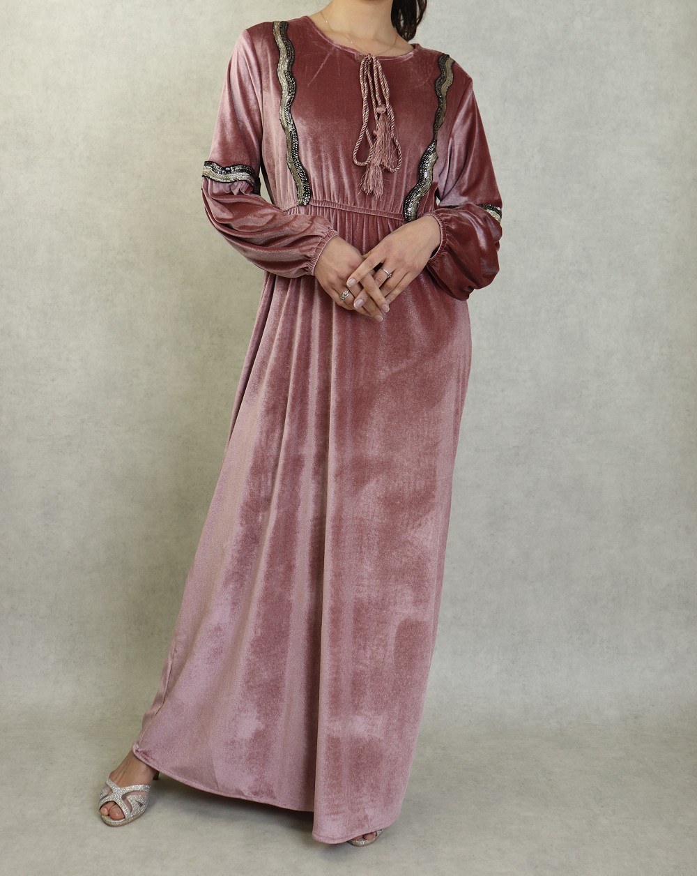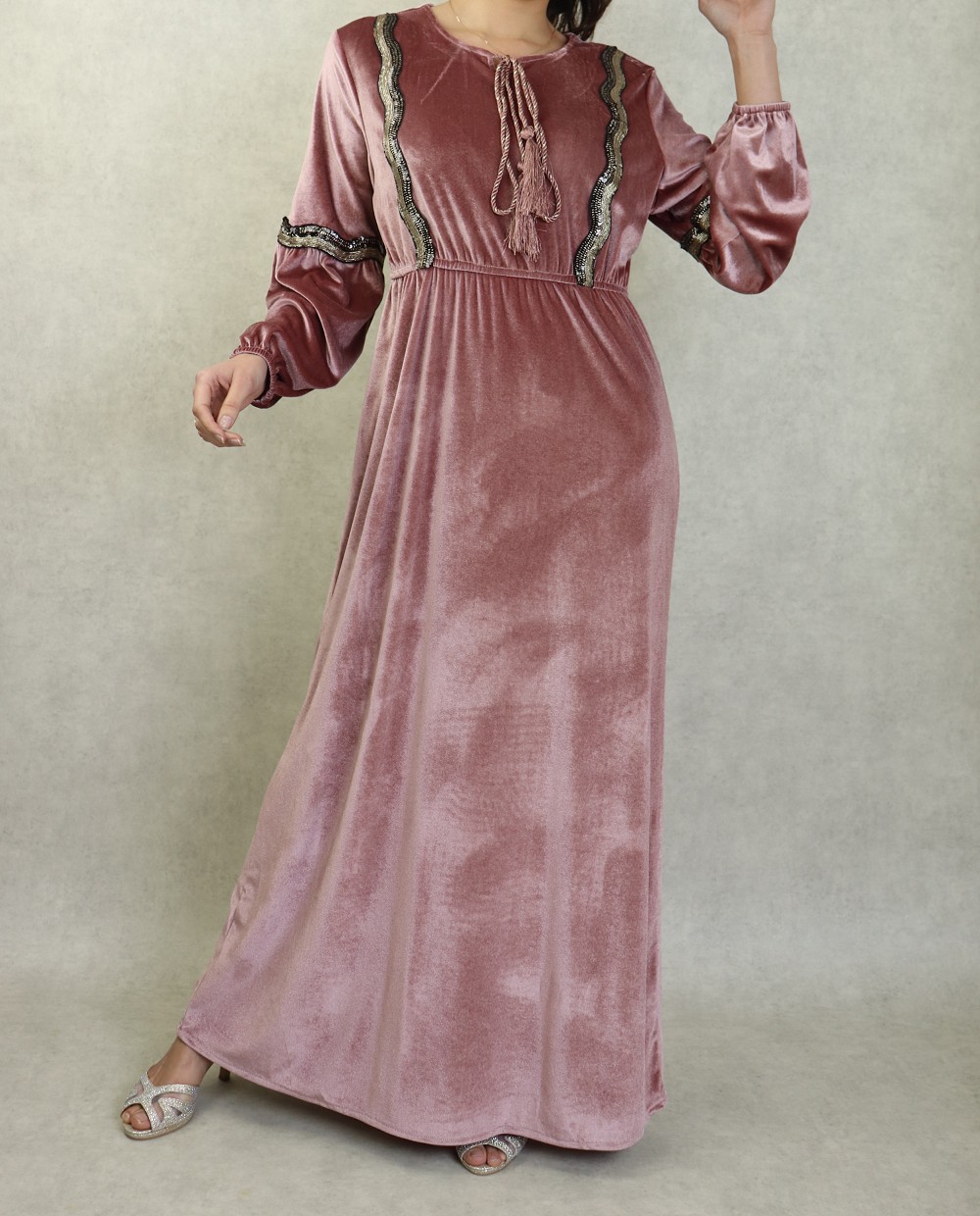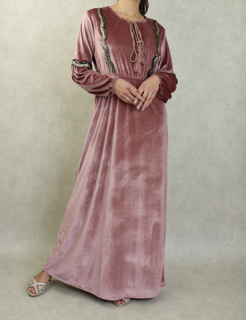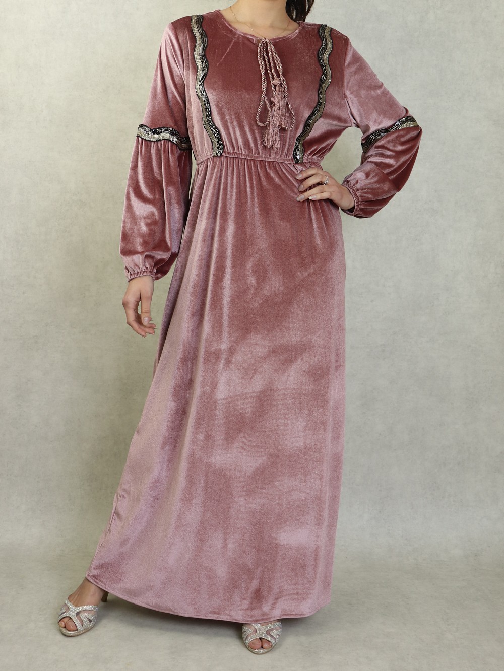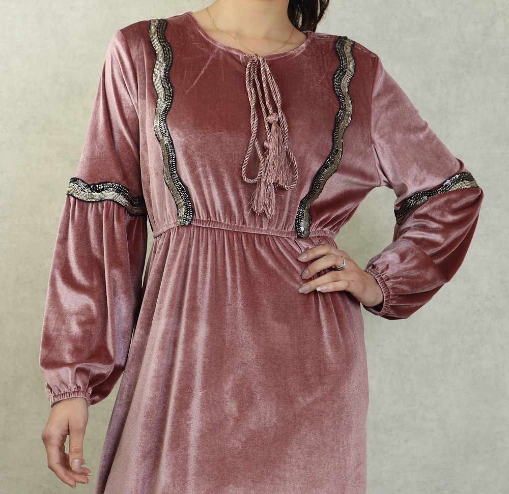 Robe longue style oriental en velours avec broderie et paillette pour femme - Couleur Vieux rose Vetement & Accessoire