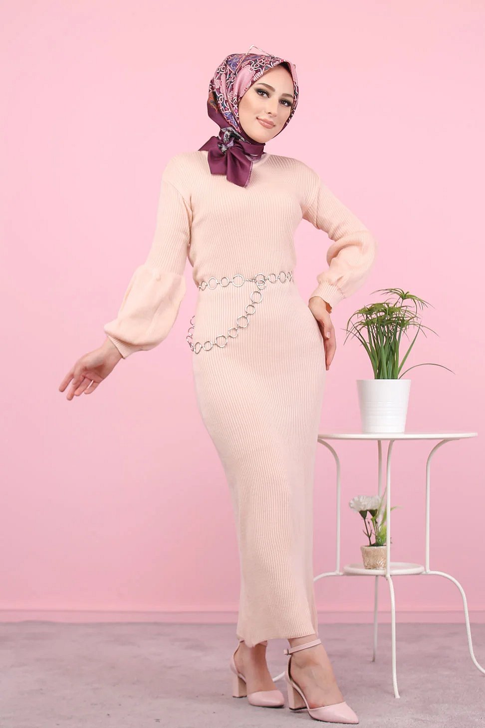 Robe longue tricotee pour femme (Mode Musulmane - Automne Hiver) - Couleur rose poudre