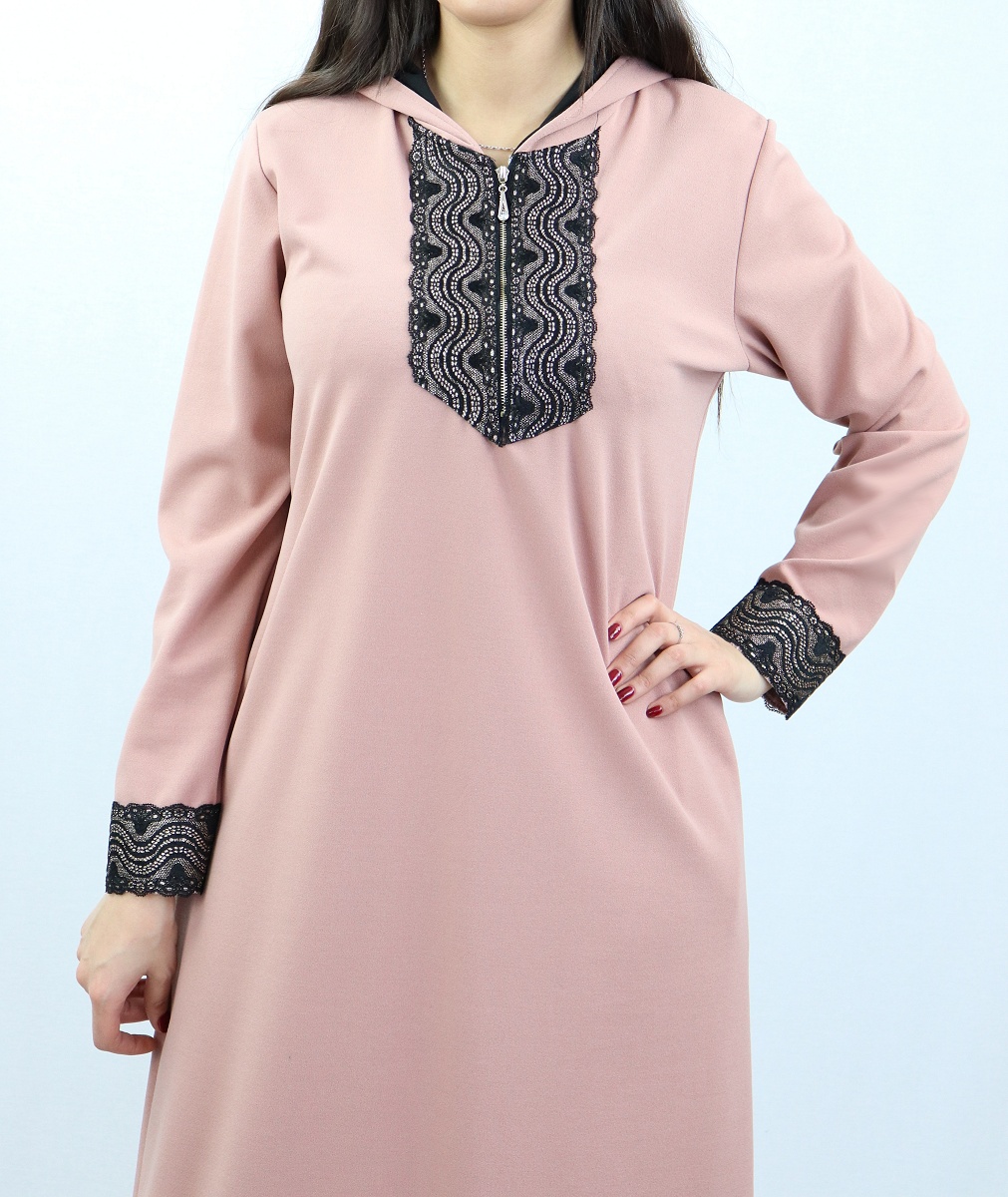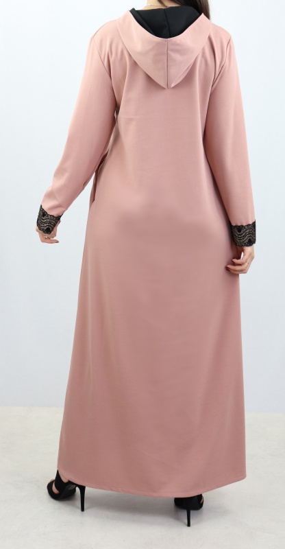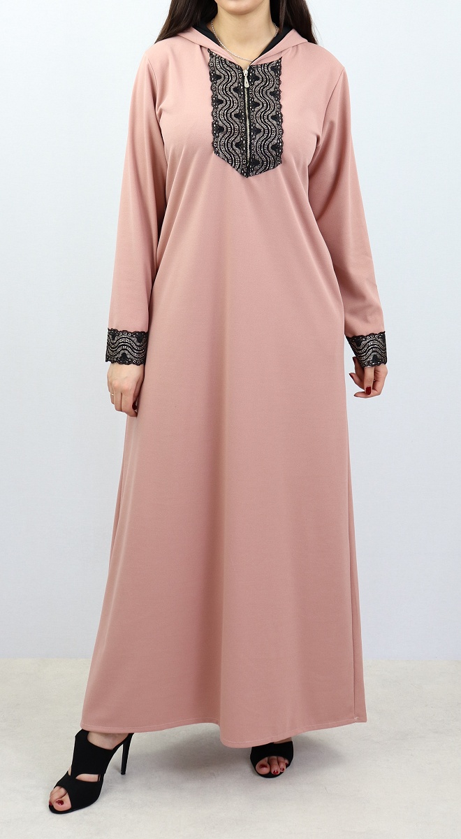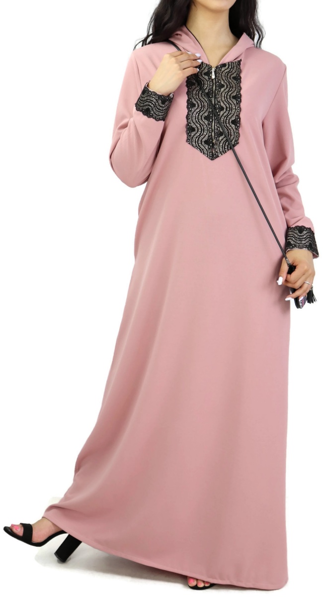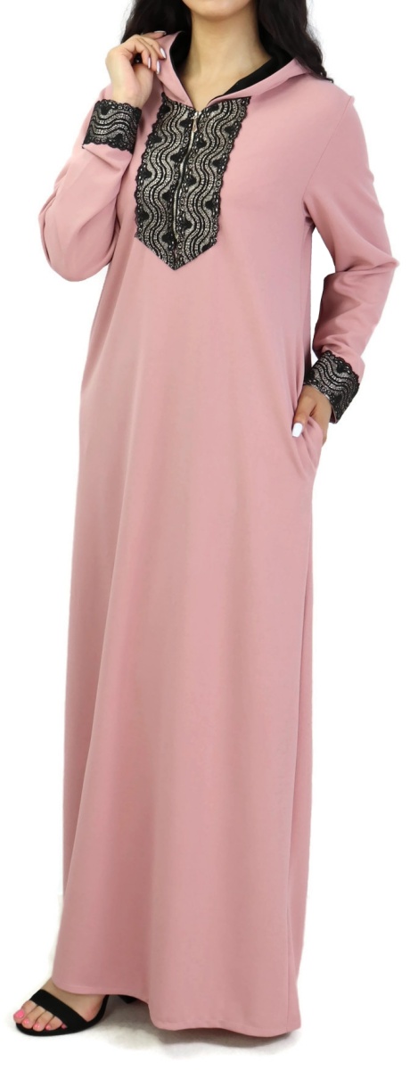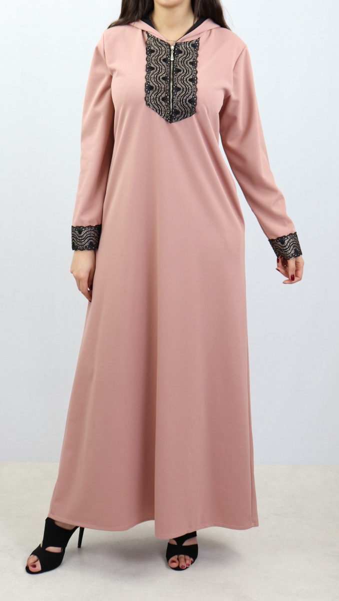 Abaya toute saisons avec capuche et ouverture zip au niveau du cou. Jolis motifs dorés au niveau de la poitrine et des manches, deux poches sur les côtés. Tissu épais (non transparent) et fluide (élastique).