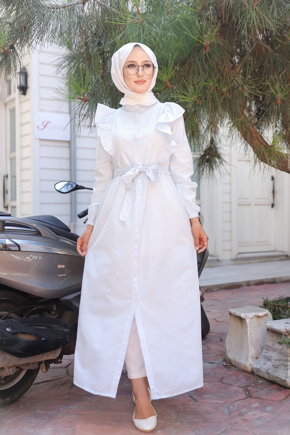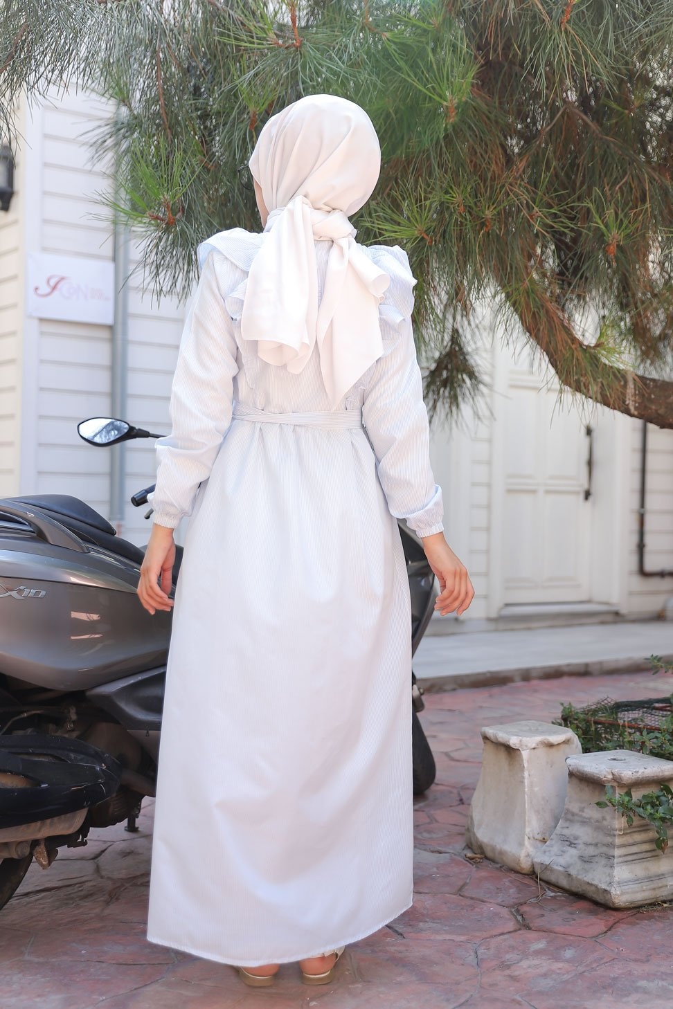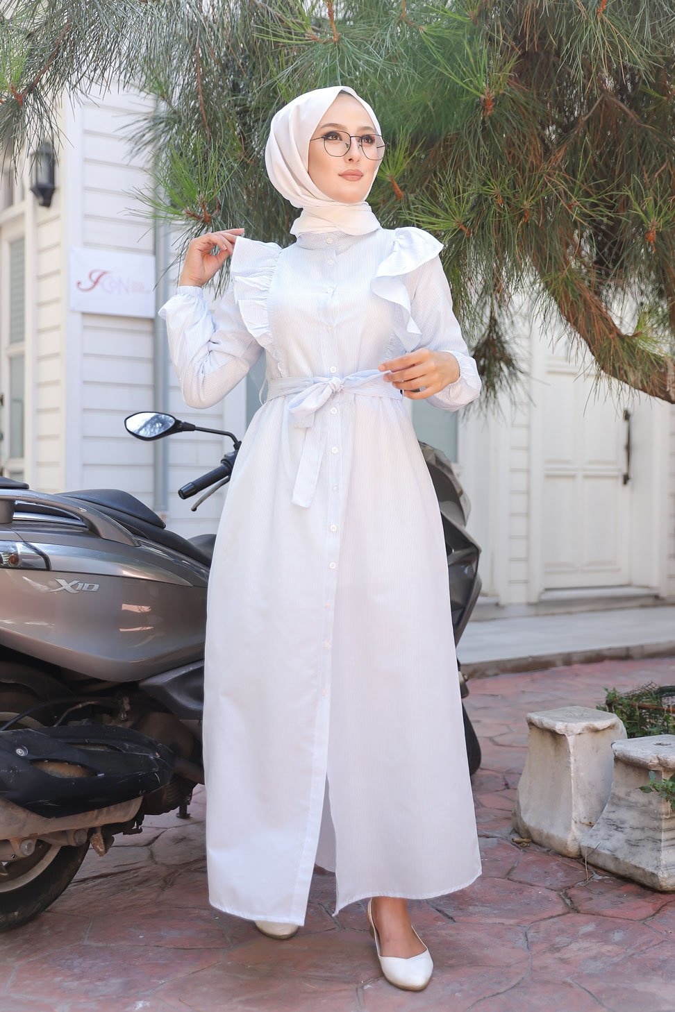 Robe chemise d'été longue à rayures (Vetement hijab chic pour femme) - Couleur blanc et bleu clair - REF. 32893 (25.00 €)