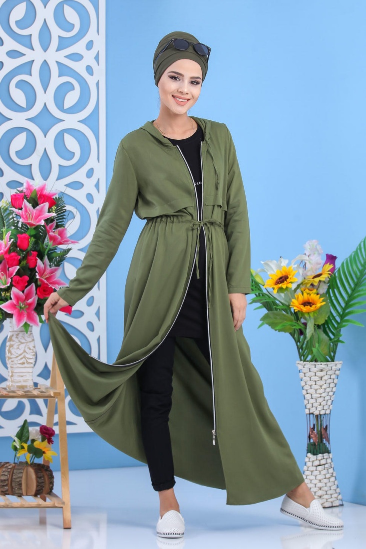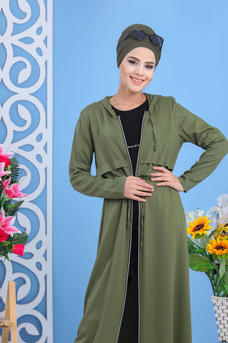 Veste longue bicolore à capuche (Vetement islamique pour femme) - Couleur blanc et kaki - REF. 32780 (29.90 €) - En Promotion à 24.90 €