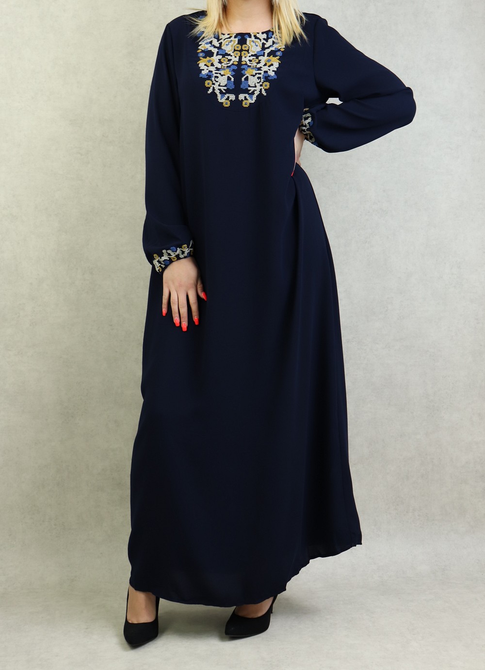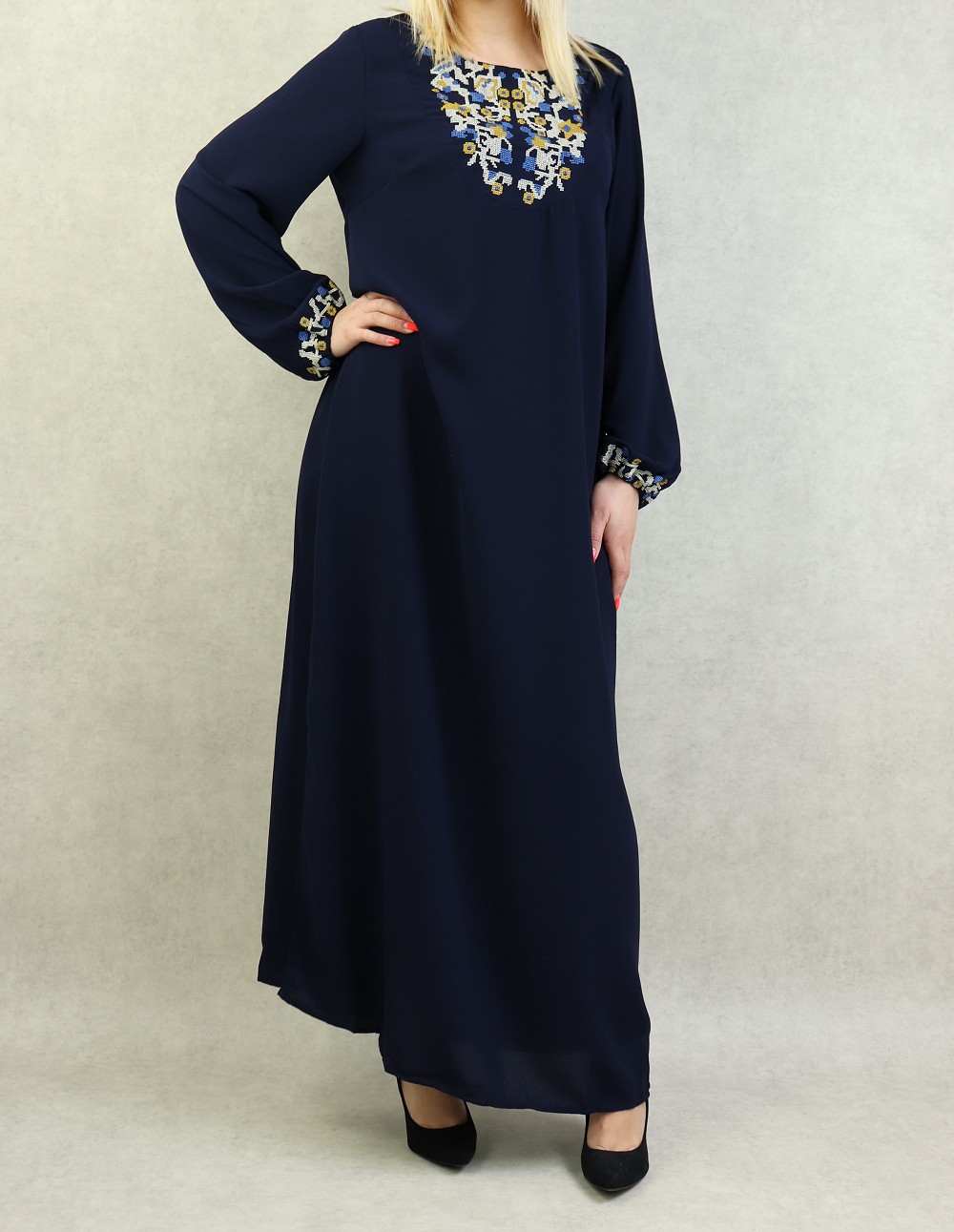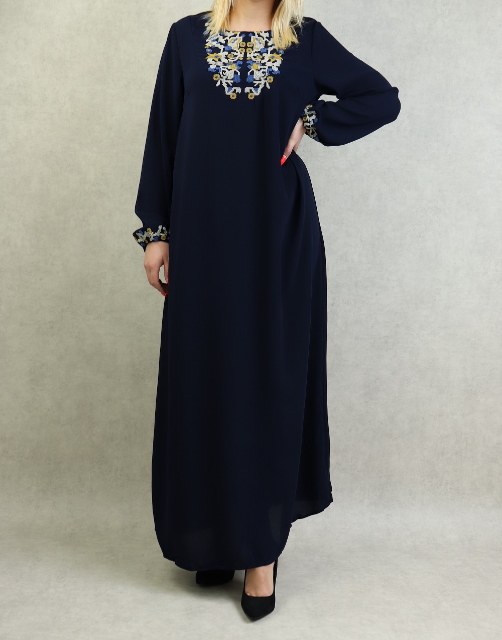 Robe en coton ample style évasé avec broderie discrète pour femme (Vêtement habillé pour hijab) - Couleur bleu indigo - REF. 37506 (35.00 €)