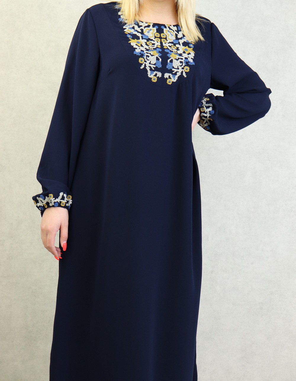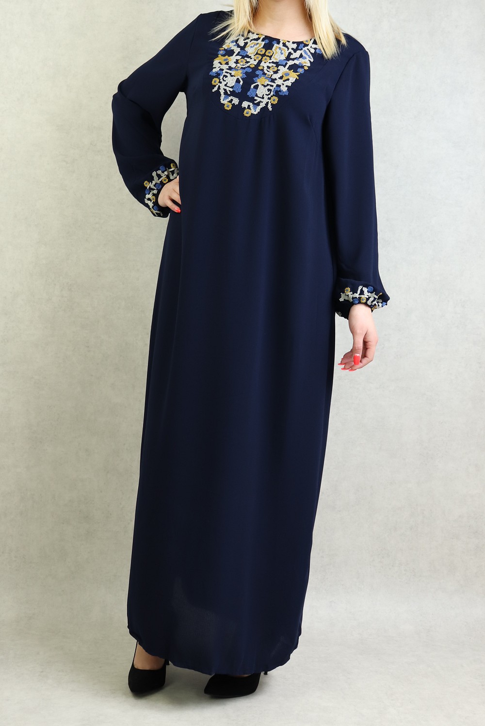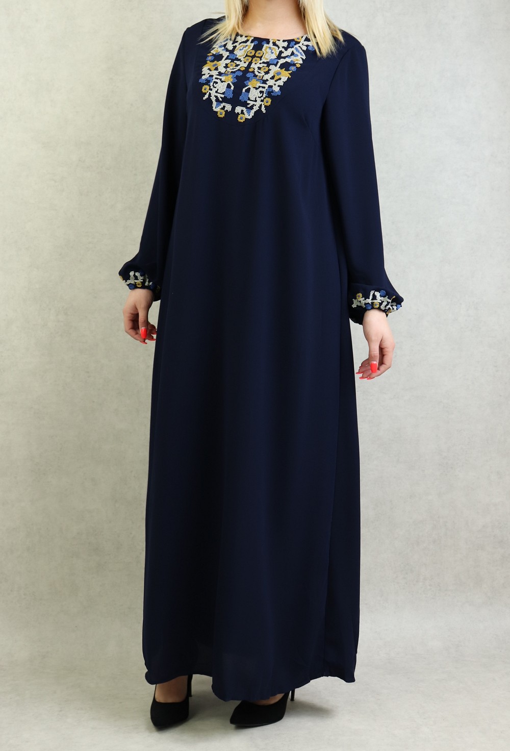 Robe en coton ample style évasé avec broderie discrète pour femme (Vêtement habillé pour hijab) - Couleur bleu indigo - REF. 37506 (35.00 €)