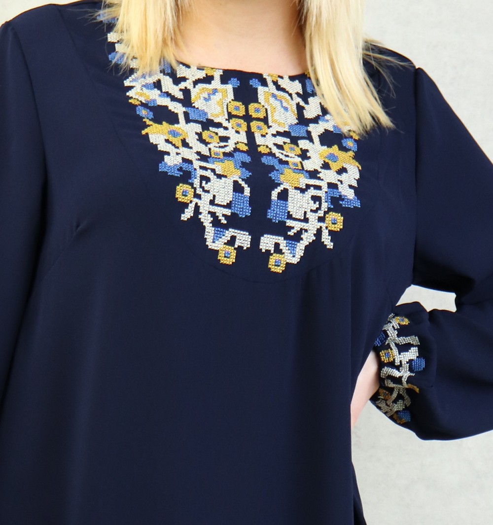 Robe manches longues avec broderie pour femme - Couleur bleu marine