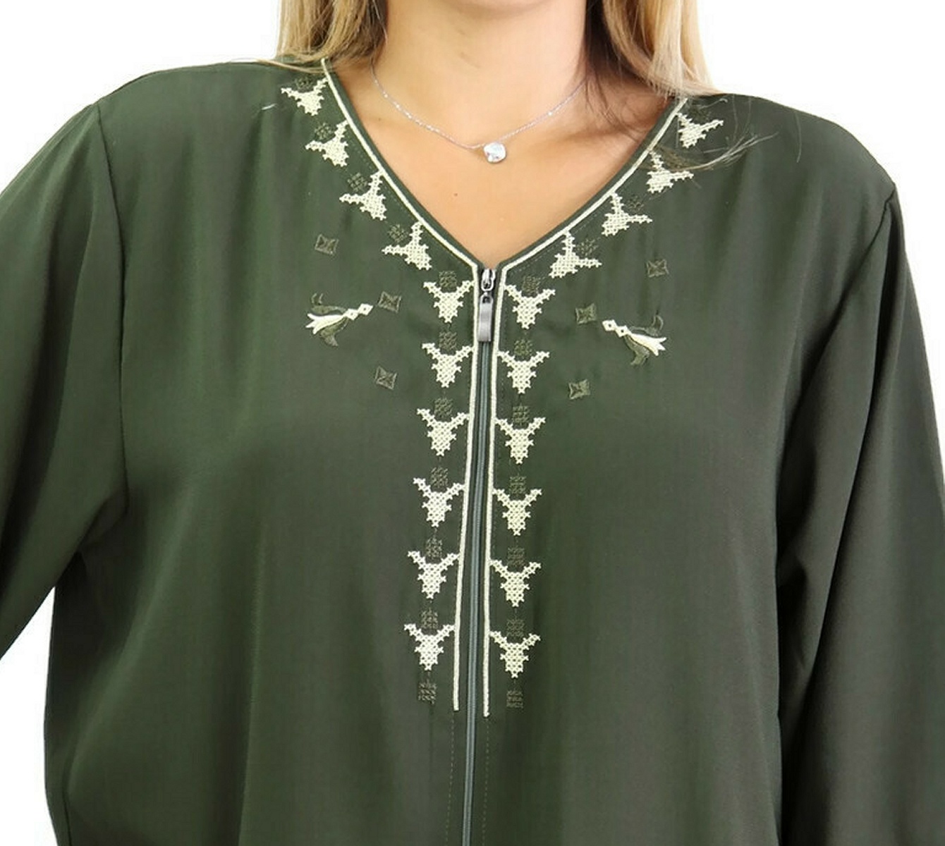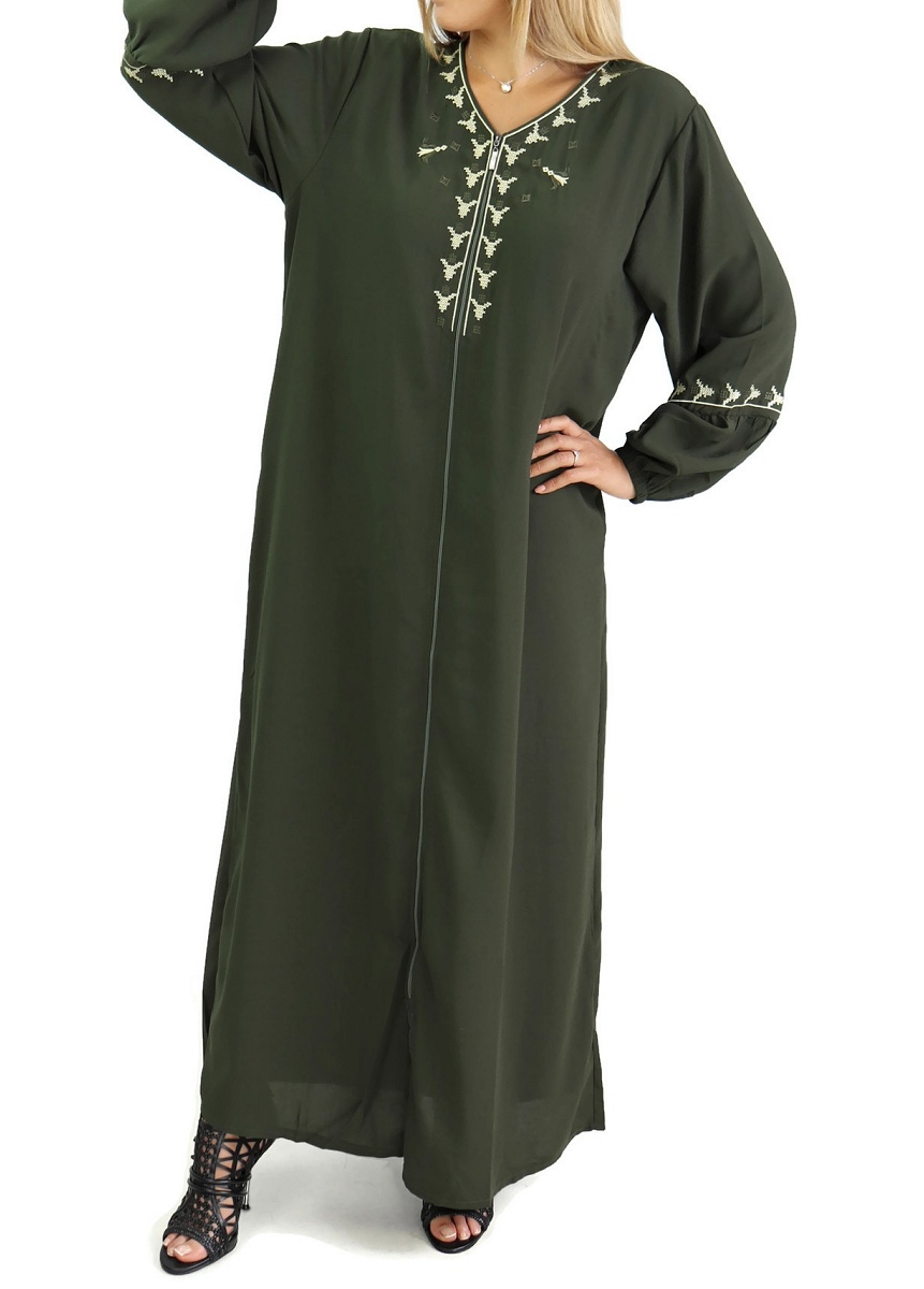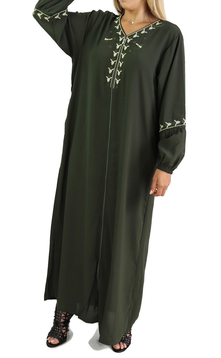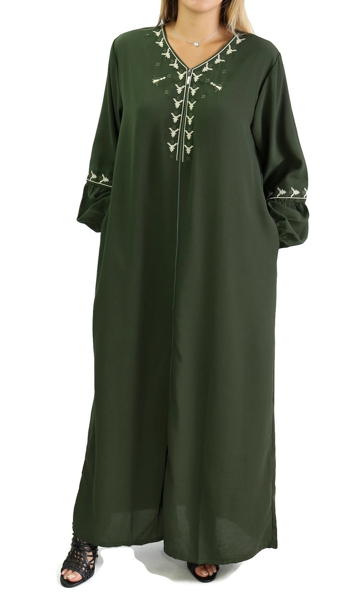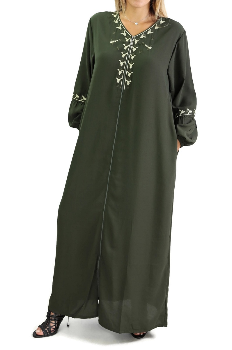 Abaya ouverte sur tout le devant avec fermeture zip. Deux poches sur les côtés. Broderies sur le devant et les manches. Tissu de qualité résistant et non transparent.