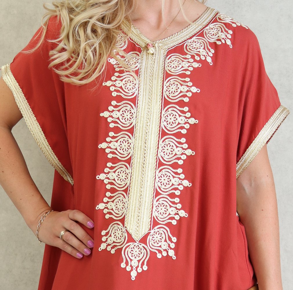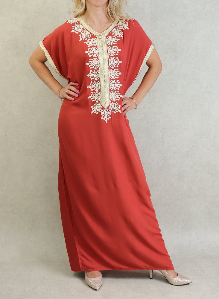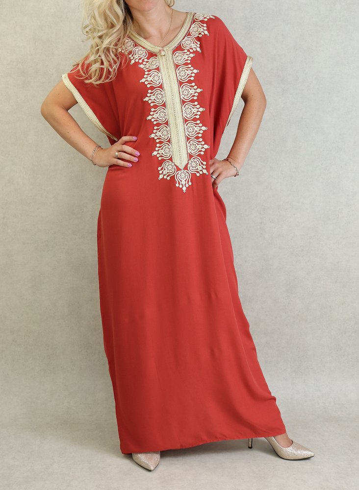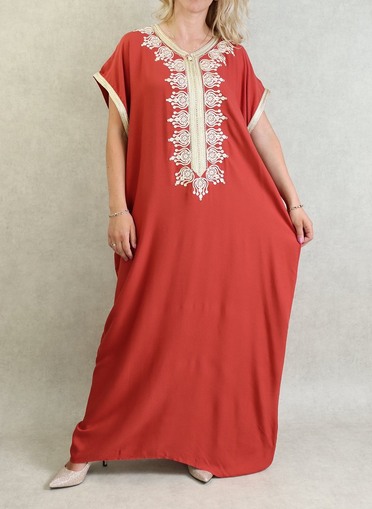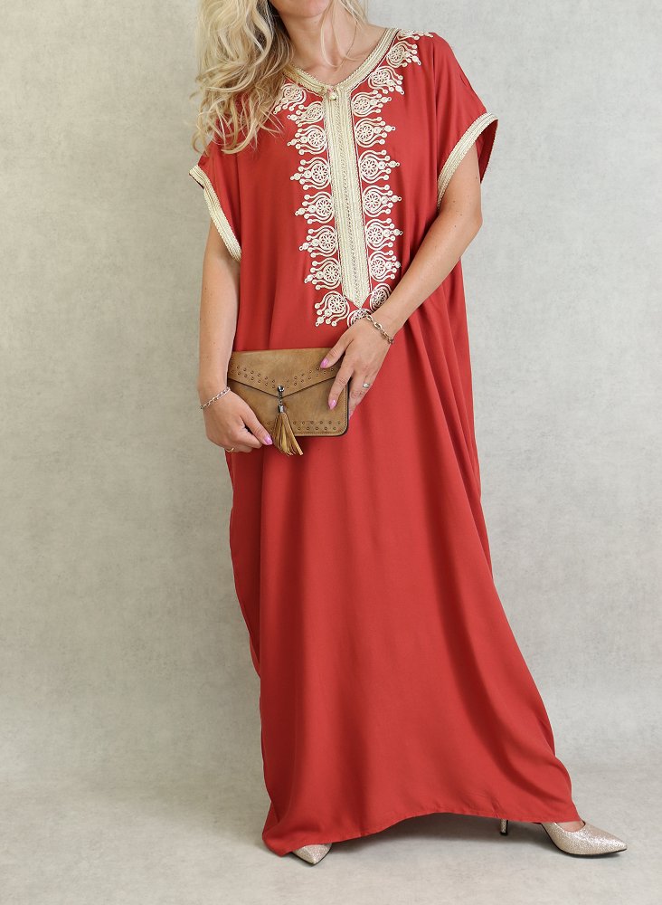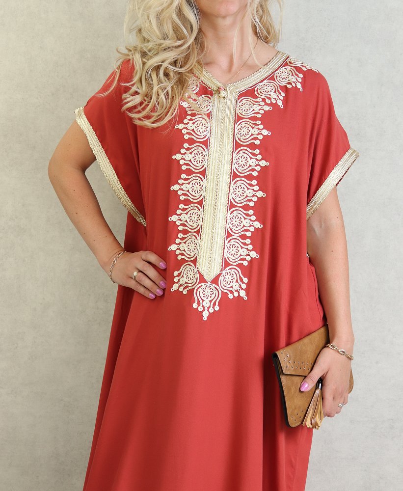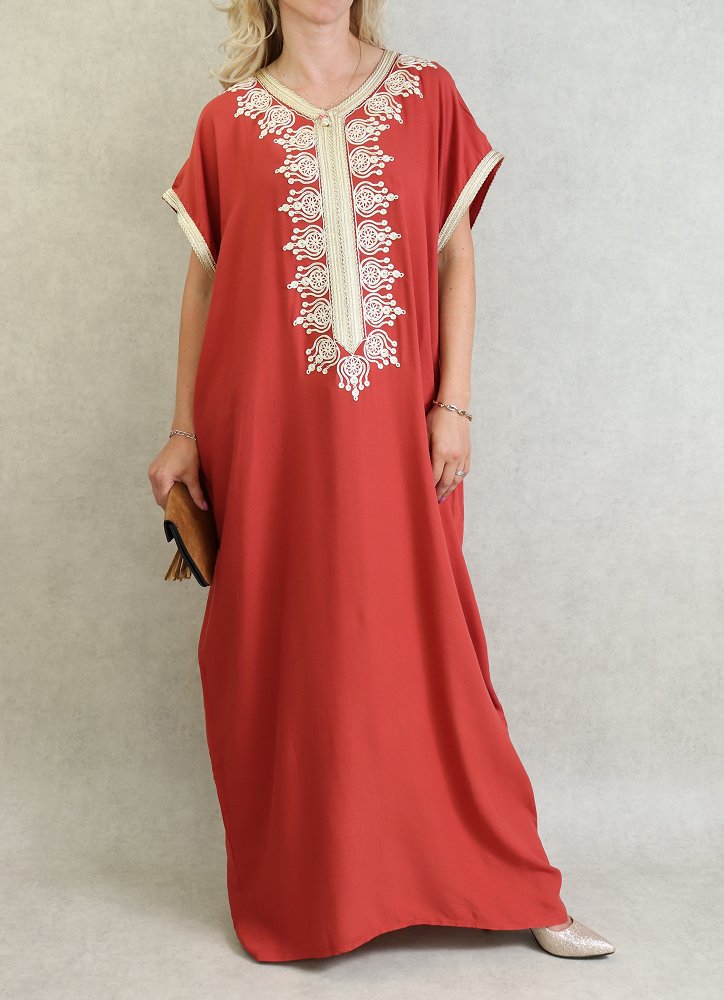 Robe marocaine manches courtes avec broderies - Couleur Rouge Vetement & Accessoire