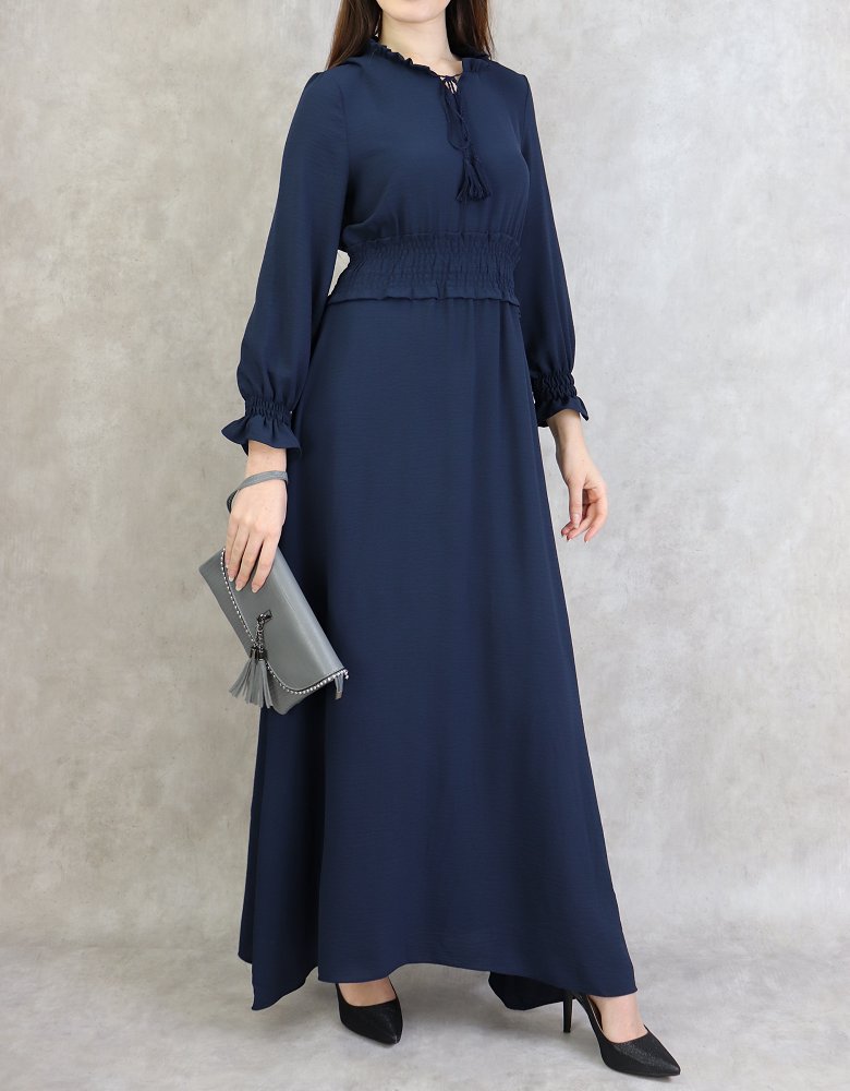 Robe longue, col semi ouvert, fermeture cordons avec pompons, manches finition élastiques, fermeture à glissière sur le coté, taille cintrée et élastique tissu fluide, léger et opaque.
