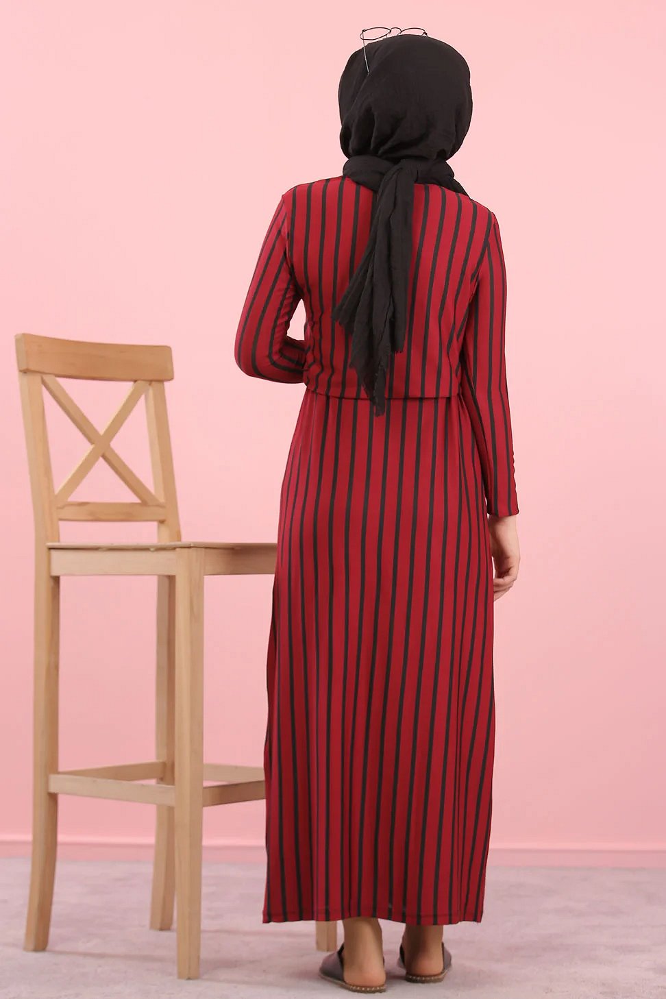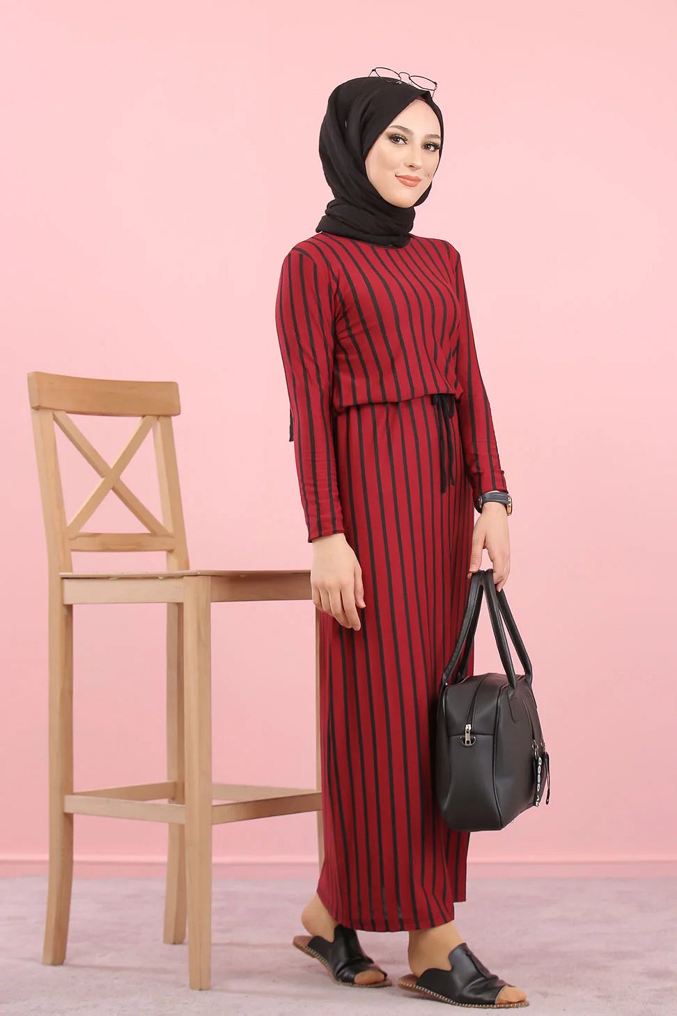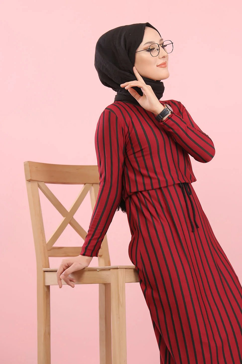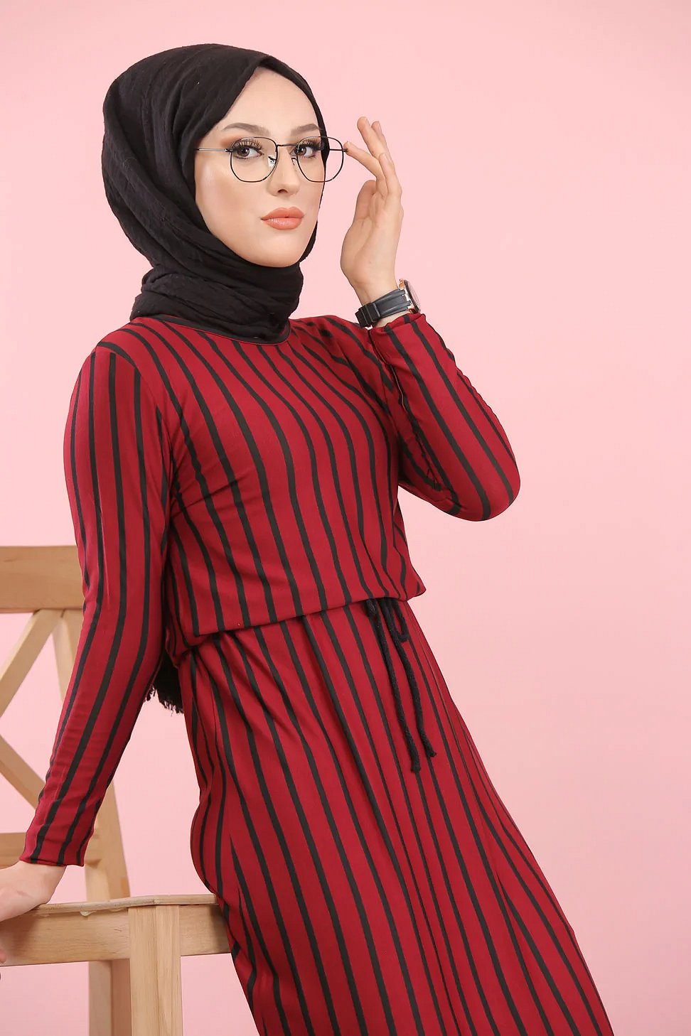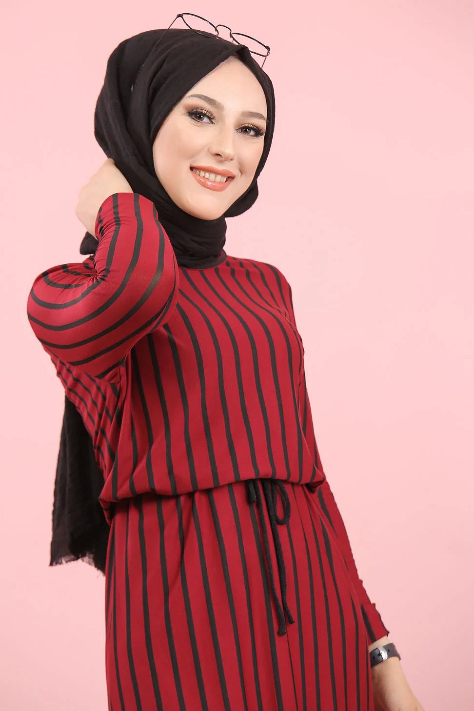 Robe maxi-longue à rayures mode décontracté ceinture intégrée (Vêtement femme voilée) - Couleur bordeaux Vetement & Accessoire
