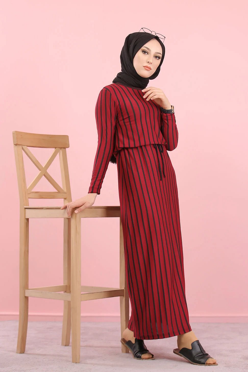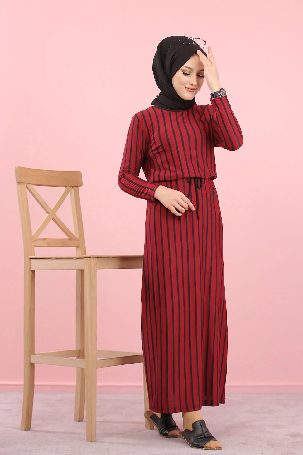 Robe maxi-longue a rayures mode decontracte ceinture integree (Vetement femme voilee) - Couleur bordeaux