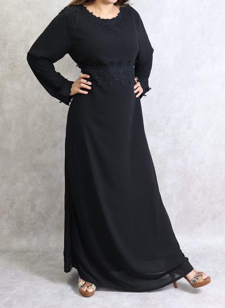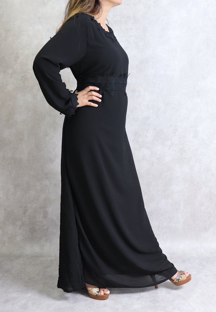 Robe à dentelles et strass sur un col dégagé ainsi que sur la taille et les poignets. Intégralement doublée. 2 liens qui peuvent aussi bien se nouer à l’avant comme à l'arrière afin de faire un effet cintré. Ce modèle sobre et distingué vous conviendra pour différents événements.