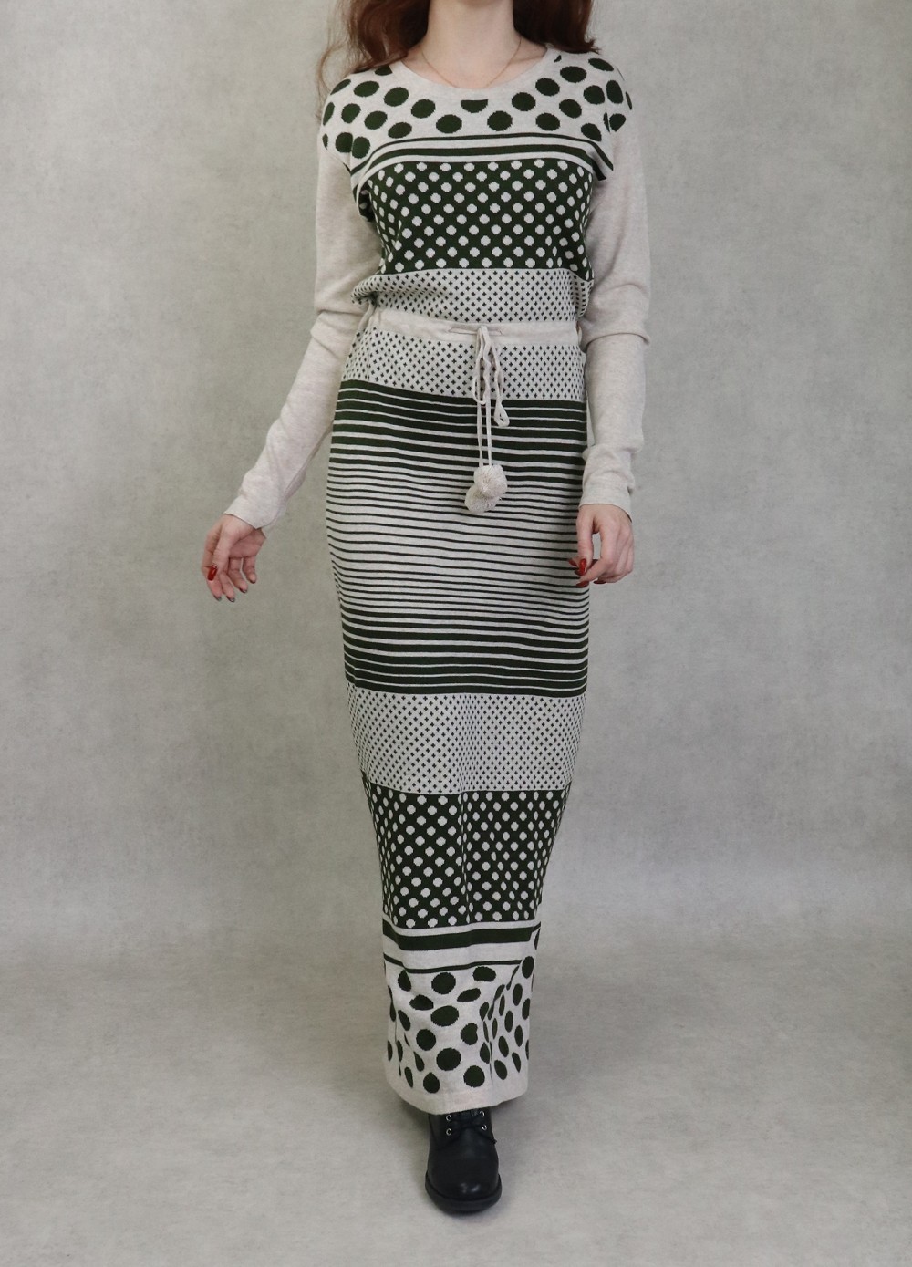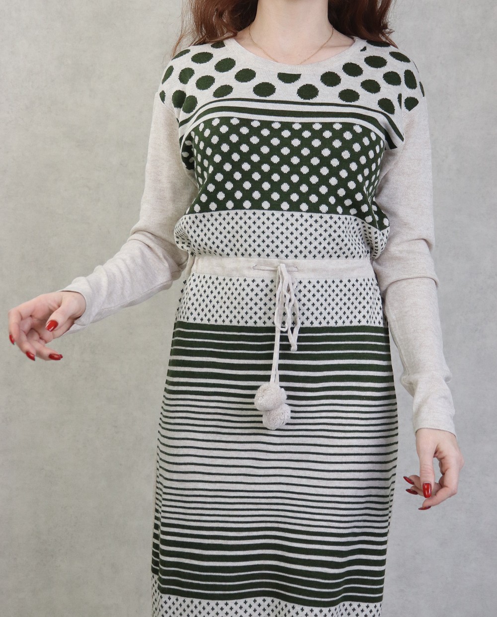 Robe maxi-longue en maille a motifs bicolore pour femme (Mode Automne-Hiver) - Couleur Vert kaki et beige