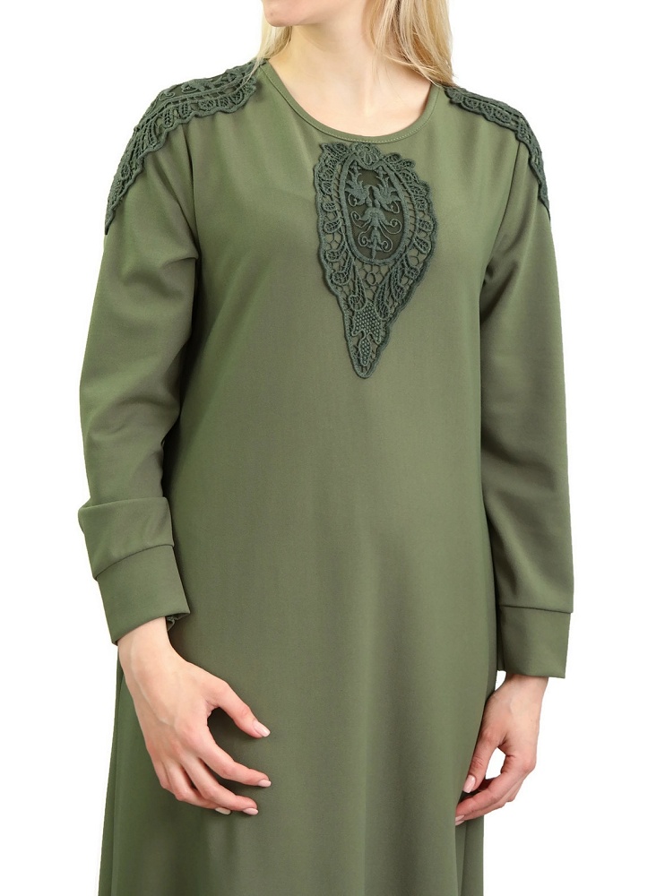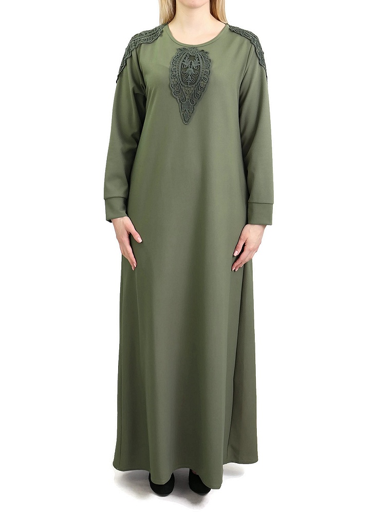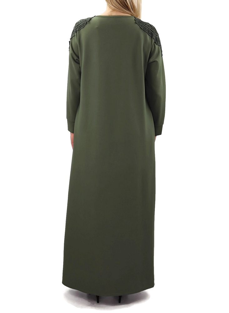 Robe très longue évasée de avec poches et broderies sur l'avant et les épaules. Tissu fluide, élastique et épais (non transparent).