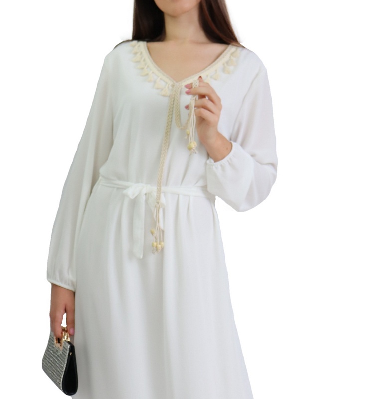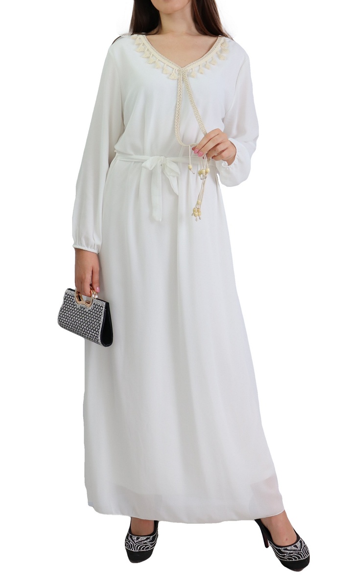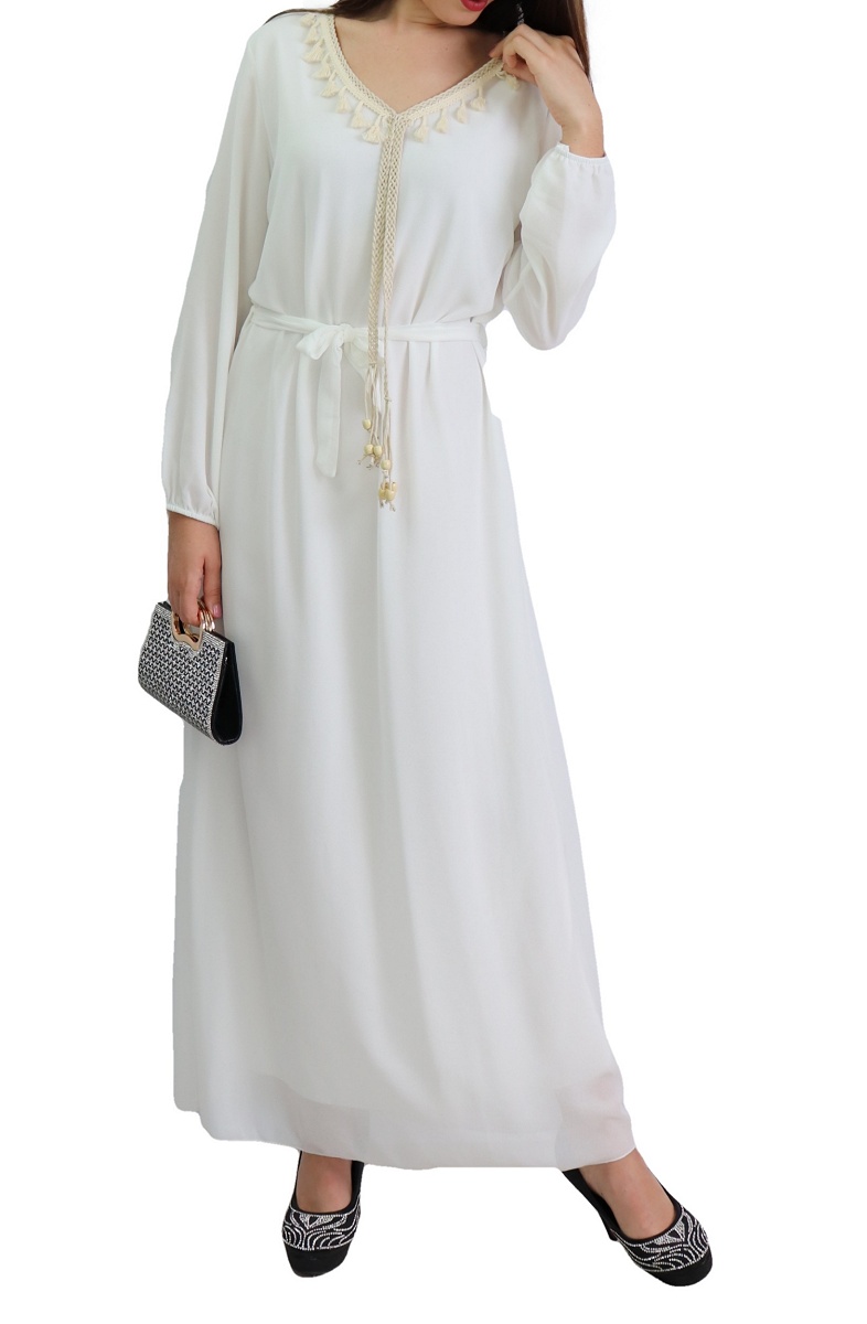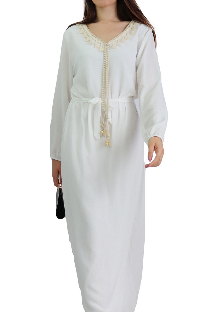 Robe maxi-longue fluide avec cordons à pompons pour femme - Couleur Blanc Vetement & Accessoire