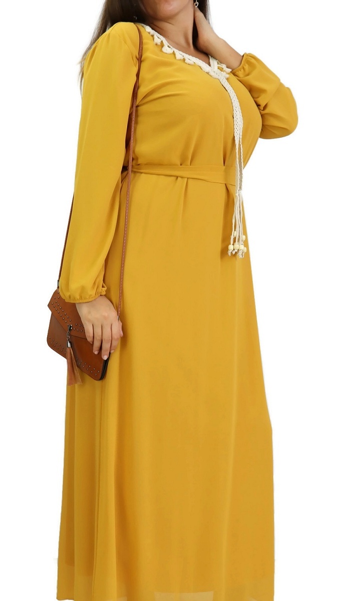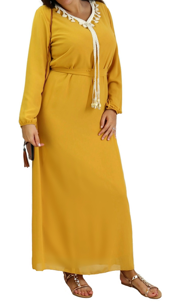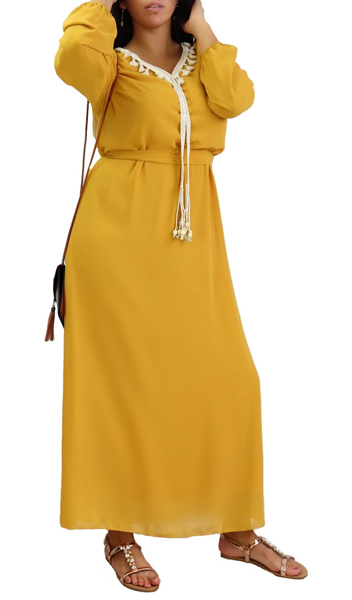 Robe maxi-longue fluide avec cordons à pompons pour femme - Couleur Jaune Moutarde Vetement & Accessoire